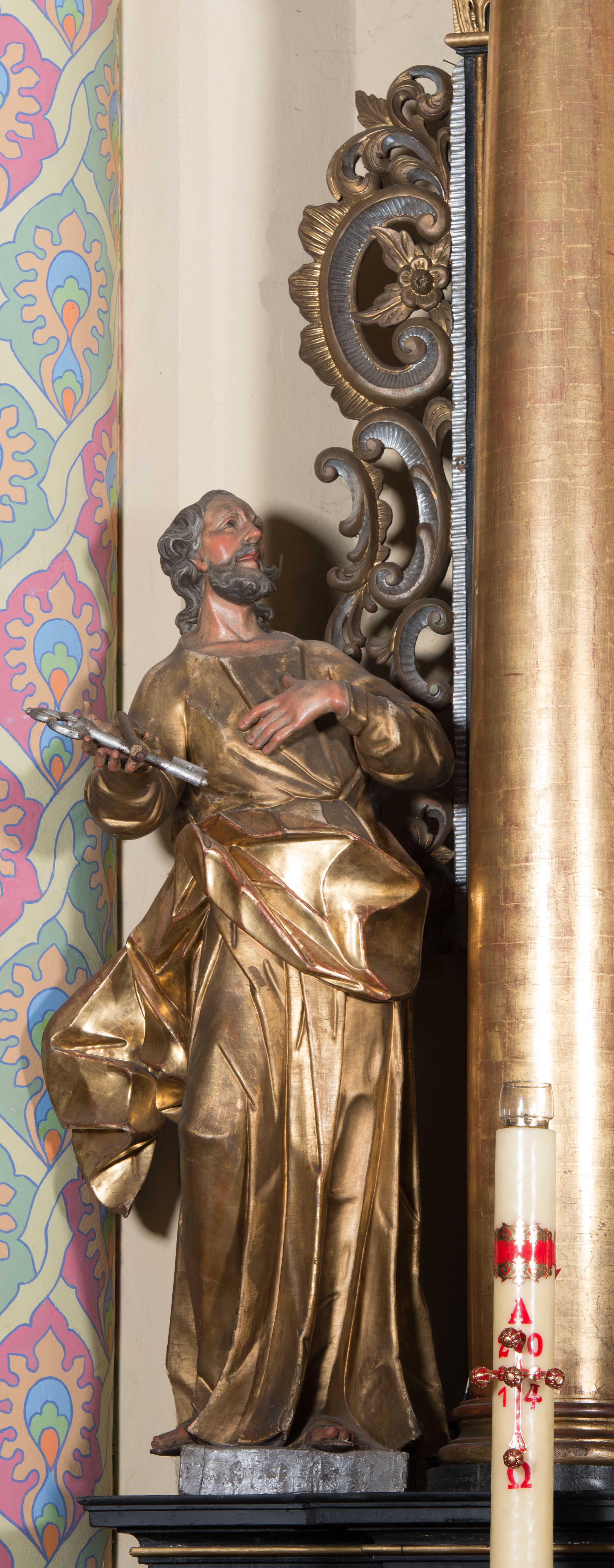 Rzeźba ścięta z tyłu, drążona, ustawiona na prostokątnej podstawie. Figura zwrócona frontalnie, z głową skierowaną w lewo, uniesiona do góry. Ciało ukazane w kontrapoście, przechylone w tył. Święty lewą rękę kładzie na piersi, w prawej wysuniętej do przodu trzyma skrzyżowane klucze. Jego twarz jest ascetyczna o ostrych rysach, głęboko osadzonych oczach o trójkątnych, wysoko uniesionych powiekach, nos ma niewielki, okrągły, a usta delikatnie rozchylone z widocznym podniebieniem. Twarz okolona krótką brodą, układającą się w dwa pukle. Włosy kręcone, głęboko rzeźbione, opadające na tył szyi. Święty jest ubrany w tunikę o wąskich drapowanych rękawach, ściśle przylegającą do ciała w partii torsu oraz obficie drapowaną i delikatnie łamaną w dolnej części. Płaszcz przewiązany przez biodra z rozwianym zwisem na prawym boku. Polichromia naturalistyczna w odsłoniętych partiach ciała, szaty złocone, klucze srebrzone.