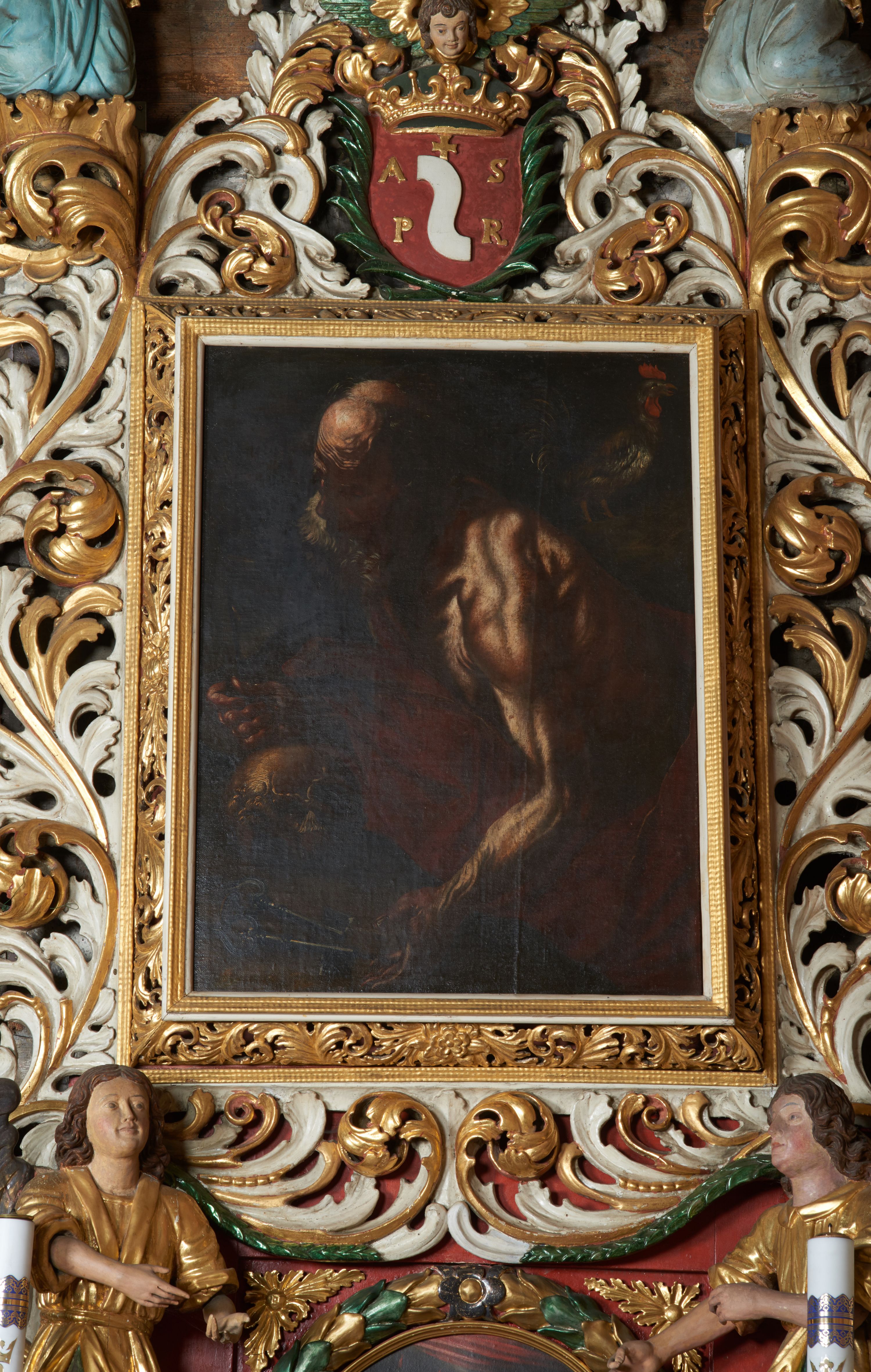 Obraz w kształcie stojącego prostokąta z przedstawieniem św. Piotra. Święty ukazany w centrum kompozycji, w półpostaci, z lewego półprofilu, w dynamicznej pozie, z głową delikatnie przechyloną na lewe ramię, z krzyżem w prawej dłoni, z lewą wyciągniętą do dwóch kluczy leżących na skale obok czaszki. Święty ubrany w czerwony płaszcz odsłaniający nagi tors o silnie podkreślonej muskulaturze. Twarz okolona siwą, długą i bujną brodą; czoło wysokie, pokryte zmarszczkami; na głowie łysina. W górnym, prawym narożu obrazu kogut ukazany z lewego profilu. Tło jednolite, ciemne. Kolorystyka ciemna z przewagą brązów, światłocieniowy modelunek postaci.