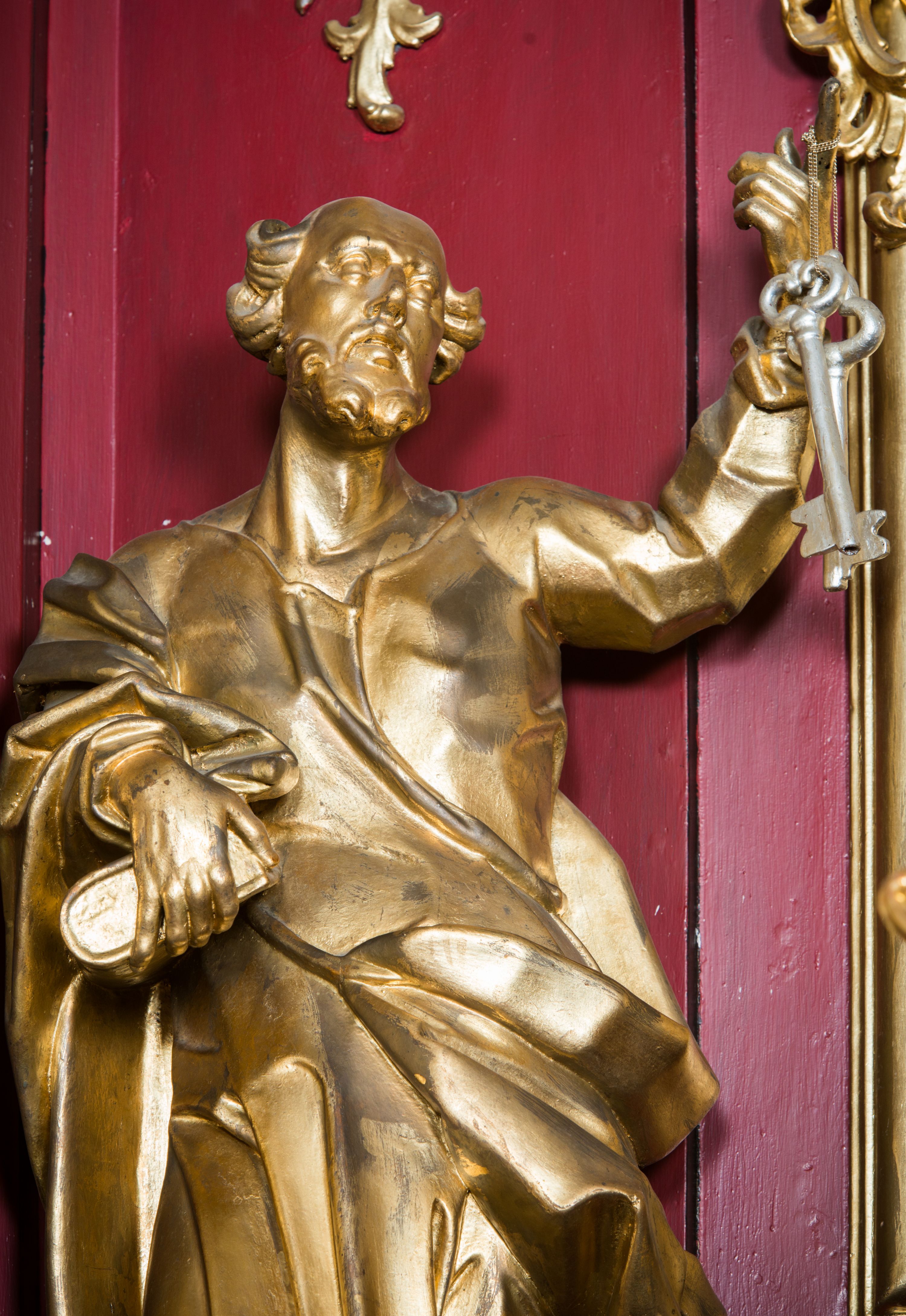 Rzeźba ścięta z tyłu i drążona, ustawiona na niskiej podstawie. Święty zwrócony frontalnie, z uniesioną głową skierowaną w lewo, w kontrapoście. Prawą ręką przytrzymuje na biodrze księgę, lewą unosi do góry w geście wskazującym dłoni, na której ma zawieszona dwa klucze. Twarz ma szczupłą, pociągłą, z wysokim czołem, oczy okrągłe, wyłupiaste, głęboko osadzone, nos garbaty, usta pełne i rozchylone. Twarz okolona krótką, gęstą brodą, włosy skręcone w pojedyncze pukle po bokach głowy, na jej czubku łysina. Święty ubrany jest w tunikę, ściśle przylegającą do ciała, marszczoną i łamaną, przepasaną w talii oraz płaszcz przerzucony przez prawe przedramię, wywinięty na lewym boku i podwieszony na prawym. Figura w całości złocona, klucze srebrzone.