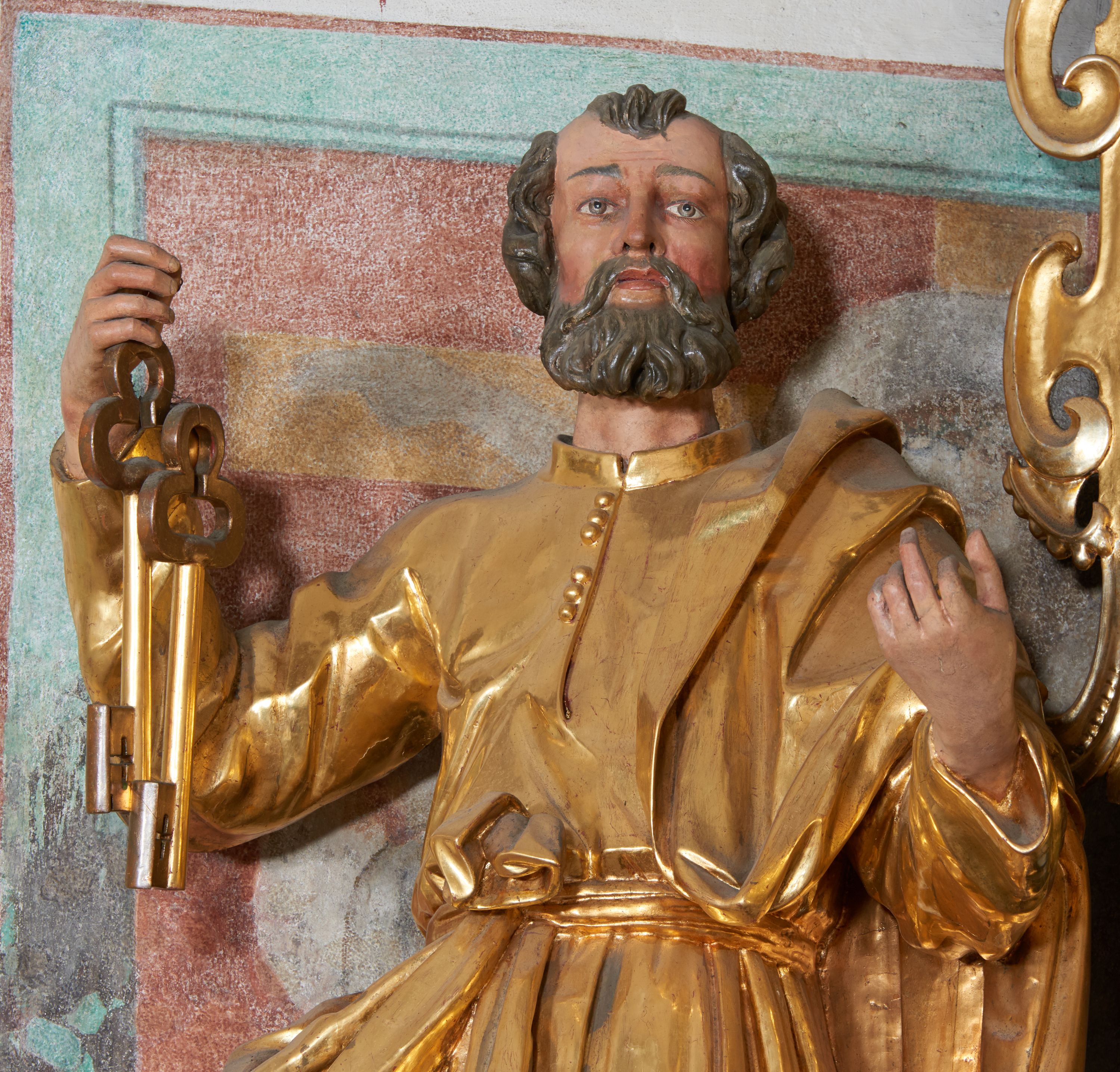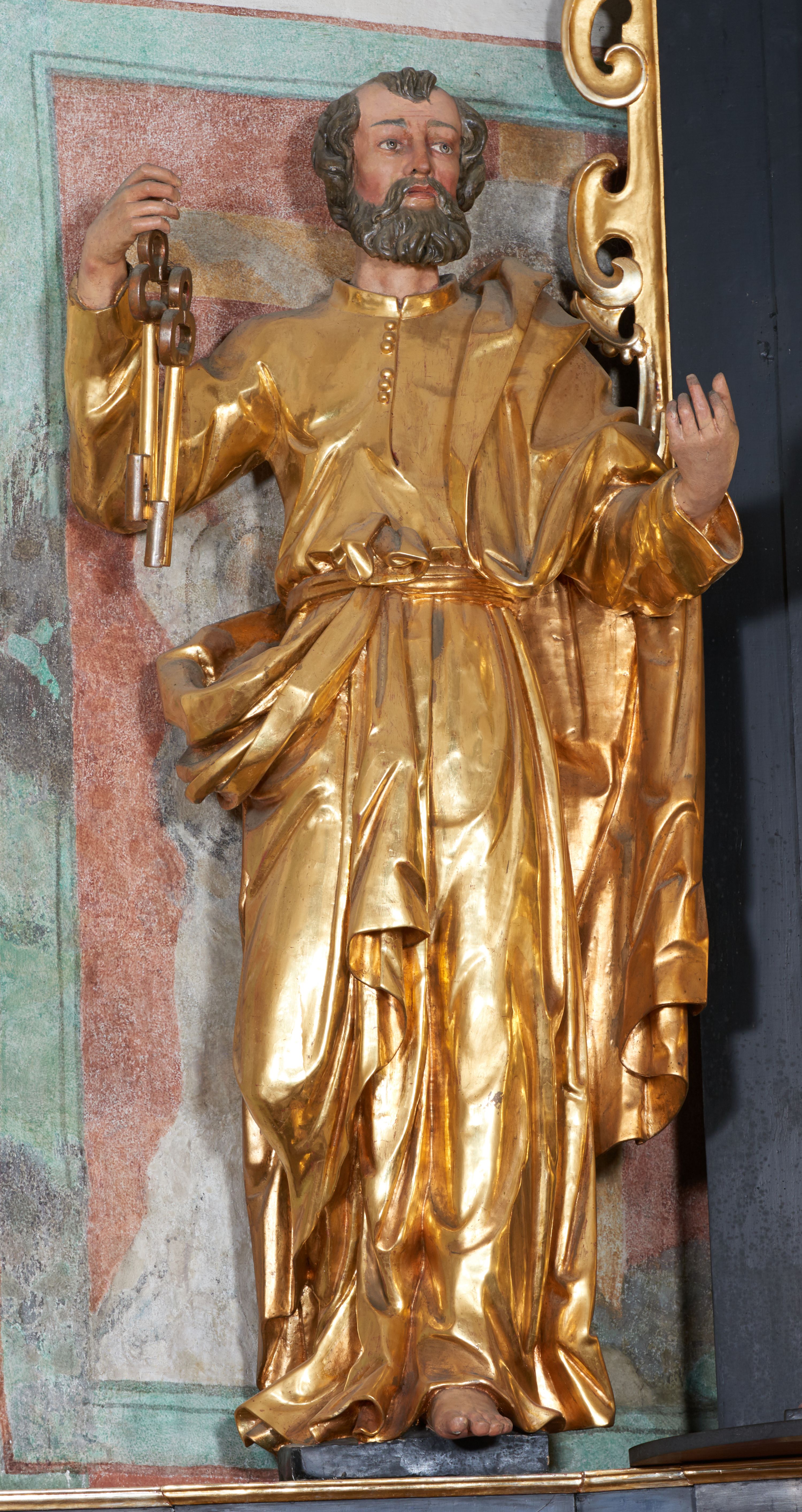 Siedemnastowieczna figura św. Piotra została wykonana wraz z ołtarzem, w którym się znajduje. Stanowi parę do znajdującej się po przeciwnej stronie postaci św. Pawła. Obie rzeźby charakteryzują się uspokojoną formą, ożywioną jedynie gęstymi fałdami przylegających ściśle do ciała szat.