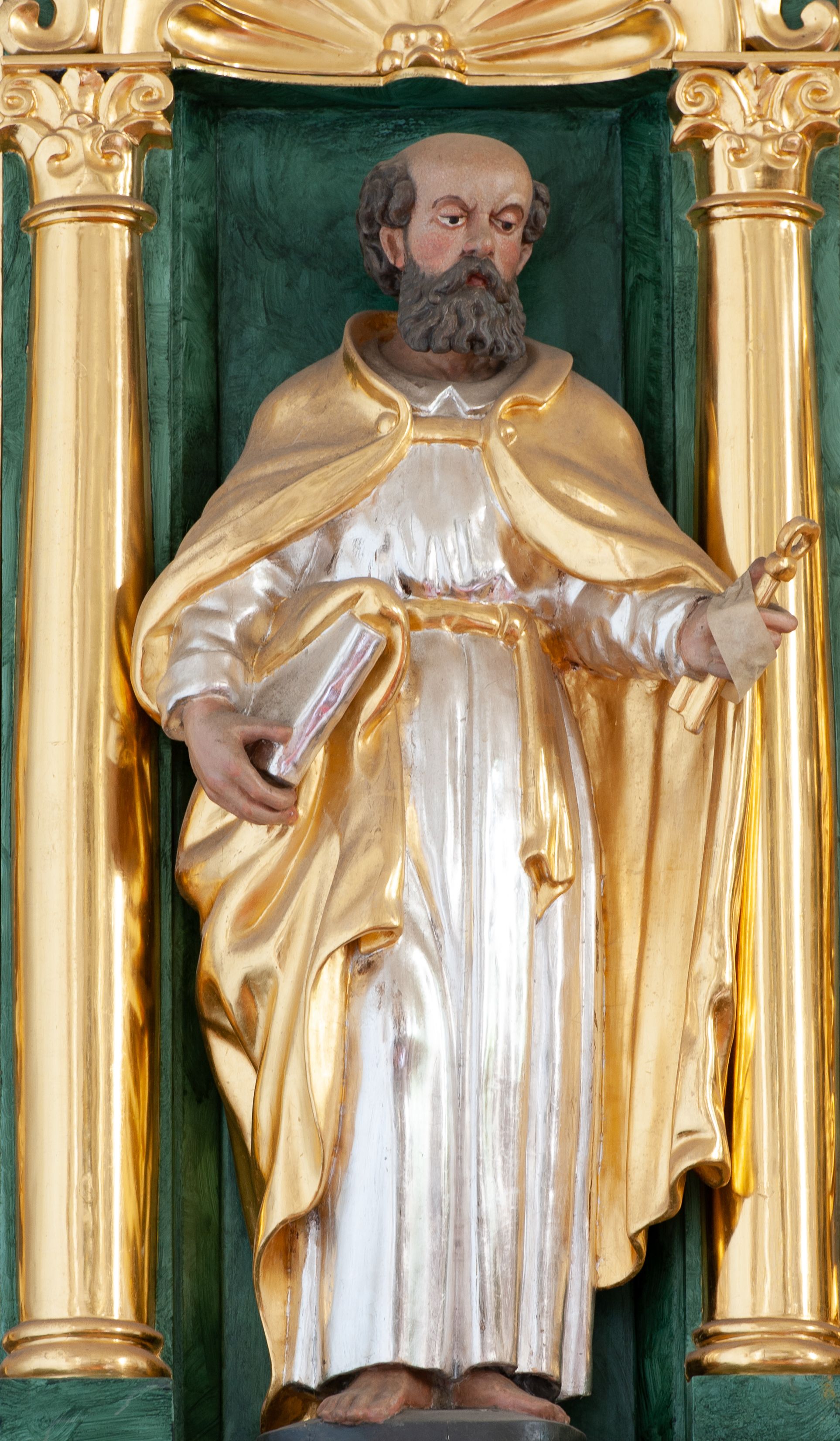 Figura ścięta z tyłu, ustawiona na niskiej podstawie. Święty ukazany frontalnie, z głową skierowaną w lewo, w kontrapoście. W lewej, uniesionej ręce trzyma klucze, w prawej, opuszczonej przy boku księgę. Twarz ma kwadratową, o okrągłych, półprzymkniętych oczach oraz uniesionych i zmarszczonych brwiach, dużym, krótkim nosie i małych ustach, okoloną falowaną brodą oraz krótkimi kręconymi włosami, z łysiną na głowie. Ubrany jest w srebrzoną tunikę z kołnierzykiem, przepasaną w talii złoconą szarfą oraz złocony płaszcz narzucony na ramiona. Polichromia ciała naturalistyczna.