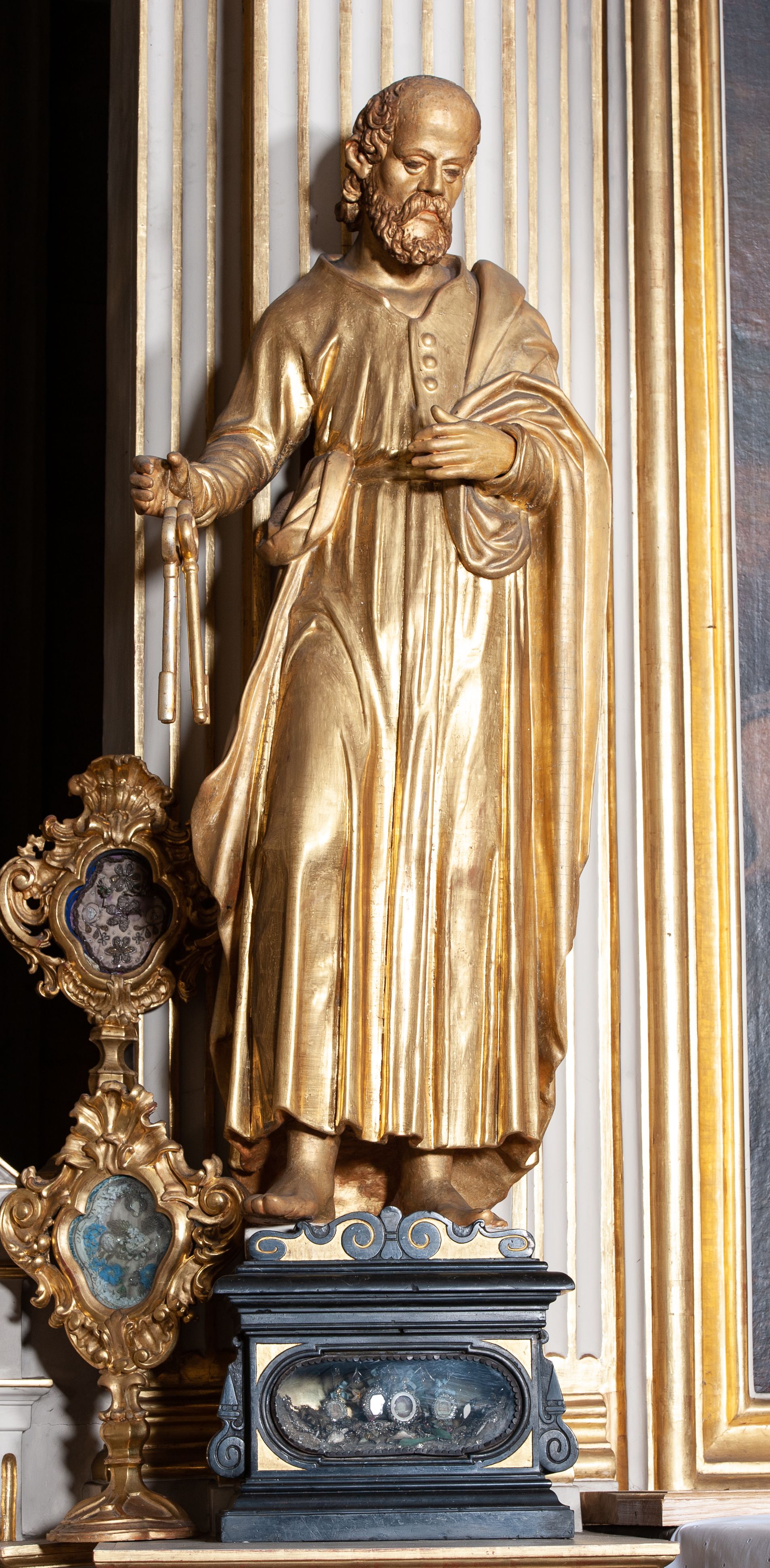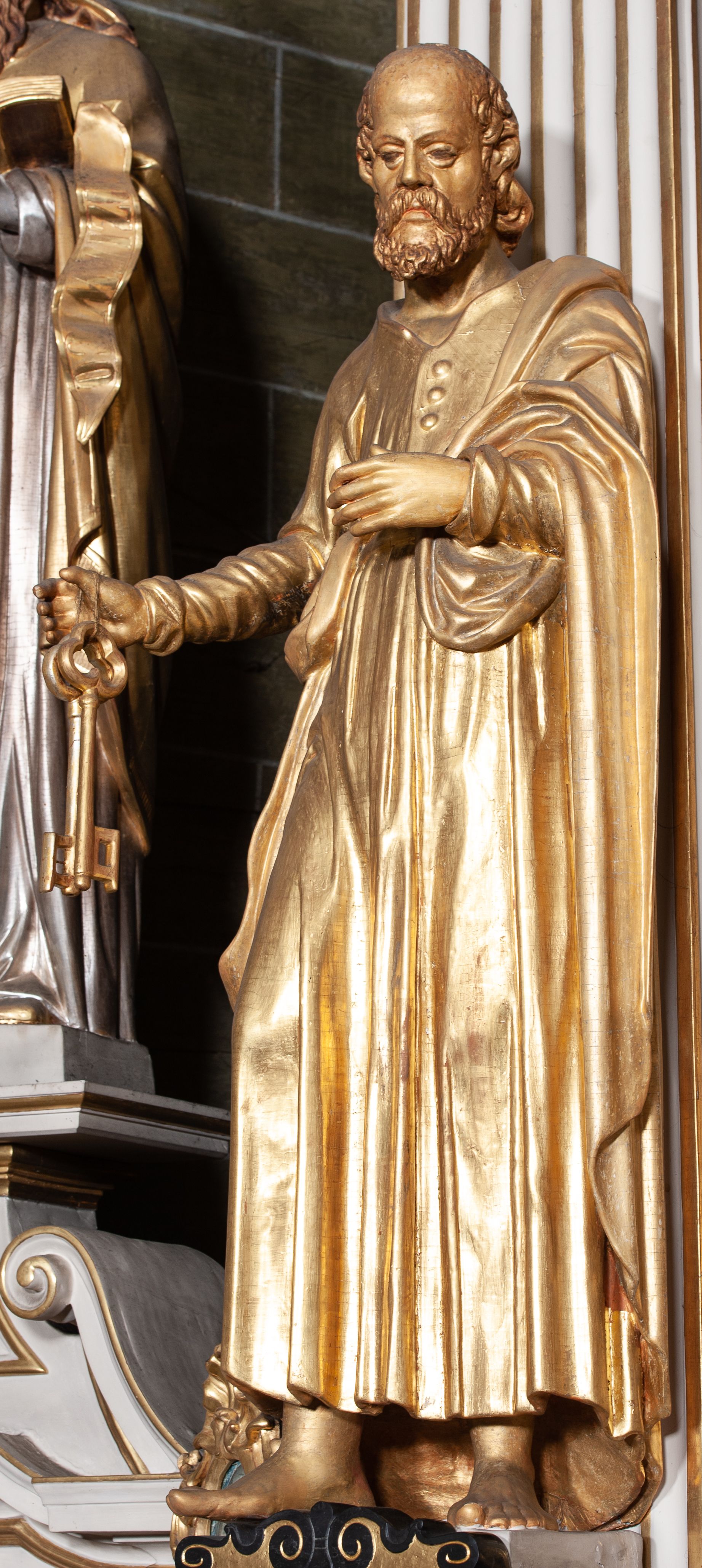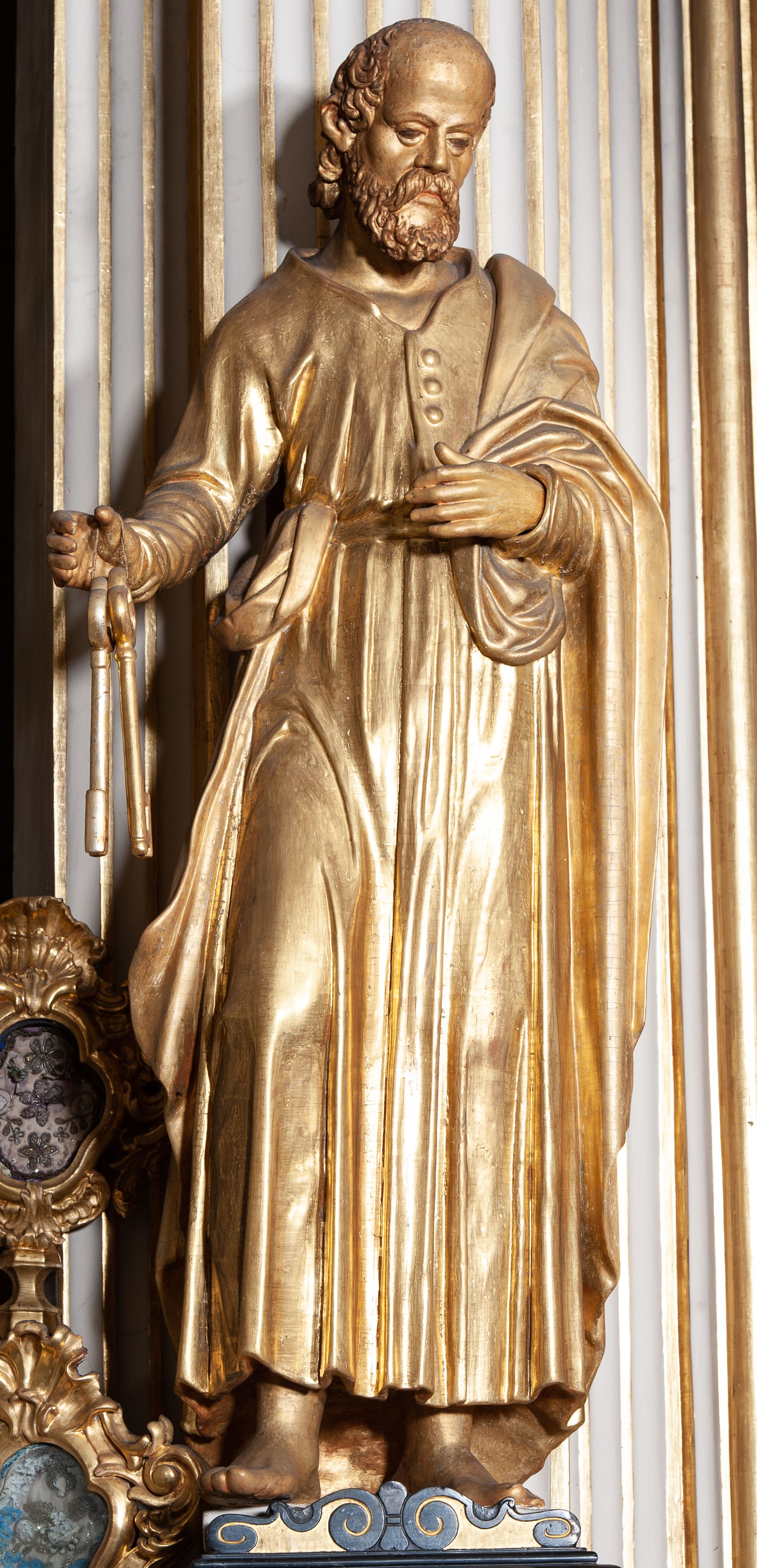 Rzeźba drewniana, przyścienna, pozłocona, umieszczona po prawej stronie, przy filarze ołtarza głównego; pełnoplastyczna, przyścienna; przedstawienie św. Piotra Apostoła w całej postaci, frontalnie, w lekkim kontrapoście, z głową skierowaną lekko w lewo. Ręce ugięte w łokciach, w prawej trzyma dwa duże klucze. Cała rzeźba wraz z karnacjami pozłocona. Dzieło nieokreślonego rzeźbiarza małopolskiego z połowy XVIII wieku.