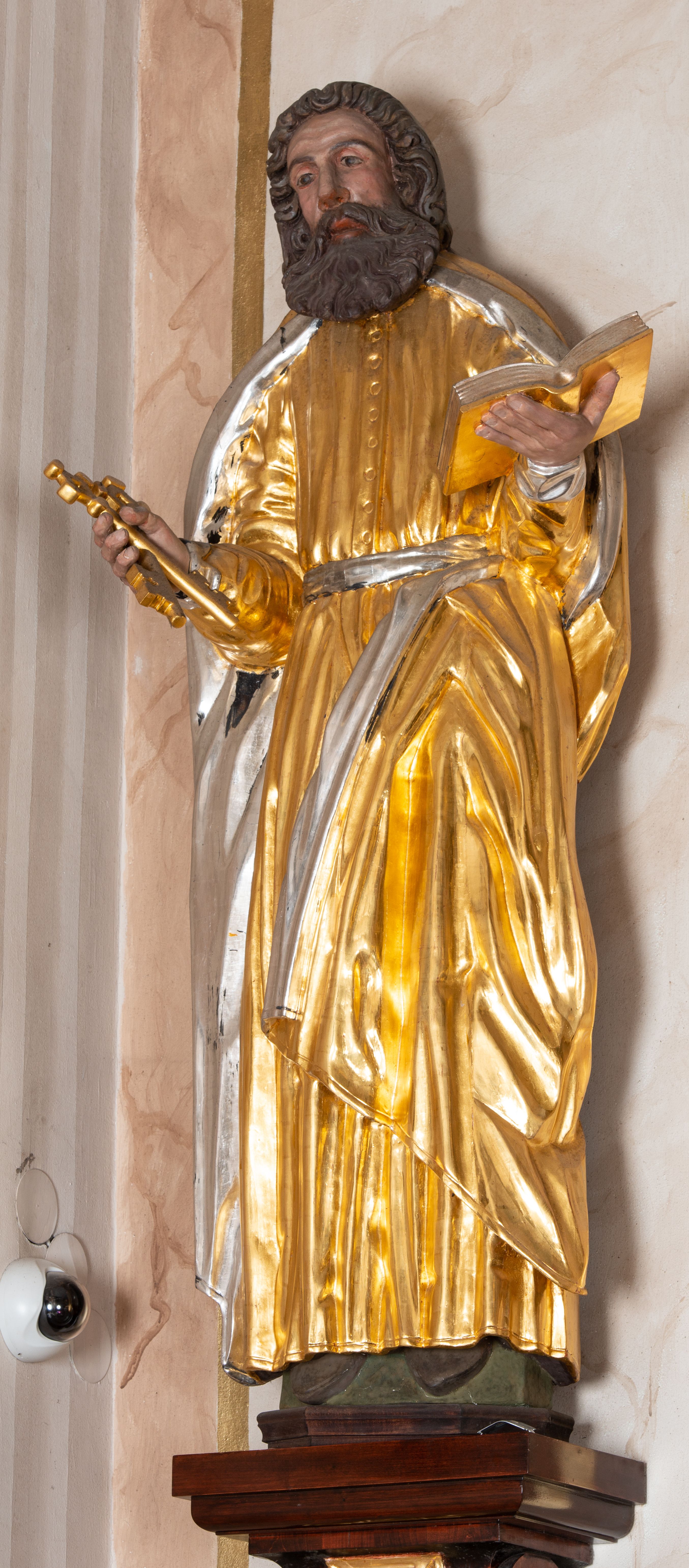 Całopostaciowa, drążona z tyłu figura św. Piotra stojącego na niewysokiej, ośmiobocznej podstawie. Święty zwrócony jest na wprost. Lekko przechyloną w prawo głowę charakteryzuje pociągła twarz o wyrazistych rysach z bruzdami na czole, mocno zarysowanymi łukami brwiowymi, wydatnym nosem i bujnym zarostem. Skręcone, ciemnobrązowe włosy sięgają ramion. Święty Piotr jest ubrany w długą, zapinaną na guziki, złoconą suknię przewiązaną srebrzonym pasem, na ramiona ma narzucony złocony płaszcz ze srebrzonym podszyciem, na stopach ciemnobrązowe, spiczaste buty. W zgiętych w łokciach, uniesionych na wysokości talii rękach ma parę złoconych kluczy – w prawej i otwartą, złocono-srebrzoną księgę – w lewej.