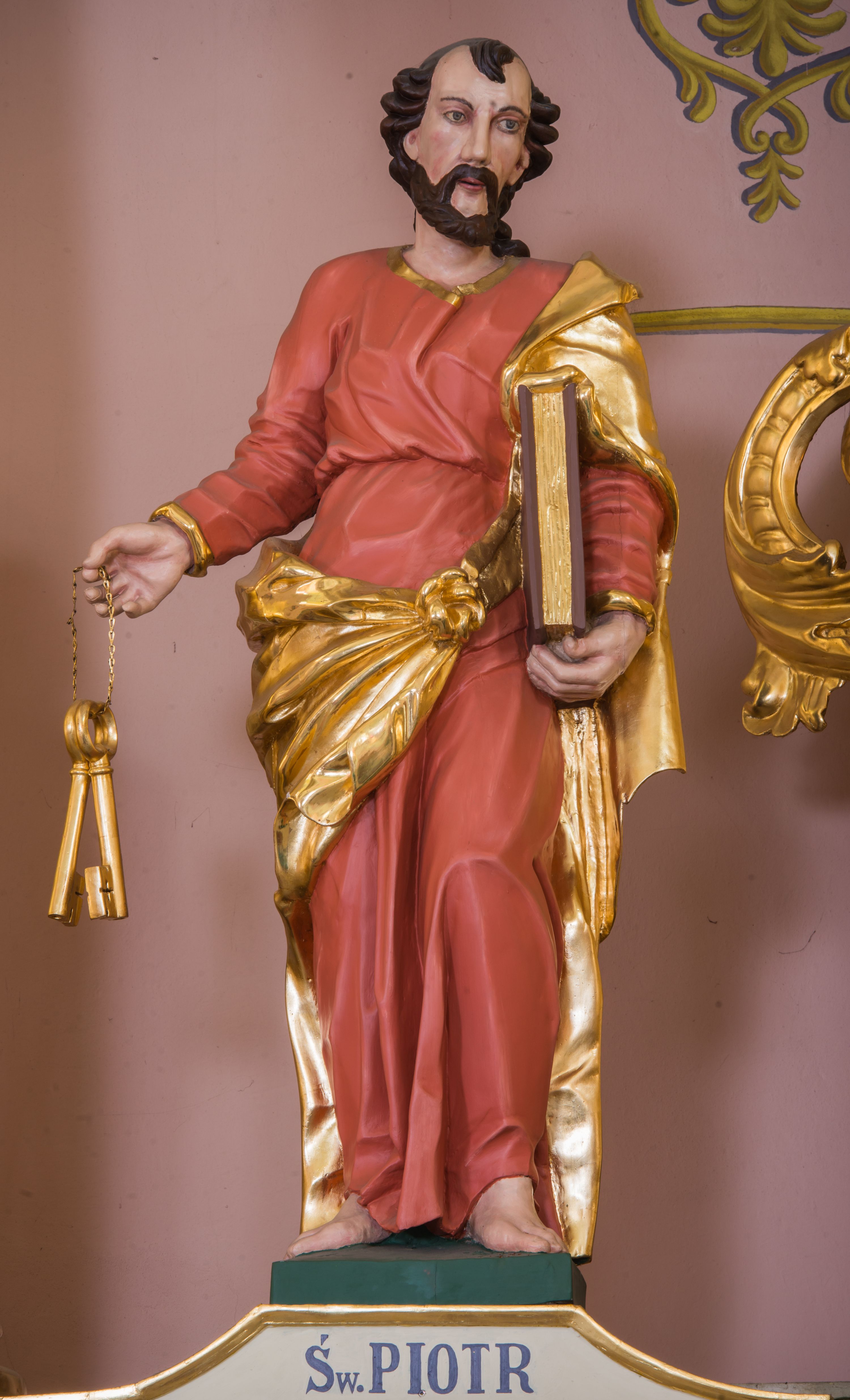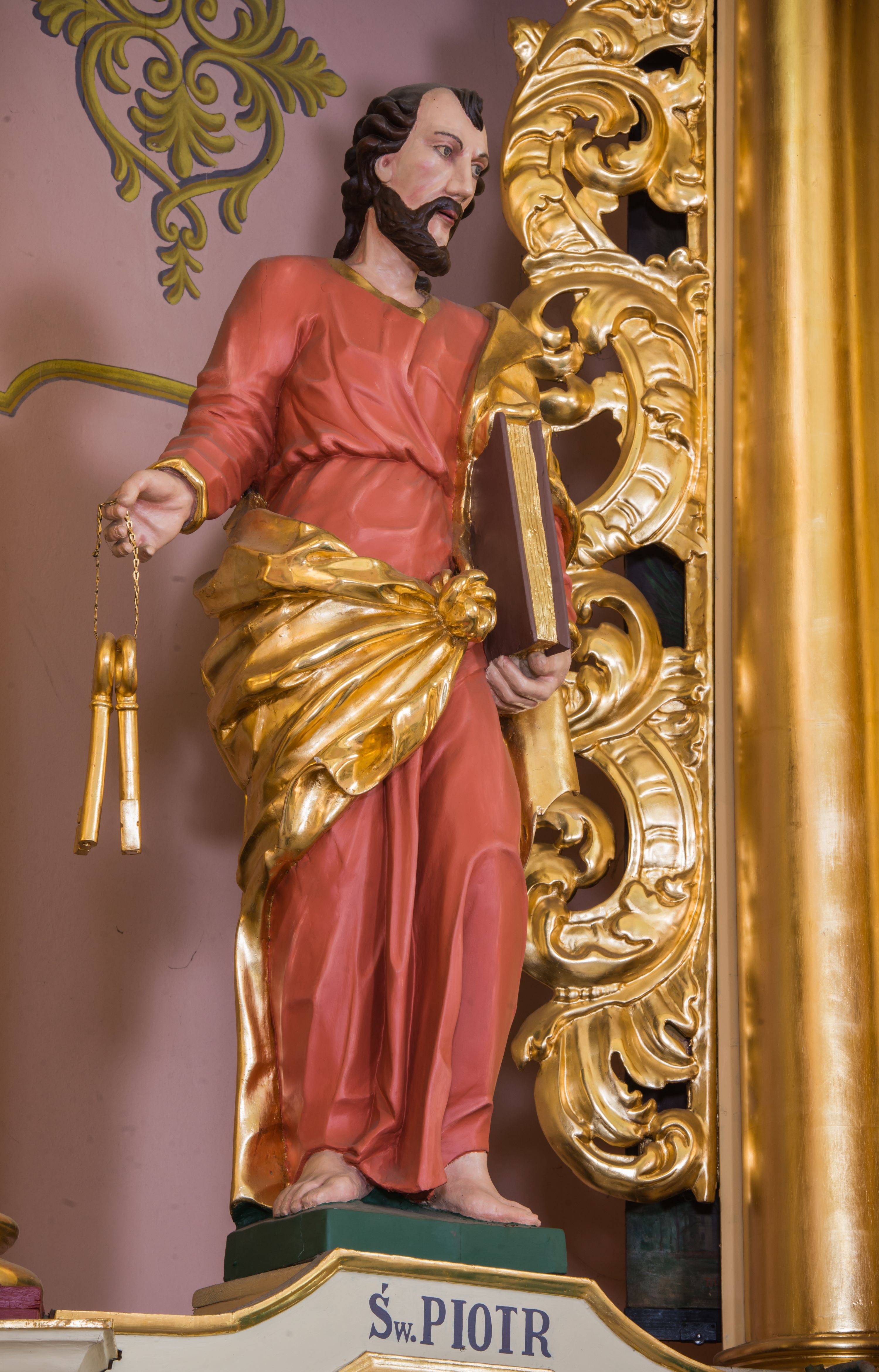 Rzeźba św. Piotra została ścięta i wydrążona z tyłu oraz ustawiona na podstawie na planie kwadratu. Święty został ujęty frontalnie, w kontrapoście. Lewą ręką podtrzymuje przy boku zamknietą księgę, a w prawej wyciągniętej w bok trzyma dwa klucze. Apostoł ma pociągłą twarz o wyrazistych rysach, głęboko osadzonych oczach, prostym nosie i lekko rozchylonych ustach. Głowę okala krótka brodą i krótkie, kręcone, ciemne włosy z charkaterystycznym puklem na czole. Ubrany jest w różowo-pomarańczową tunikę ze złoconą lamówką oraz złocony płaszcz przewiązany diagonalnie przez lewe ramię i zawiązany z przodu postaci. Spod tuniki widać bose stopy. Polichromia ciała jest naturalistyczna.