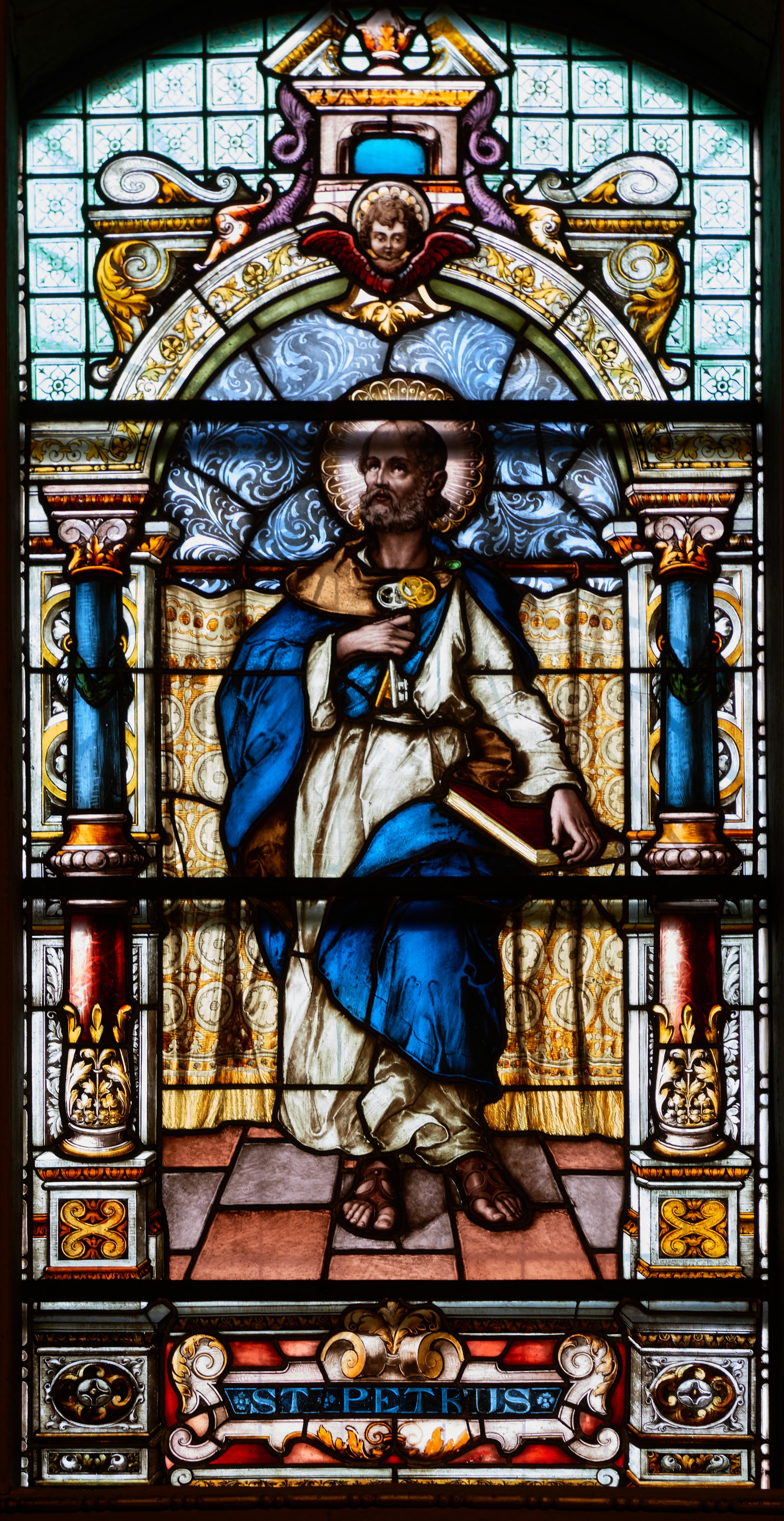 Witraż w kształcie stojącego prostokąta, zamkniętego łukiem odcinkowym. W centrum kompozycji ukazany jest św. Piotr wewnątrz dekoracyjnej aediculi. Święty przedstawiony jest frontalnie, w lewej dłoni trzyma opartą o biodro księgę, a w prawej dwa klucze, przyciśnięte do piersi, głowa uniesiona lekko do góry. Twarz szeroka z wysokim czołem z zaznaczoną łysiną na głowie, okolona bujną, krótką brodą. Święty ubrany jest w białą suknię, przewiązaną w pasie; niebieski płaszcz ze złotą podszewką, spięty na lewym ramieniu zieloną fibulą oraz sandały na stopach; wokół głowy ma kolisty nimb, wypełniony świetlistymi promieniami i złotymi zdobieniami. Aedicula wsparta jest na parach kolumn oraz stojących za nimi filarów, ustawionych na dwustopniowych cokołach. Podpory podtrzymują zwieńczenie z łukiem odcinkowym z przodu. W tle na prostym drążku, zawieszona jest drapowana, złota kotara ze złotymi frędzlami; podłoga ułożona z brązowym płytek. Cokoły kolumn dekorowane są płycinami, wypełnionymi rozetami i wolutami. Kolumny w połowie przedzielone są opaską, u dołu zdobione stylizowanymi liśćmi akantu, a u góry zielonym festonem. W dolnej części kolumny są koloru czerwonego, w górnej niebieskiego; kapitele kompozytowe. Trzony filarów zdobione prostokątnymi płycinami, wypełnionymi roślinną dekoracją. Łuk zdobiony jest złoconą wicią roślinną i astragalem, w kluczu znajduje się uskrzydlona główka aniołka z czerwonymi skrzydłami. Zwieńczenie dwustopniowe, bogato dekorowane wolutkami i liśćmi akantu, na szczycie przerwany przyczółek, a po środku wazon. W dolnej partii witrażu, pomiędzy cokołami aediculi ozdobny kartusz zdobiony stylizowanym ornamentem okuciowym z prostokątną płyciną w polu z napisem: „S[ANC]T[US] PETRUS” oraz sygnatura artysty Georga Boosa z Monachium.