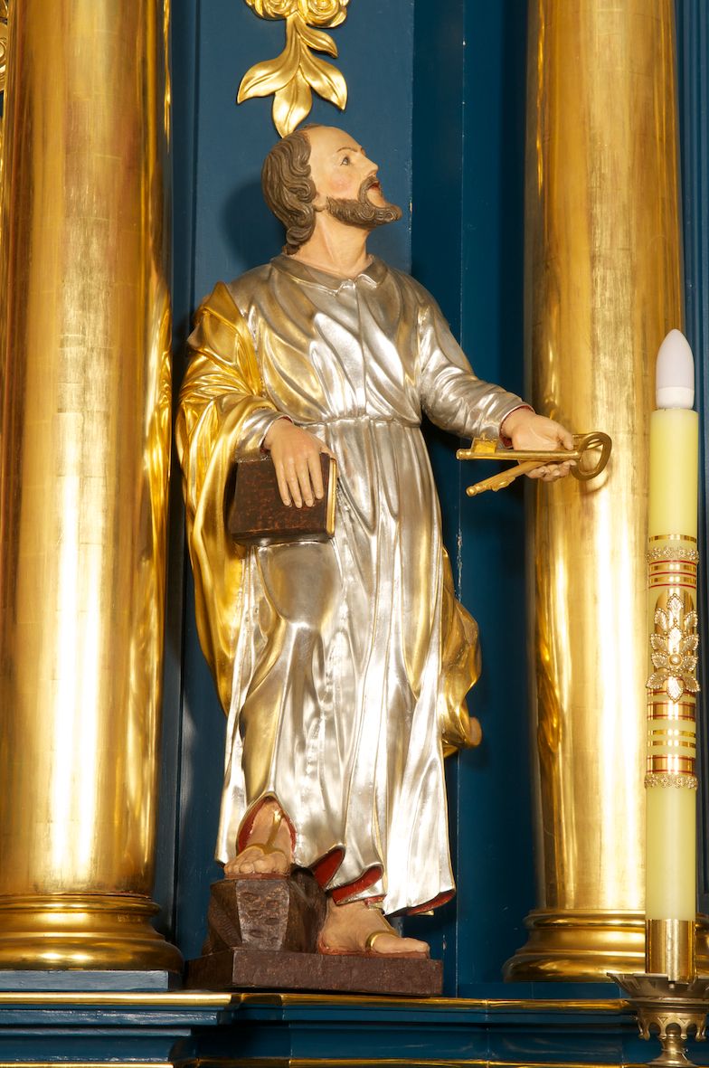 Rzeźba pełnoplastyczna, ustawiona na niskiej podstawie. Figura ukazana frontalnie, w lekkim odchyleniu, z uniesioną głową skierowaną w lewo. W lewej, wyciągniętej do przodu ręce trzyma skrzyżowane dwa klucze, w prawej, ugiętej ręce trzyma zamkniętą księgę, opartą na ugiętej nodze, ustawionej na stopniu. Twarz ma szeroką, o wysokim czole, niewielkich migdałowatych oczach, małych nosie i ustach. Włosy lekko kręcone, krótkie, silnie przylegające do głowy, z zaznaczoną łysiną i puklem nad czołem. Twarz okolona krótką, kręconą brodą z wąsami. Postać ubrana w długą, srebrzoną tunikę z kołnierzykiem, przepasaną w pasie oraz złocony płaszcz przerzucony przez prawe ramię i opadający na plecy. Na stopach ma złocone sandały. Polichromią ciała naturalistyczna.