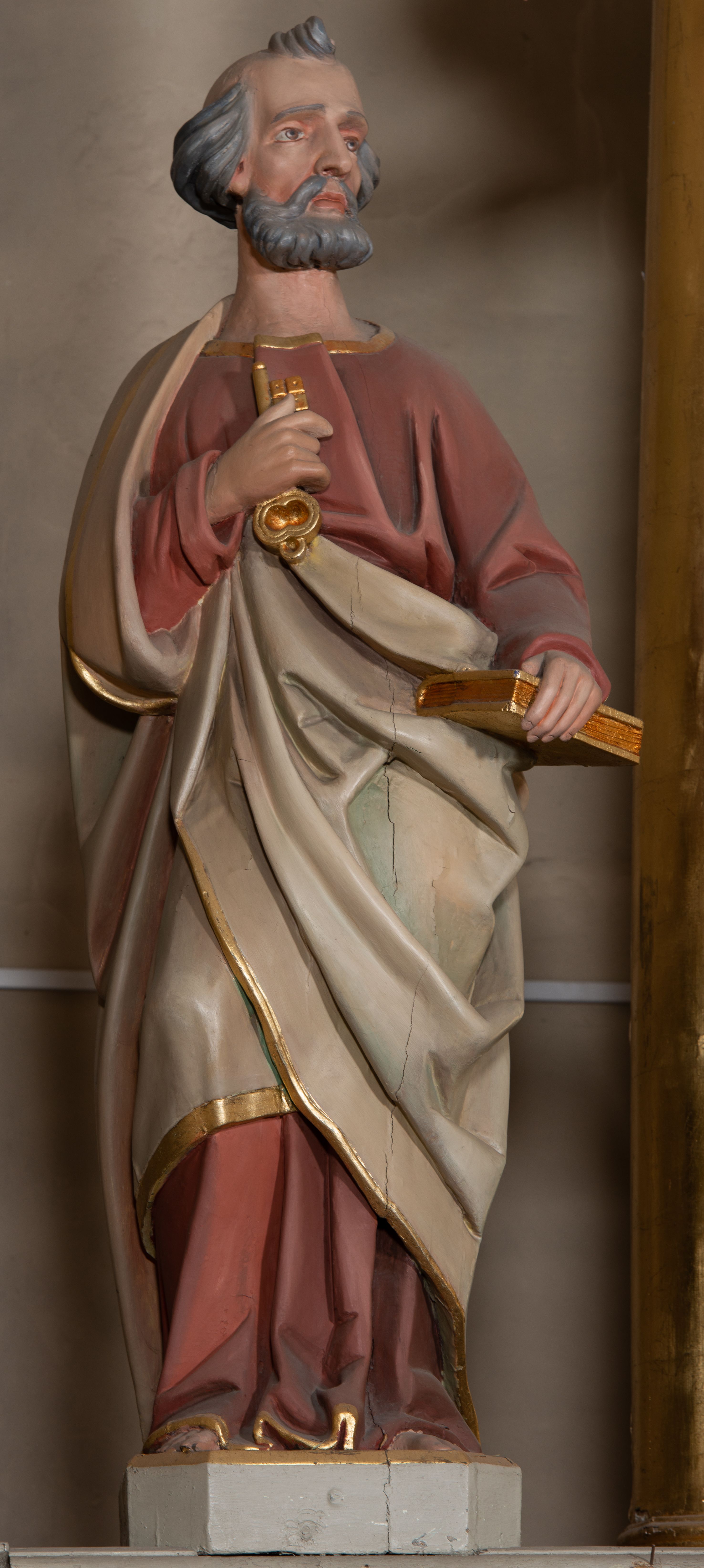 Rzeźba drążona z tyłu, ustawiona na podstawie na planie kwadratu o ściętych narożach. Święty ukazany jest w całej postaci, zwrócony frontalnie, z głową skierowaną w lewo, w kontrapoście. Lewą ręką trzyma przy boku księgę, prawą z kluczami w dłoni kładzie na piersi. Twarz ma pociągłą, o głęboko osadzonych oczach, uniesionych brwiach, dużym nosie i pełnych ustach, okoloną krótką, gęstą brodą oraz siwymi, krótkimi włosami z kosmykiem nad czołem. Ubrany jest w długą, czerwoną tunikę ze złoconą lamówką oraz osłaniający prawe ramię i zawinięty wokół postaci szary płaszcz ze złotą lamówką. Polichromia naturalistyczna w partiach ciała.