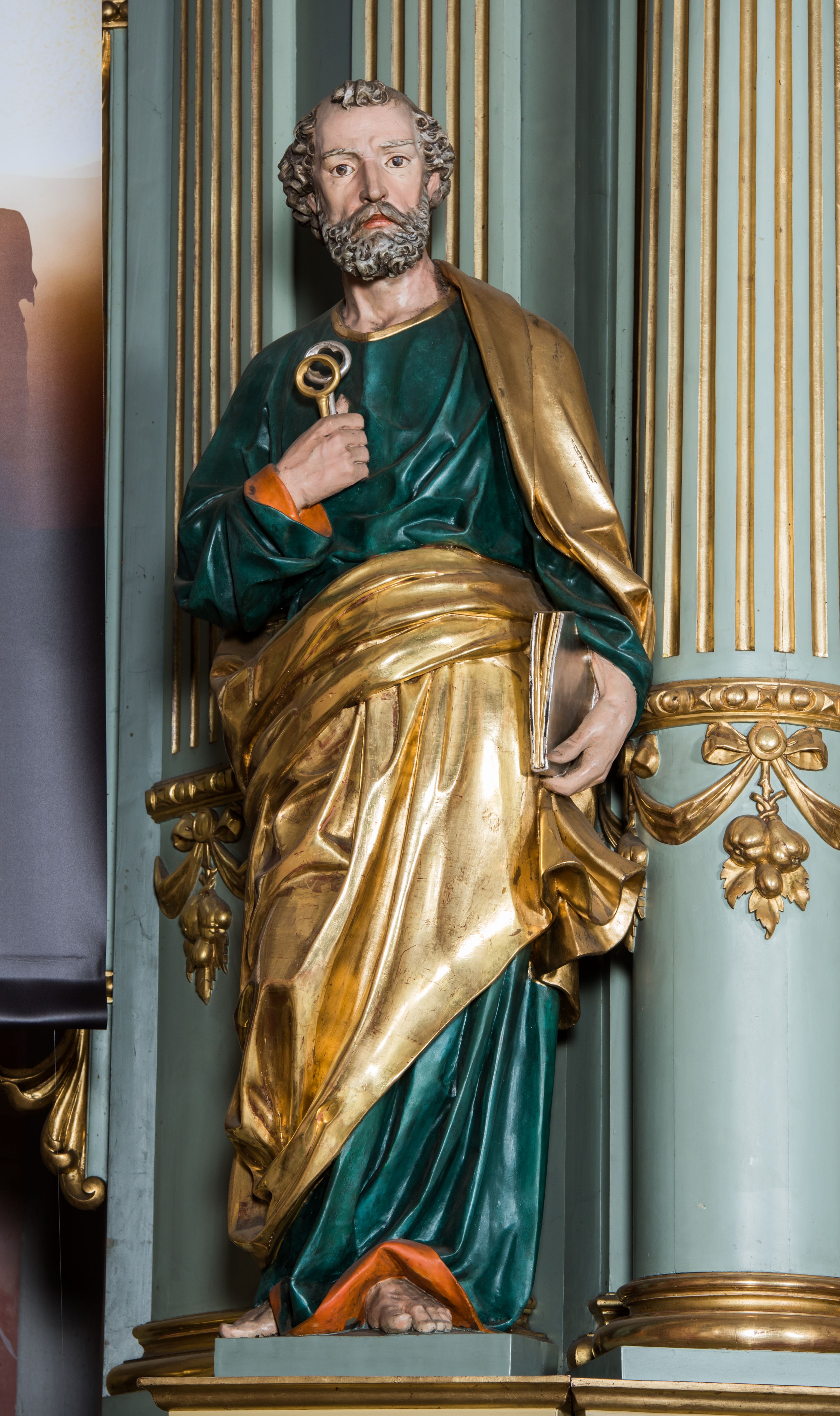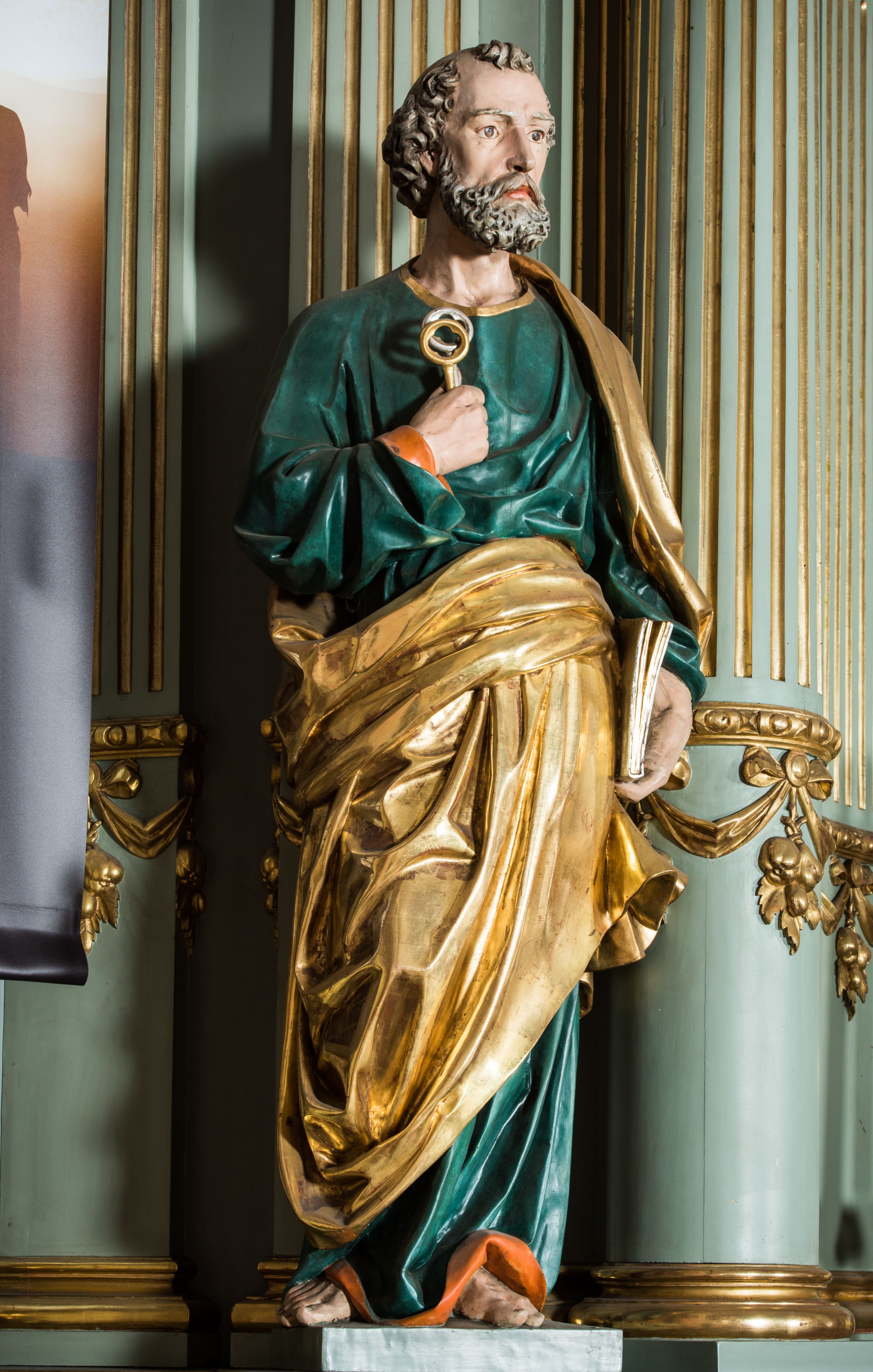 Rzeźba św. Piotra Apostoła przynależy do neoklasycystycznego ołtarza głównego powstałego tuż po wybudowaniu nowego kościoła w latach 1816-1818 według projektu architekta Józefa Heintzego.