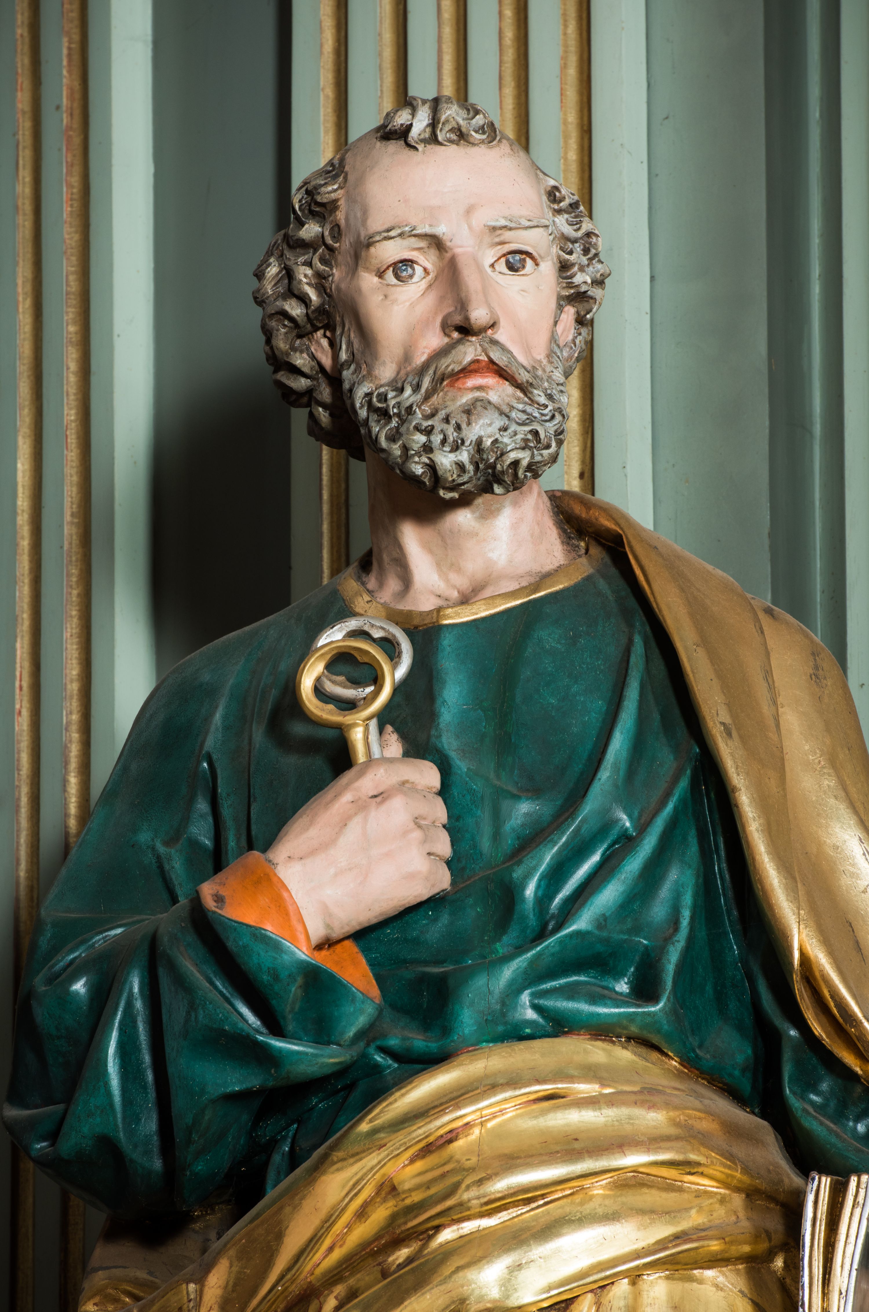 Pełnoplastyczna rzeźba św. Piotra ukazuje stojącego apostoła frontalnie w nieznacznym kontrapoście. Święty prawą ręką przyciska do piersi dwa klucze – srebrny i złoty, a w lewej opuszczonej wzdłuż tułowia trzyma zamkniętą księgę. Piotr ma pociągłą twarz o ostrych rysach dojrzałego mężczyzny okoloną siwiejącą brodą i kędzierzawymi włosami. Charakteryzują ją wydatny nos i usta oraz spojrzenie szeroko otwartych oczu skierowane na widza. Apostoł ubrany jest w zieloną tunikę podbitą pomarańczem, lamowaną pod szyją złotą tasiemką oraz w złoty płaszcz narzucony na lewe ramię, z połą owinięta wokół pasa. Spod tuniki widać końcówki bosych stóp.