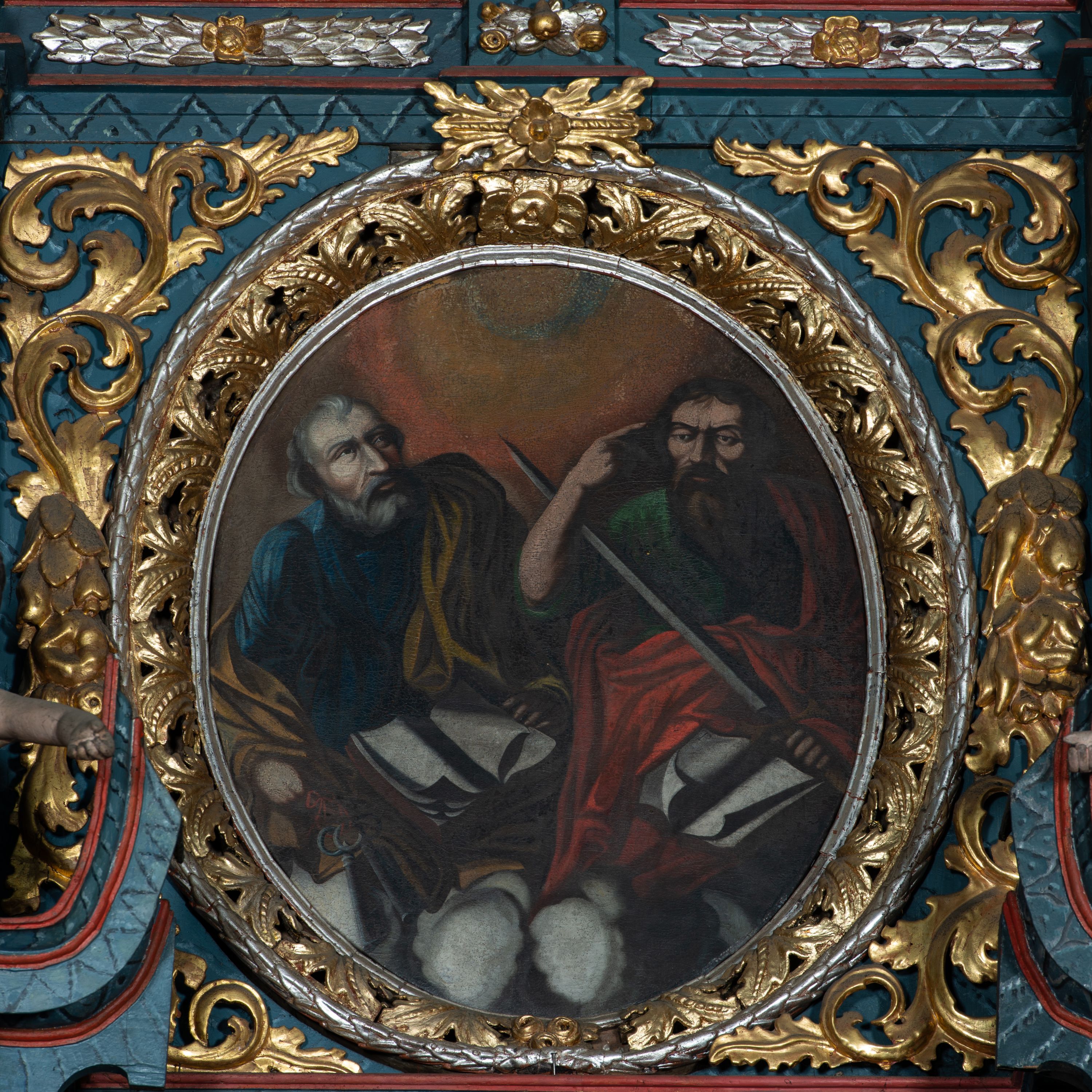 Obraz w formie owalu, w centrum dwie półpostacie świętych na obłokach. Po prawej św. Paweł, zwrócony w trzech czwartych w prawo. W lewej ręce trzyma miecz zwrócony ku górze, prawą unosi, wskazując głowę. Twarz ascetyczna, o ściągniętych brwiach, okolona długą brodą opadającą na pierś. Włosy krótkie, ciemne. Święty jest ubrany w zieloną tunikę oraz przerzucony diagonalnie czerwony płaszcz. Na jego kolanach księga. Po lewej stronie św. Piotr zwrócony w trzech czwartych w lewą stronę, z głową uniesioną ku górze. W prawej ręce trzyma klucze, lewą przytrzymuje leżącą przed nim księgę. Twarz podłużna o starczych rysach, okolona siwą brodą; włosy krótkie, siwe. Ubrany jest w granatową tunikę oraz żółty płaszcz przerzucony przez lewe ramię. Tło w formie poświaty w układzie koncentrycznych kręgów. Kolorystyka kontrastowa, intensywna, o silnym światłocieniu.