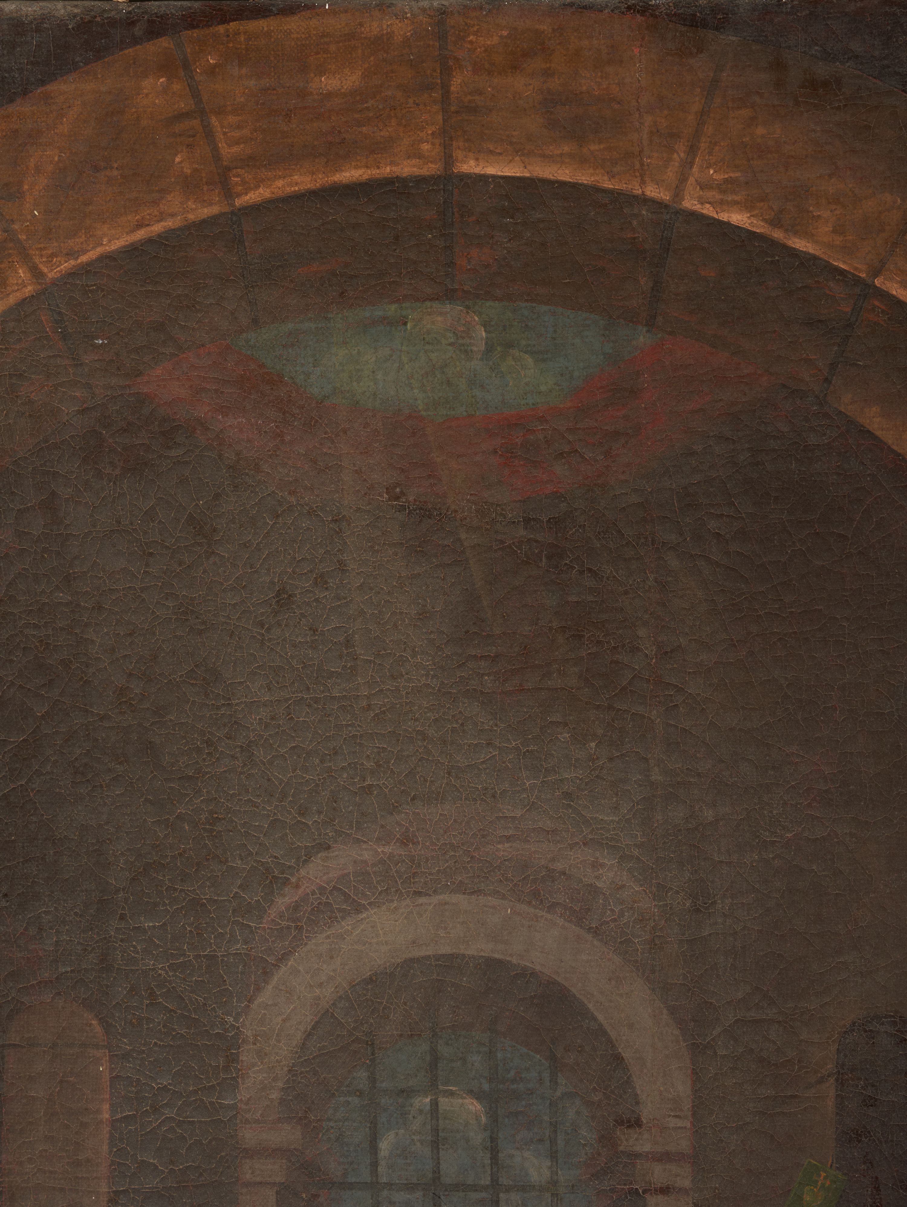 Zaprawa i warstwa malarska przesuszone, pokryte gęstą siatką spękań. W dolnej części inskrypcja zachowana fragmentarycznie, w miejscu tym widoczne rozległe uzupełnienia ubytków zaprawy i warstwy malarskiej. Na obrzeżach kit woskowy w czerwonym kolorze. Cała powierzchnia malowidła pociemniała.