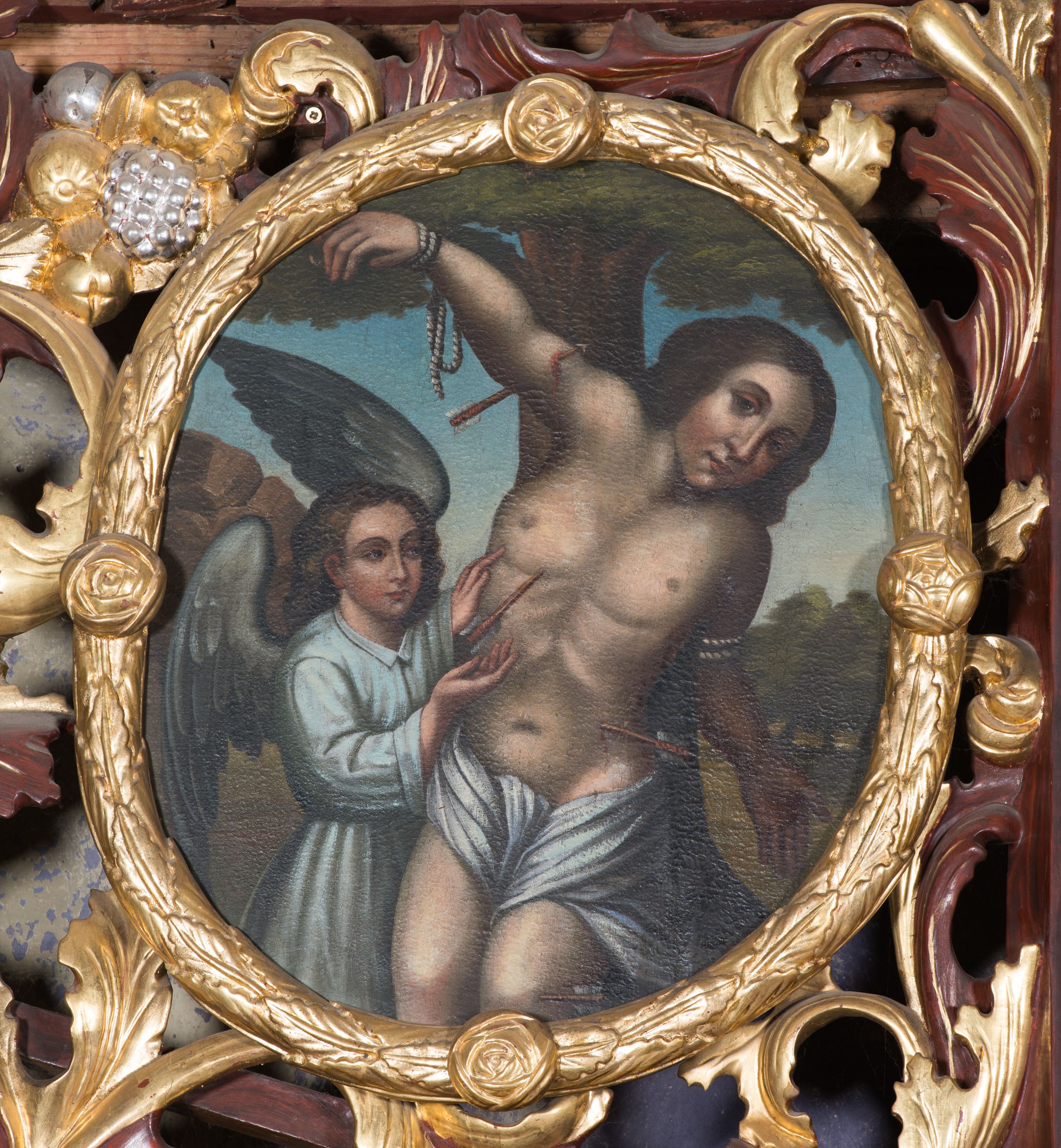 Obraz w kształcie owalu z przedstawieniem św. Sebastiana. W centrum kompozycji ukazany św. Sebastian w trzech czwartych wysokości, sylwetka esowato wygięta, głowa bezwładnie opuszczona na lewy bark, prawa ręka przymocowana do gałęzi wysoko nad głową, lewa ręka ugięta w łokciu, schowana za plecami świętego. Twarz o młodzieńczych rysach, zarumienionych policzkach, nos długi i wąski, głowa okolona bujnymi i ciemnymi włosami zasłaniającymi uszy. Święty z nagim torsem, przepasany w biodrach białą tkaniną. Z lewej strony stoi anioł rękami wskazujący na św. Sebastiana, ubrany w białą suknię z długimi rękawami i kołnierzykiem. W tle pejzaż i błękitne niebo, pośrodku wysokie drzewo. Kolorystyka ciepła.