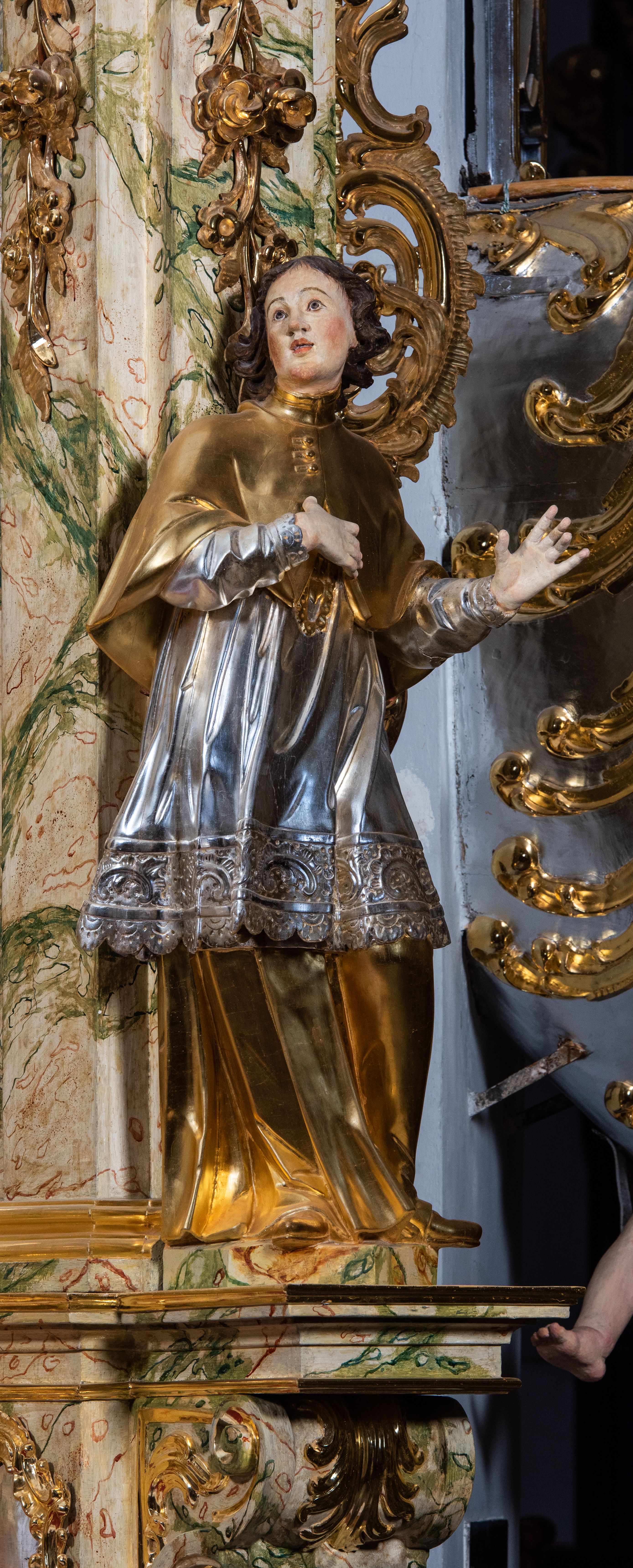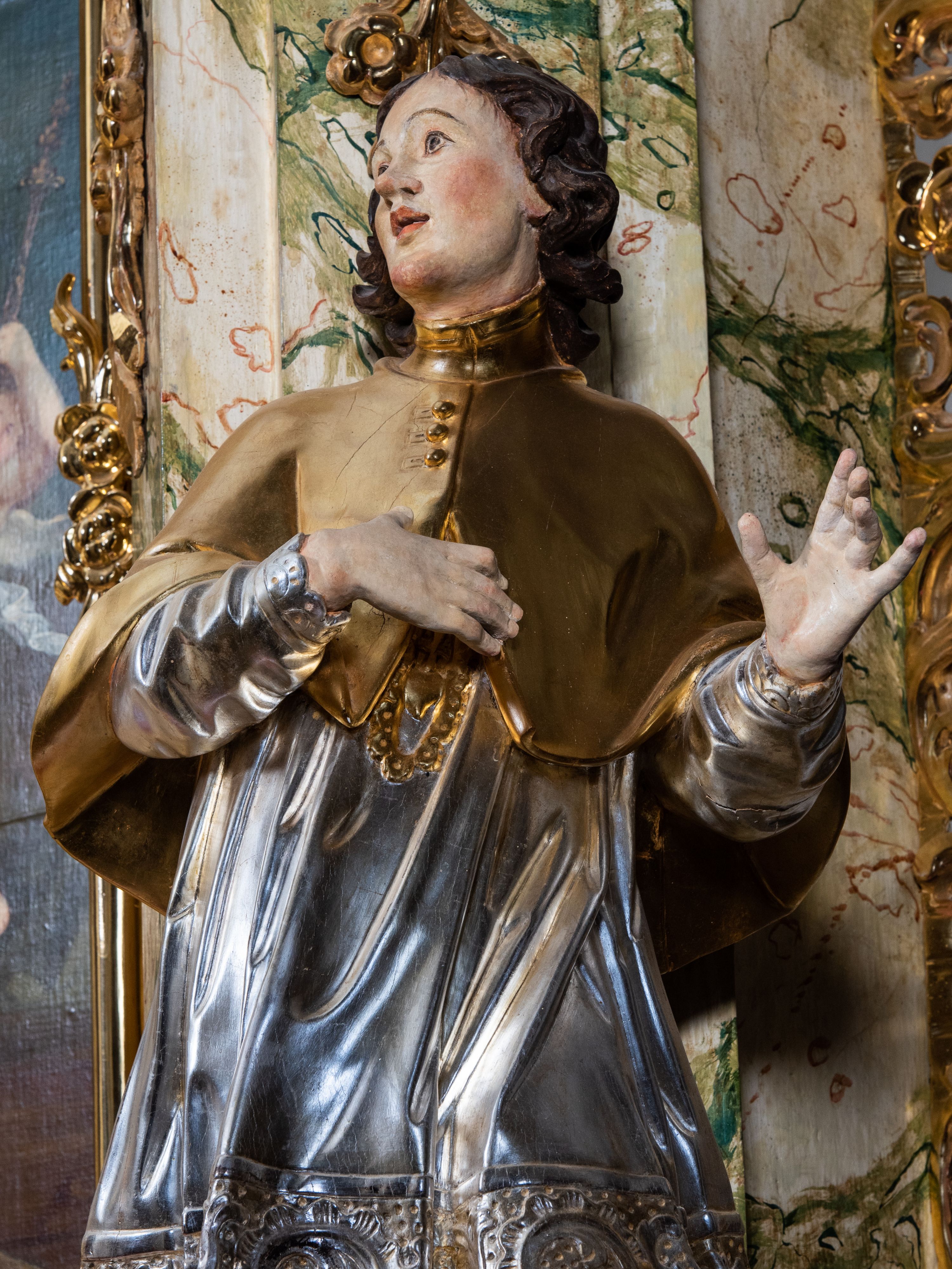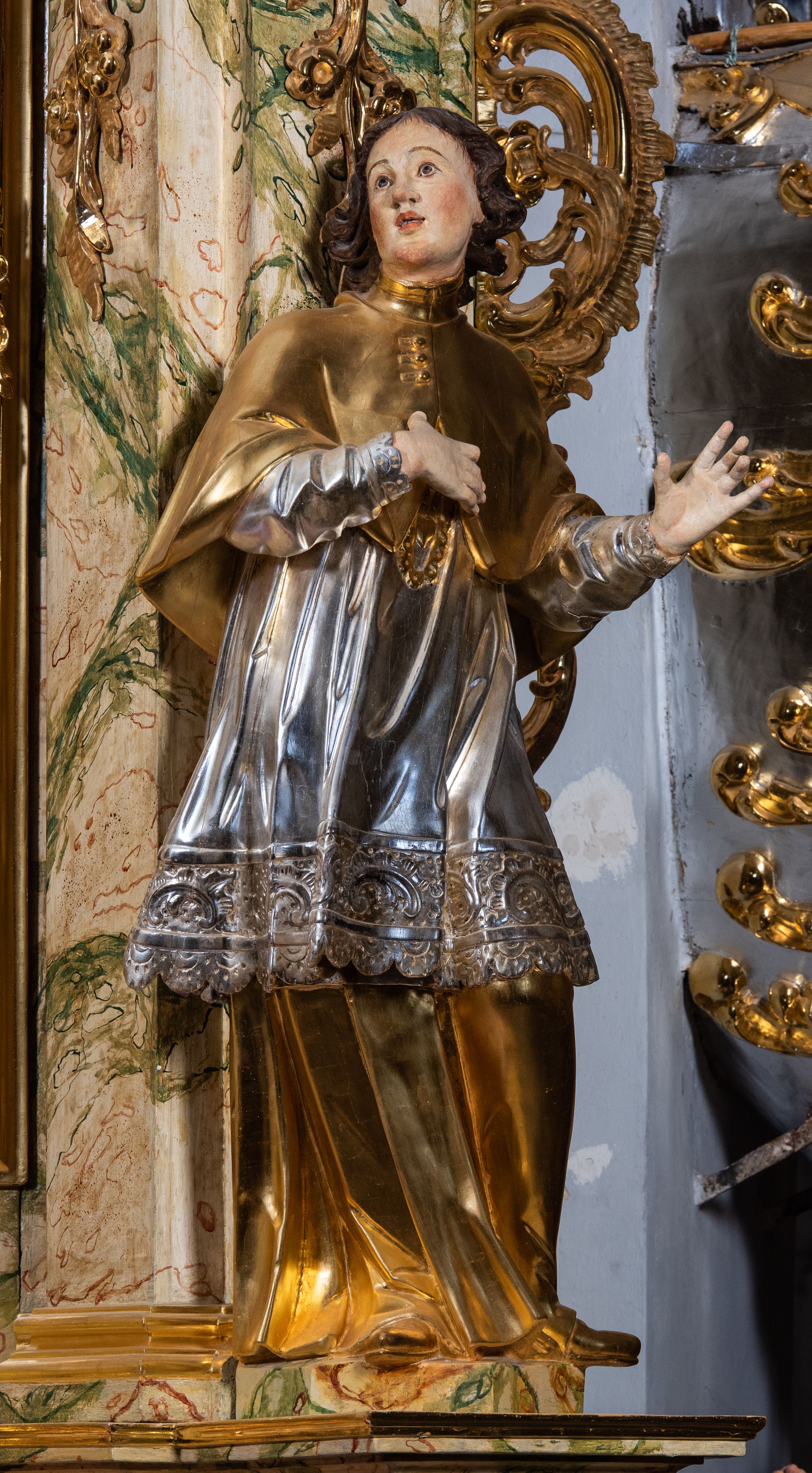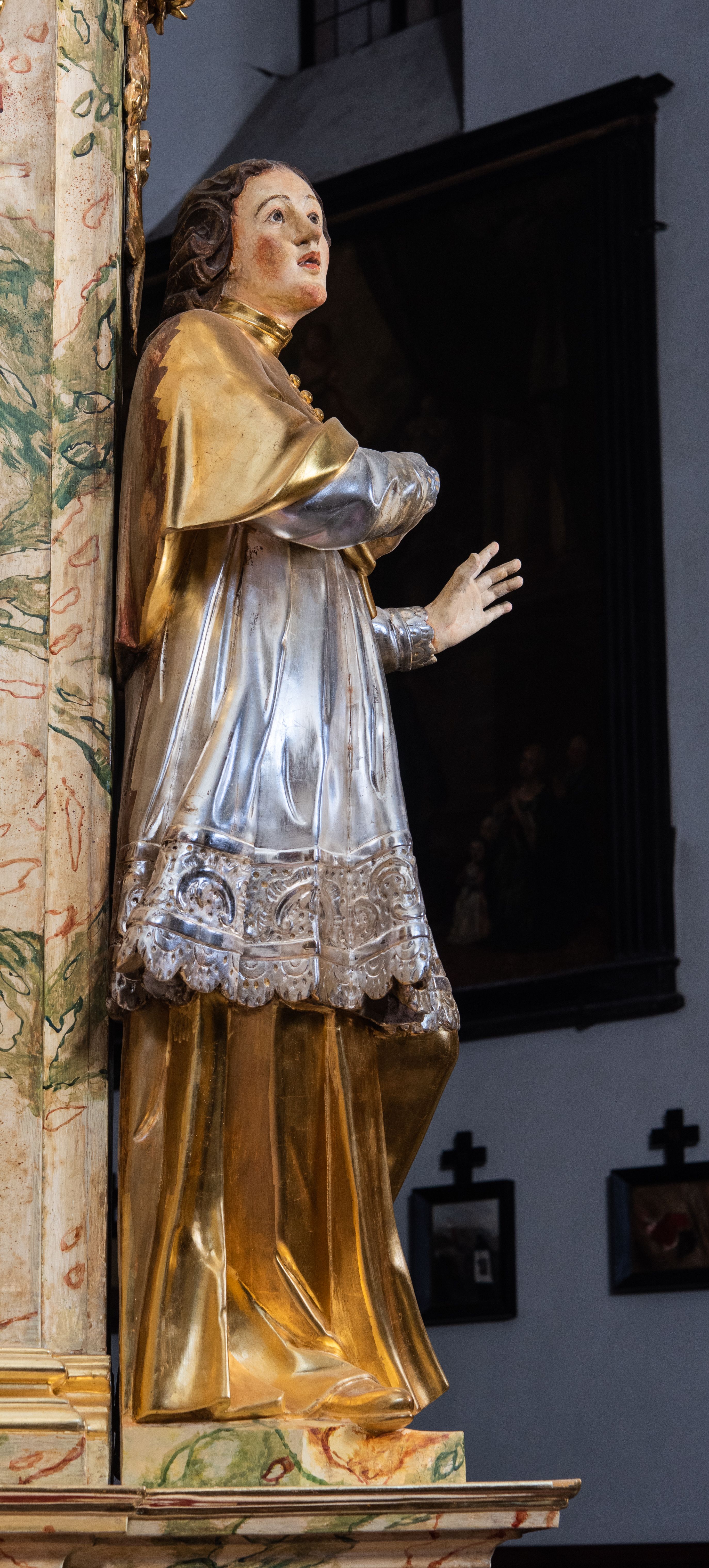 Rzeźba drążona i ścięta, ustawiona na wielobocznej podstawie. Postać ukazana frontalnie z głową skierowaną w prawo, o „esowato” wygiętej sylwetce, w kontrapoście. Prawa ręka złożona na piersi, lewa ugięta i wyciągnięta w bok. Twarz pociągła, owalna, o małych oczach skierowanych do góry, małym zadartym nosie i rozchylonych ustach, z wyodrębnioną brodą, okolona krótkimi, kręconymi, brązowymi włosami. Święty jest ubrany w złotą albę, srebrną komżę z płaskorzeźbioną koronką przy brzegach, a na ramiona ma narzucony złoty mucet zapięty z przodu na guziki, spod szat wystają czubki złotych butów Partie ciała są polichromowane naturalistyczne.