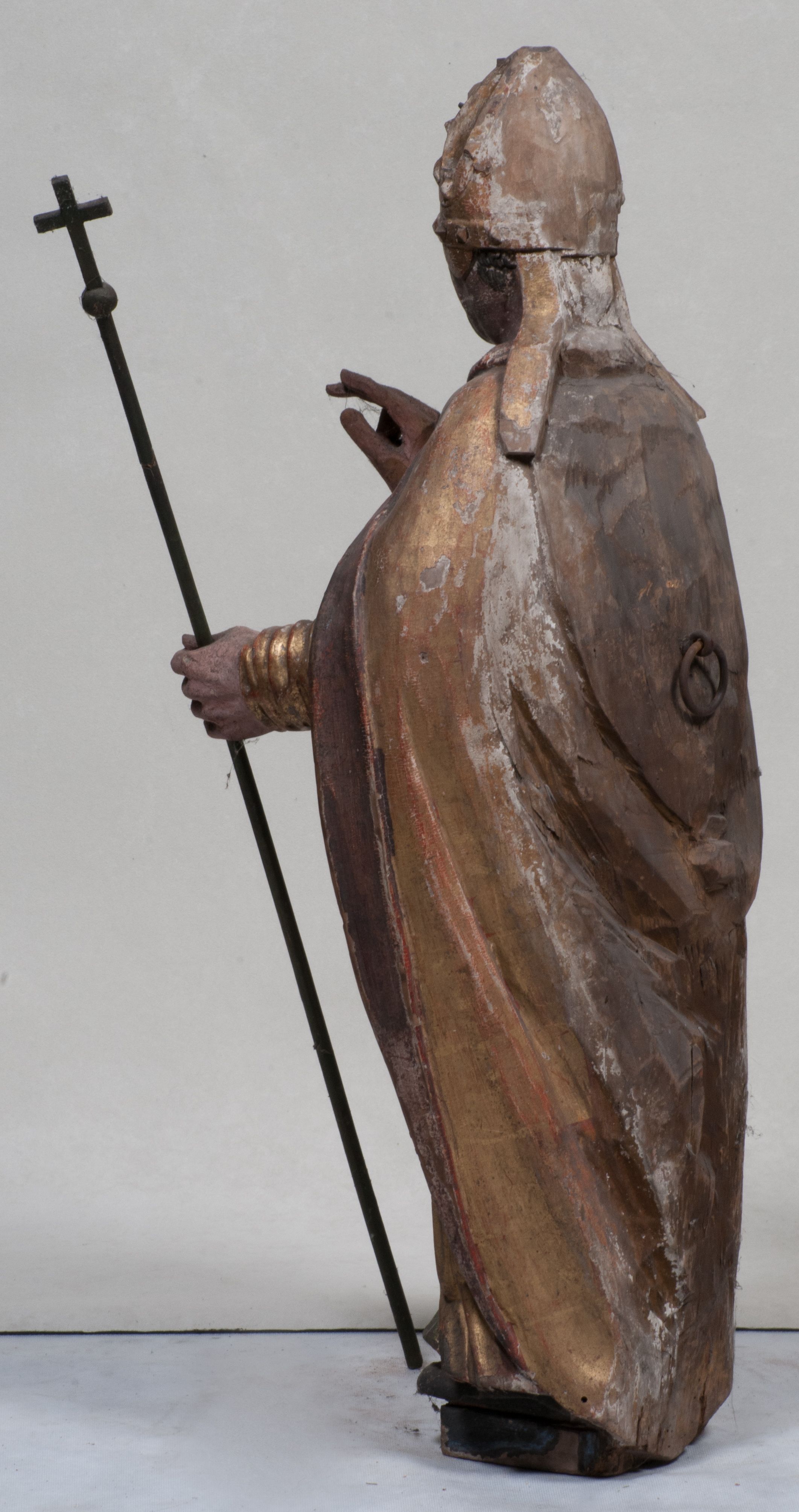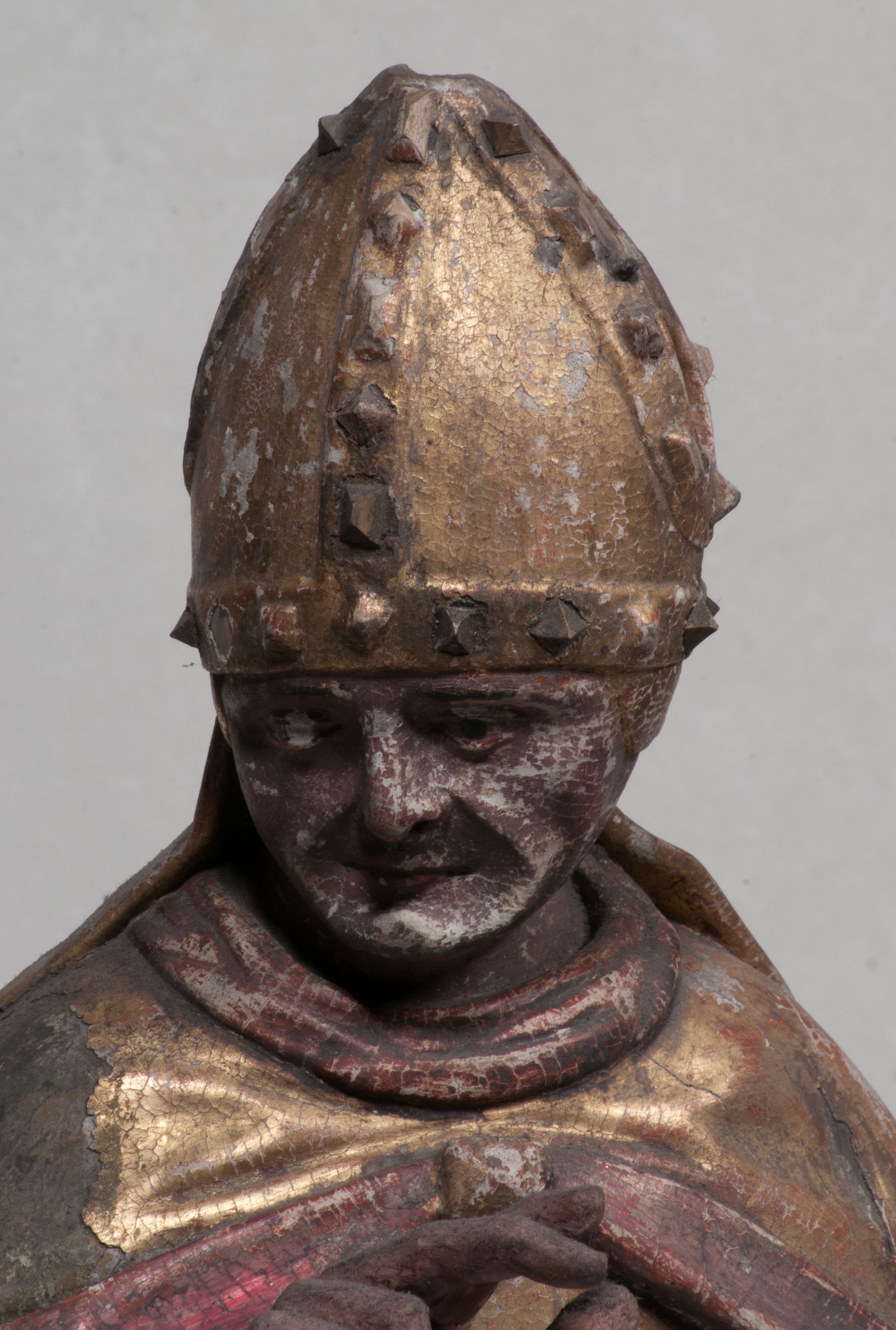 Figura nieopracowana rzeźbiarsko z tyłu, ustawiona jest na niewielkiej, nieregularnej podstawie. Święty ukazany jest w całej postaci, frontalnie, z głową skierowaną w prawo. Prawą rękę unosi delikatnie w geście błogosławieństwa, w lewej wyciągniętej do przodu trzyma laskę zakończoną krzyżem. Jego twarz jest trójkątna, o półprzymkniętych oczach, niewielkim nosie i wąskich ustach. Ubrany jest w albę, ornat z płaskorzeźbioną krzyżową pretekstą, kapę zapiętą na piersi, na głowie ma infułę. Przy jego prawej nodze znajduje się półpostać Piotrowina, zwróconego ku świętemu, z rękoma złożonymi w geście modlitwy, nakrytego płaszczem. Polichromia w odsłoniętych partiach karnacji obecnie poszarzała, strój złocony.