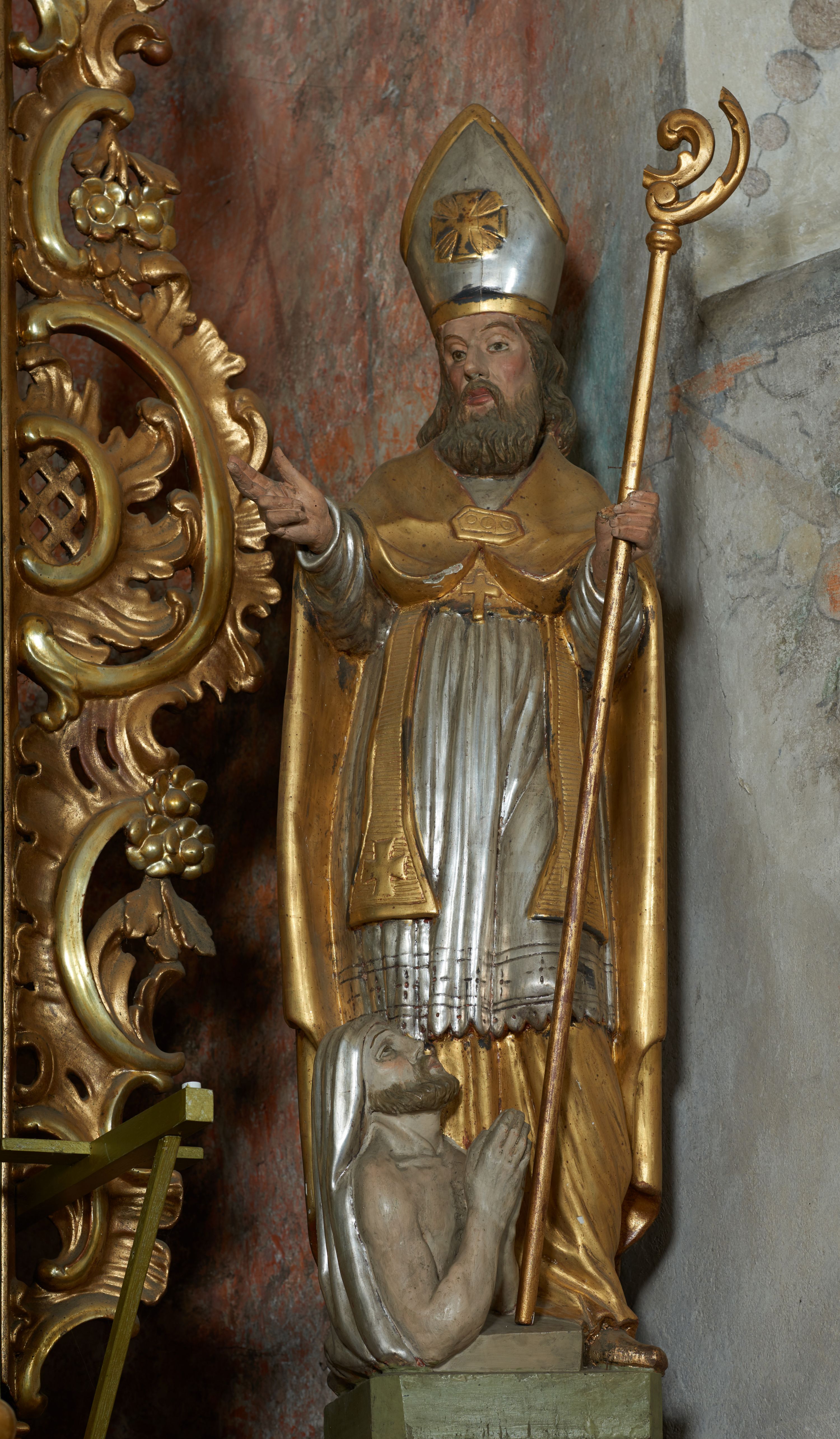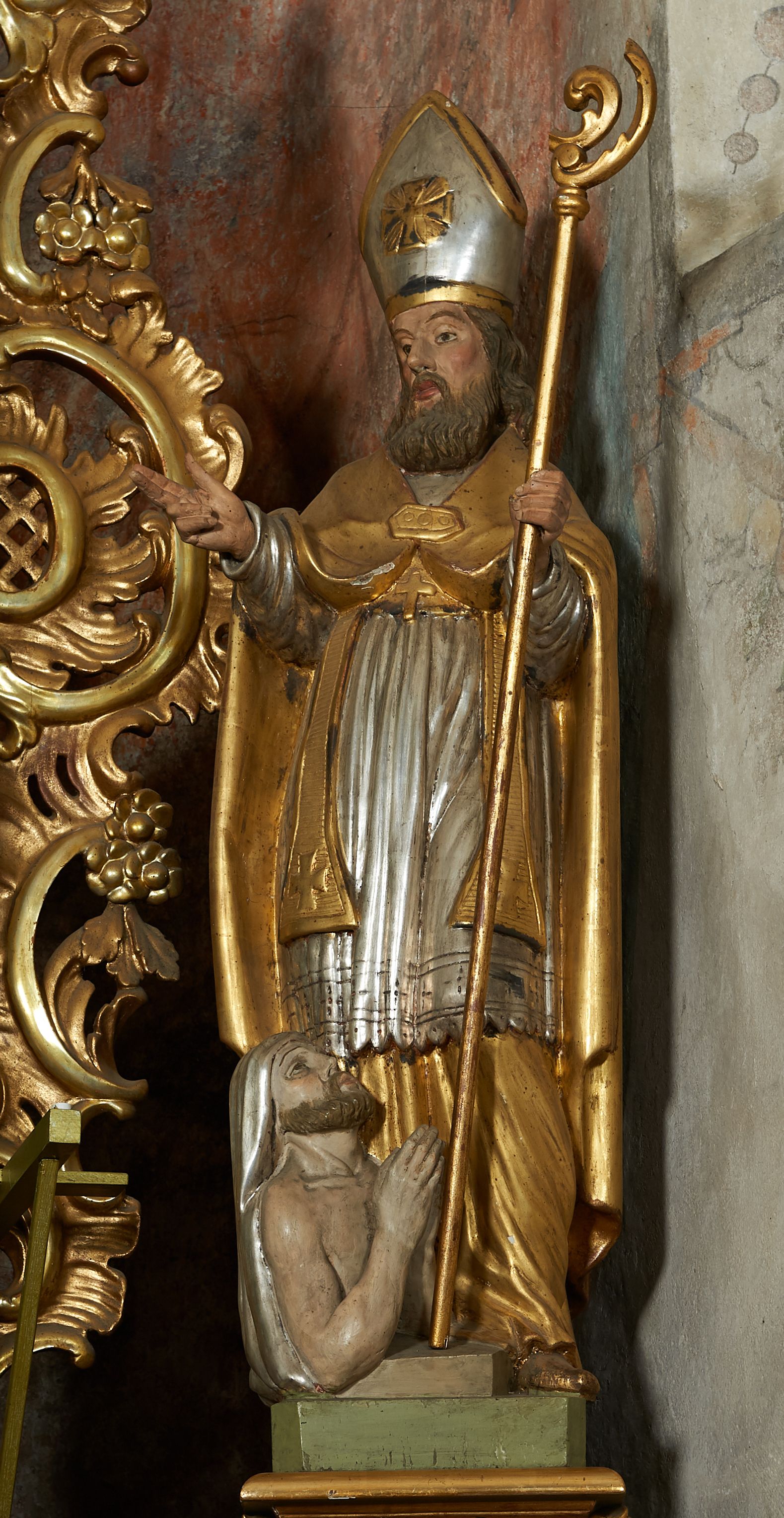 Rzeźba jest drążona i ścięta z tyłu, ustawiona na niskiej podstawie na planie kwadratu. Święty zwrócony jest frontalnie, z głową skierowaną w prawo, w kontrapoście, o odchylonej delikatnie sylwetce. Obie ręce ugięte, rozłożone na boki, w lewej trzyma pastorał, prawą unosi w geście błogosławieństwa. Twarz ma pociągłą, szczupłą, o migdałowatych oczach, uniesionych brwiach, dużym nosie i pełnych, rozchylonych ustach, okoloną falowaną brodą. Włosy ma brązowe, falowane, sięgające ramion. Na głowie nosi srebrzoną i złoconą infułę z krzyżem kawalerskim w glorii. Święty ubrany jest w złoconą albę, srebrzoną rokietę i złoconą stułę, przepasane w talii. Na piersi ma pektorał, na ramionach zarzuconą złoconą kapę, zapiętą z przodu. Na stopach ma złocone buty. Przy prawej nodze świętego półpostać Piotrowina, zwróconego profilem, z uniesioną głową i dłońmi złożonymi w geście modlitwy. Twarz szczupła, z oczami skierowanymi w górę, okolona krótką brodą. Głowę ma nakrytą srebrzonym całunem opadającym na plecy, tors ma nagi. Polichromia ciała naturalistyczna.