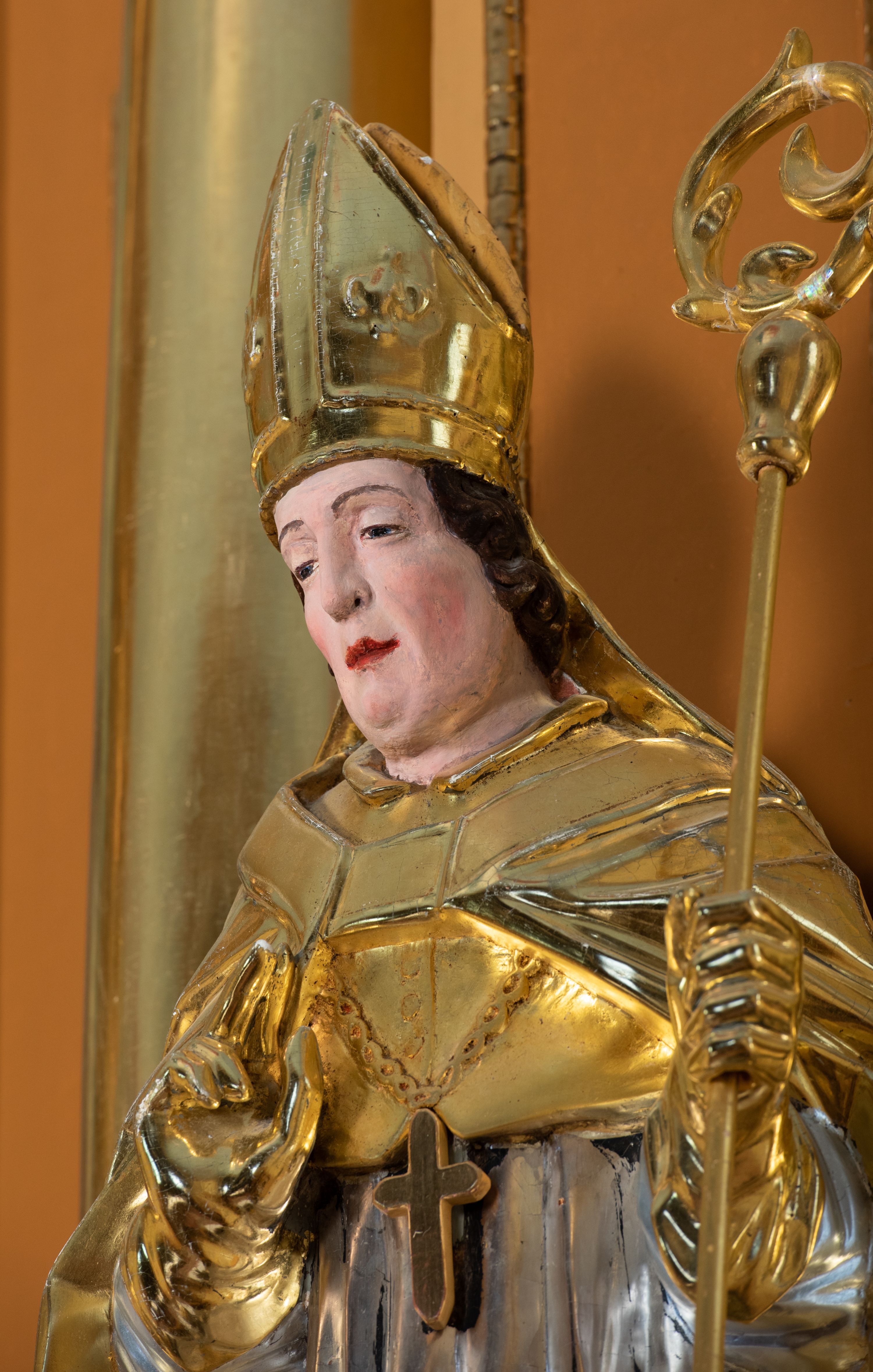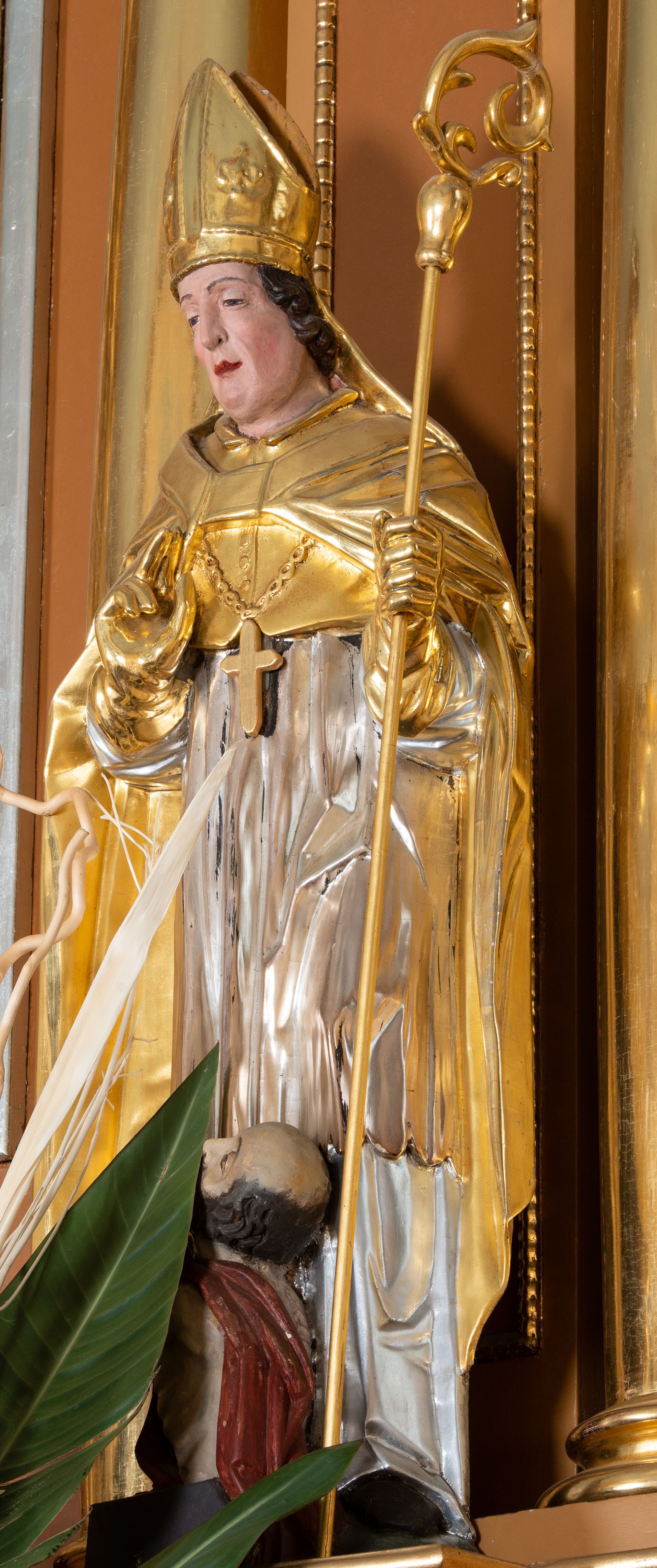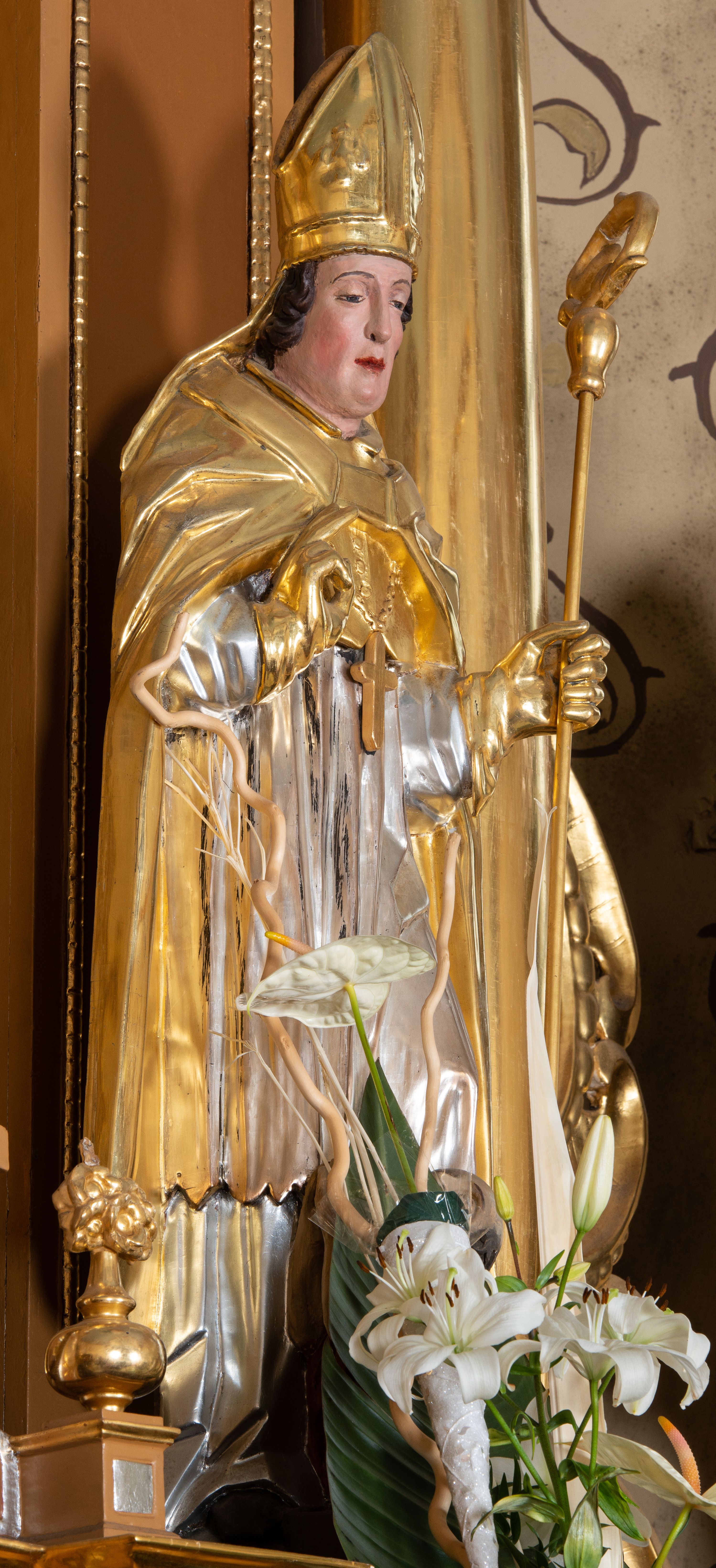 Rzeźba św. Stanisława z Piotrowiniem ścięta z tyłu i drążona, ustawiona na ciemnozielonym cokole. Święty ukazany jest frontalnie w delikatnym kontrapoście z lewą nogą ugiętą w kolanie. Prawą dłonią czyni gest błogosławieństwa, a w lewej trzyma pastorał. Twarz podłużna o dużym nosie z silnie zaznaczonym podbródkiem, przymkniętych oczach, okolona średniej długości ciemnobrązowymi włosami zasłaniającymi uszy. Święty ubrany jest w srebrzoną albę i rokietę oraz w złocony mucet, kapę, rękawice i infułę; na szyi ma założony złocony krzyż pektoralny. Tkaniny są obficie drapowane w rurkowate i równoległe fałdy, u spodu łamane. U nóg św. Stanisława ukazana jest z lewego profilu półpostać nagiego, z czerwonym całunem przerzuconym przez ramię Piotrowina z uniesionymi rękami złożonymi w geście modlitwy. Sylwetka wychudzona, karnacja szara, głowa okolona częściowo łysiną. Polichromia naturalistyczna w odsłoniętych partiach ciała św. Stanisława.