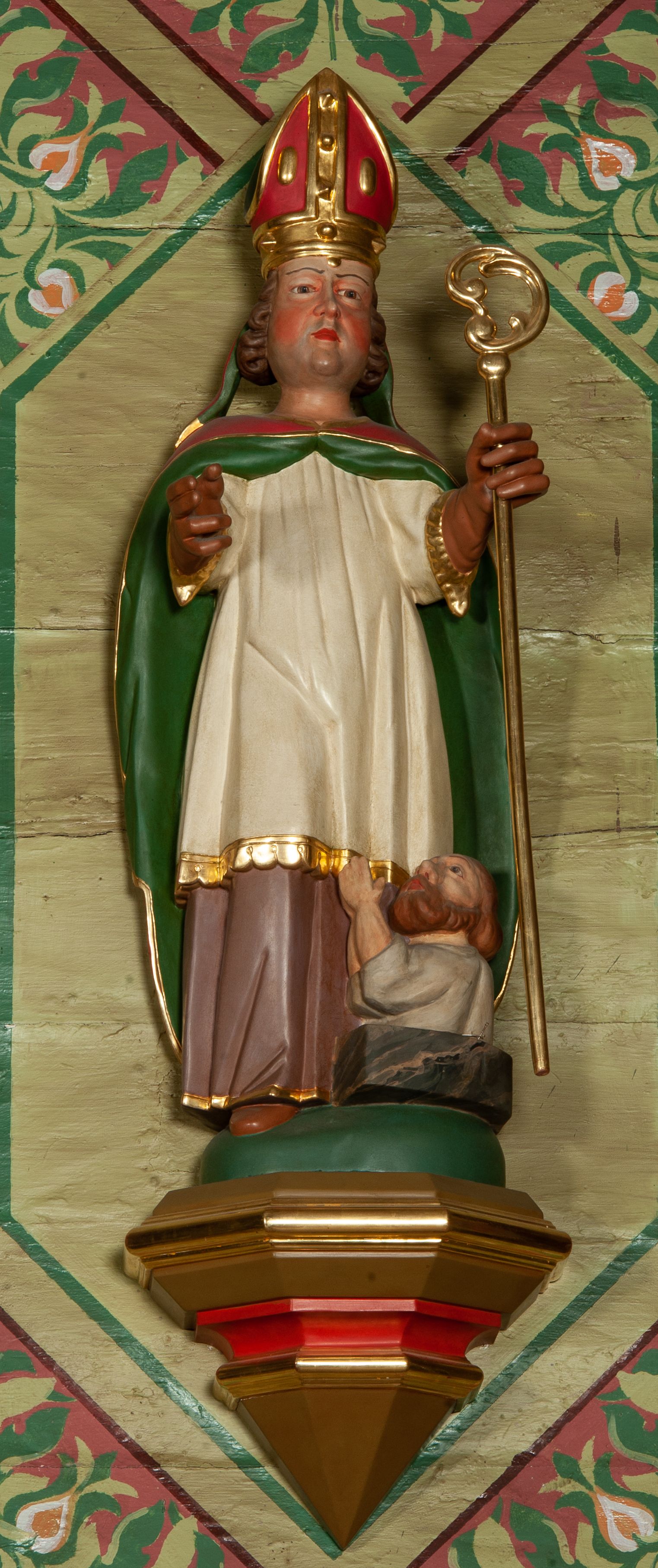 Figura ścięta, na cokole. Święty Stanisław został ukazany w pozycji stojącej z uniesionymi rękami, w lewej dłoni trzymając pastorał. Twarz ma pociągłą, o drobnych rysach. Jest ubrany w fioletową albę, białą komżę z pasem złotej koronki u spodu oraz czerwoną kapę podbitą zielenią. Włosy ma kręcone, zaczesane do tyłu, na głowie czerwoną infułę ze złotymi ozdobami; rękawiczki i buty brązowe. Po prawej stronie, u stóp biskupa ukazany został Piotrowin, w popiersiu, z głową wzniesioną w stronę św. Stanisława, z rękami złożonymi w geście modlitewnym. Ma bujny zarost, jest ubrany w szarą koszulę. Polichromia w odsłoniętych partiach ciała naturalistyczna.