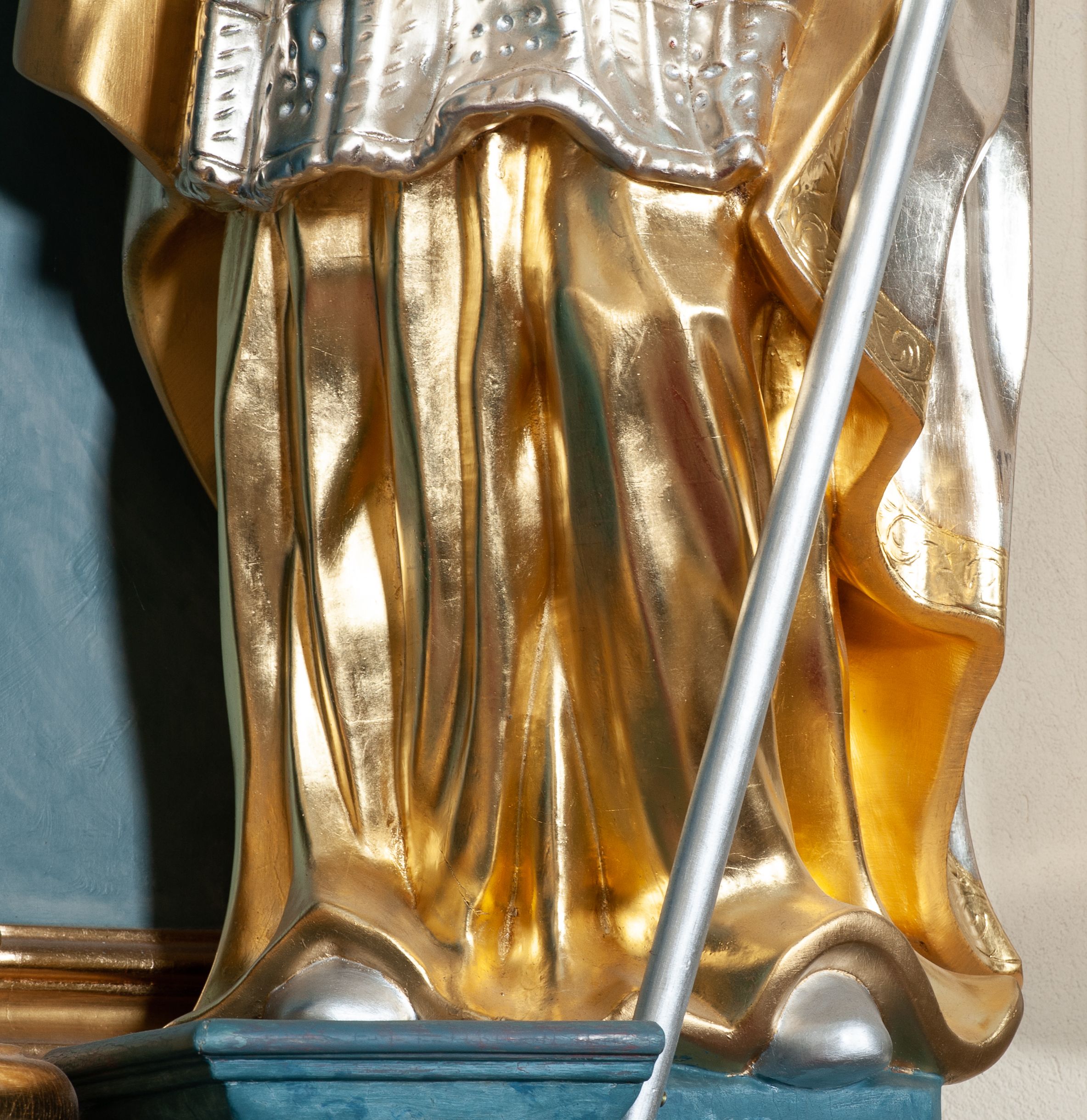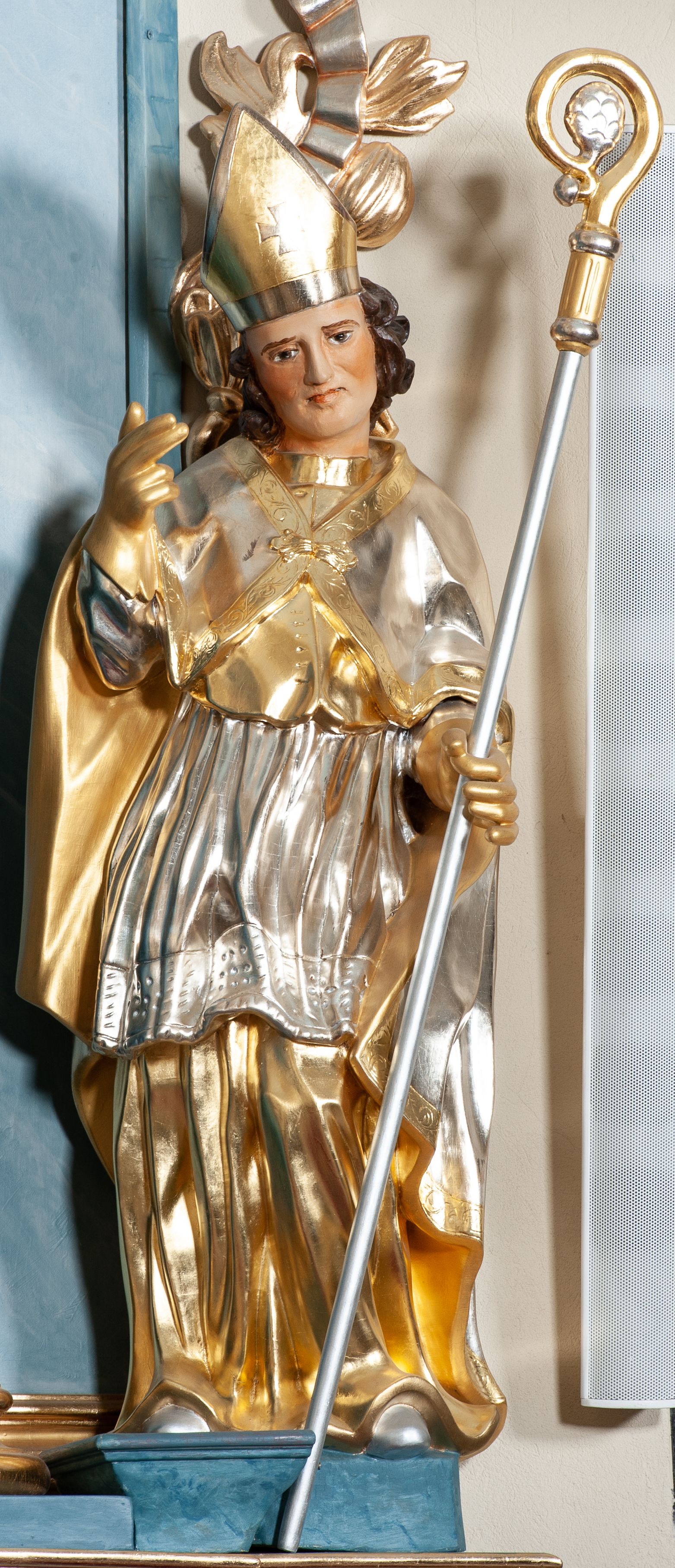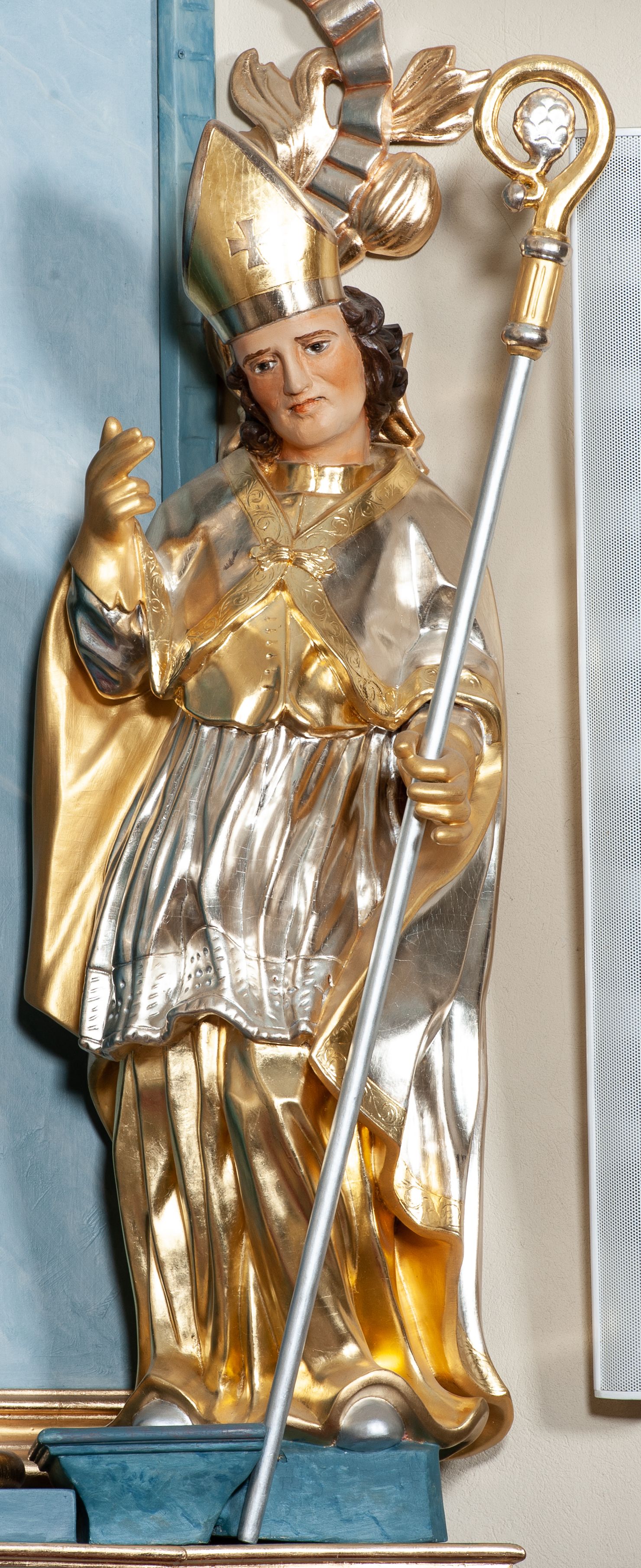 Rzeźba drążona, na cokole. Święty zwrócony frontalnie, w kontrapoście, o esowato wygiętej sylwetce, z głową przechyloną na prawe ramię. Prawą rękę unosi w geście błogosławieństwa, w lewej trzyma pastorał. Twarz ma pociągłą, oczy niewielkie, wydatny nos. Włosy długie, kręcone, opadające na ramiona. Jest ubrany w złoconą albę, srebrzoną komżę z koronką przy brzegu, złocony mucet z guzikami oraz srebrzony płaszcz zapięty na piersi, ze złoconą lamówką i podbiciem; na głowie ma złoconą infułę, na dłoniach rękawiczki. Polichromia naturalistyczna w odsłoniętych partiach ciała, strój i atrybuty złocone i srebrzone.