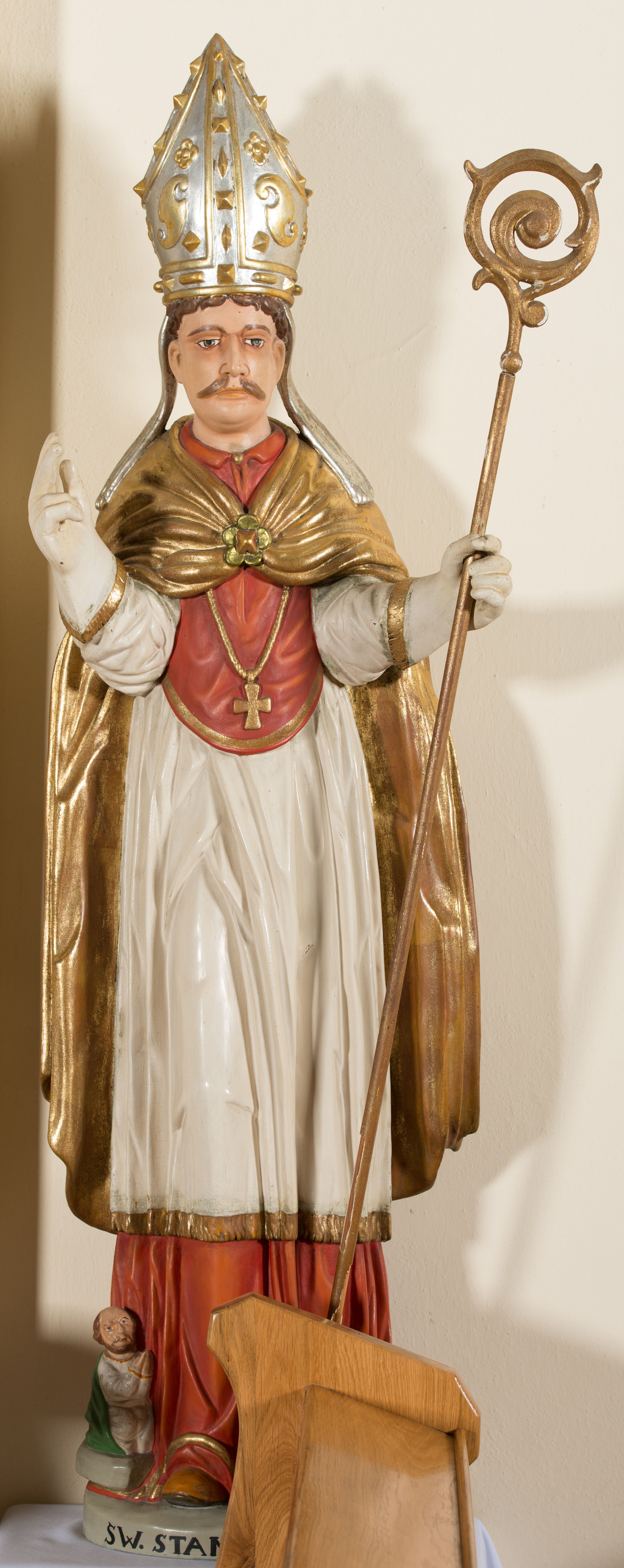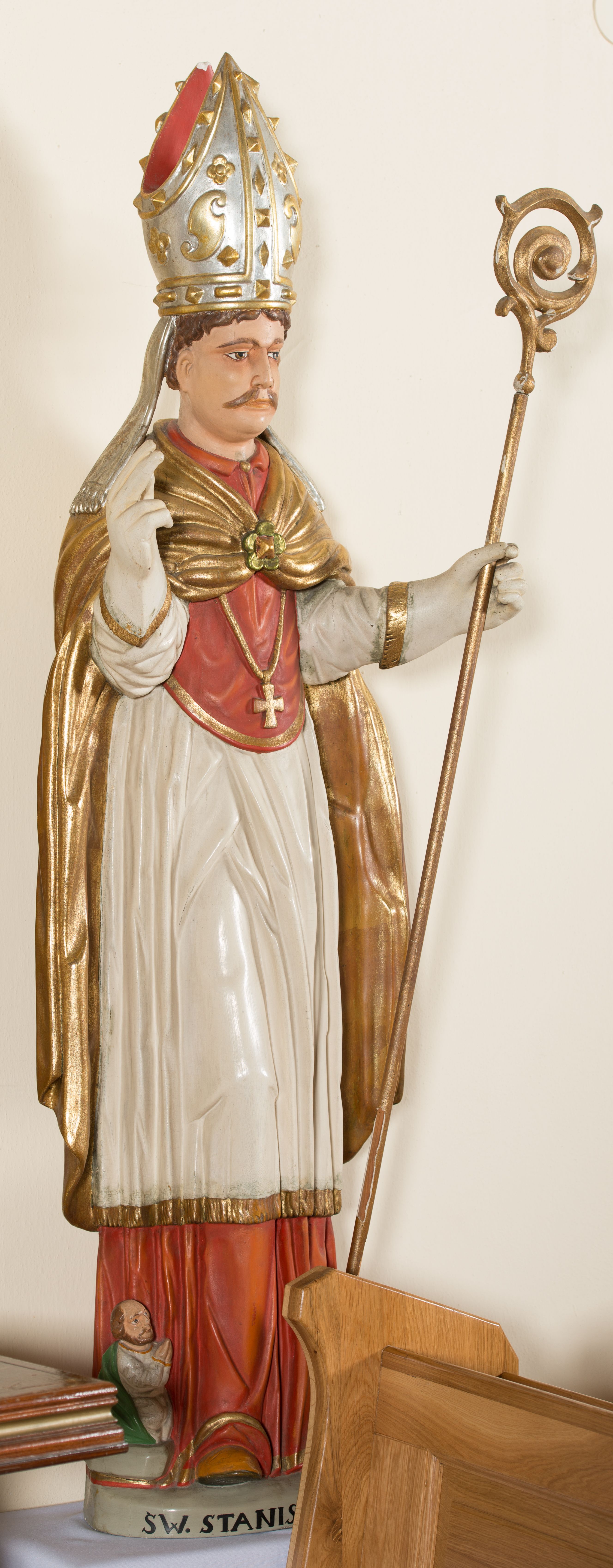 Rzeźba ścięta z tyłu, przedstawia św. Stanisława. Święty ukazany w postawie stojącej na niskim cokole, frontalnie, w statycznej pozie, z rękami wyciągniętymi do przodu i odwiedzionymi delikatnie na boki: prawą wykonuje gest błogosławieństwa, w lewej trzyma pastorał. Ma szeroką twarz, z długim i prostym nosem, wzrokiem skierowanym na wprost oraz wąsy. Włosy krótkie, kędzierzawe, ciemnobrązowe. Święty jest ubrany jest w czerwoną sutannę, białą rokietę zdobioną na brzegach złoceniem, czerwony mucet, złotą kapę, spiętą na piersiach broszą, białe rękawice, jasnobrązowe buty oraz srebrzoną infułę, zdobioną złoconymi kaboszonami, rautami, motywami w kształcie litery „S” oraz czteropłatkowymi kwiatami. Na piersi ma zawieszony złocony krzyż pektoralny. Obok jego prawej nogi znajduje się mała klęcząca postać Piotrowina ze złożonymi rękami, ubranego w białą, długą suknię i zielony płaszcz. Polichromia w odsłoniętych partiach ciała jest naturalistyczna. Cokół jasnozielony, z przodu czarno malowany napis: „ŚW(IĘTY) STANISŁAW.”
