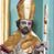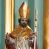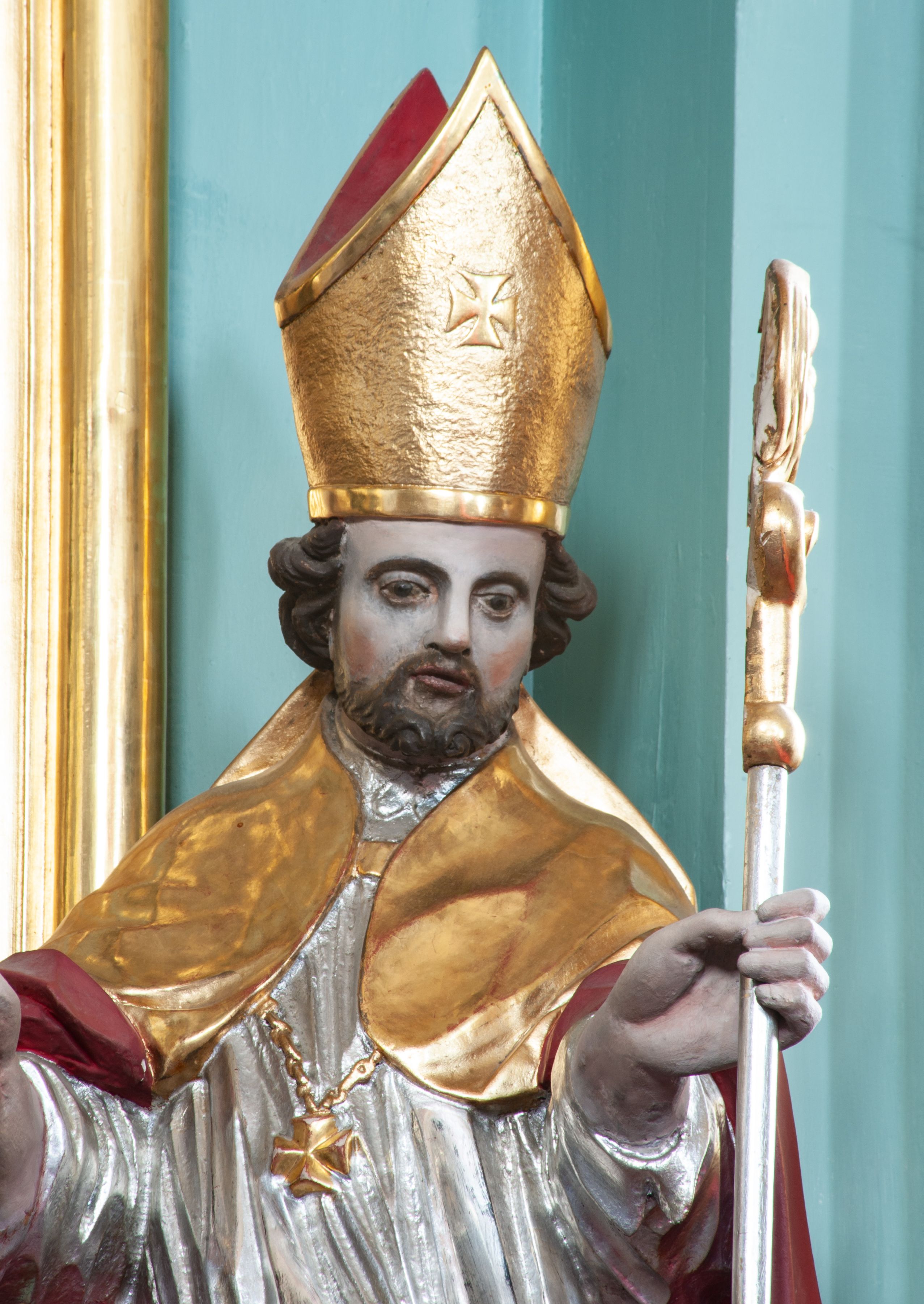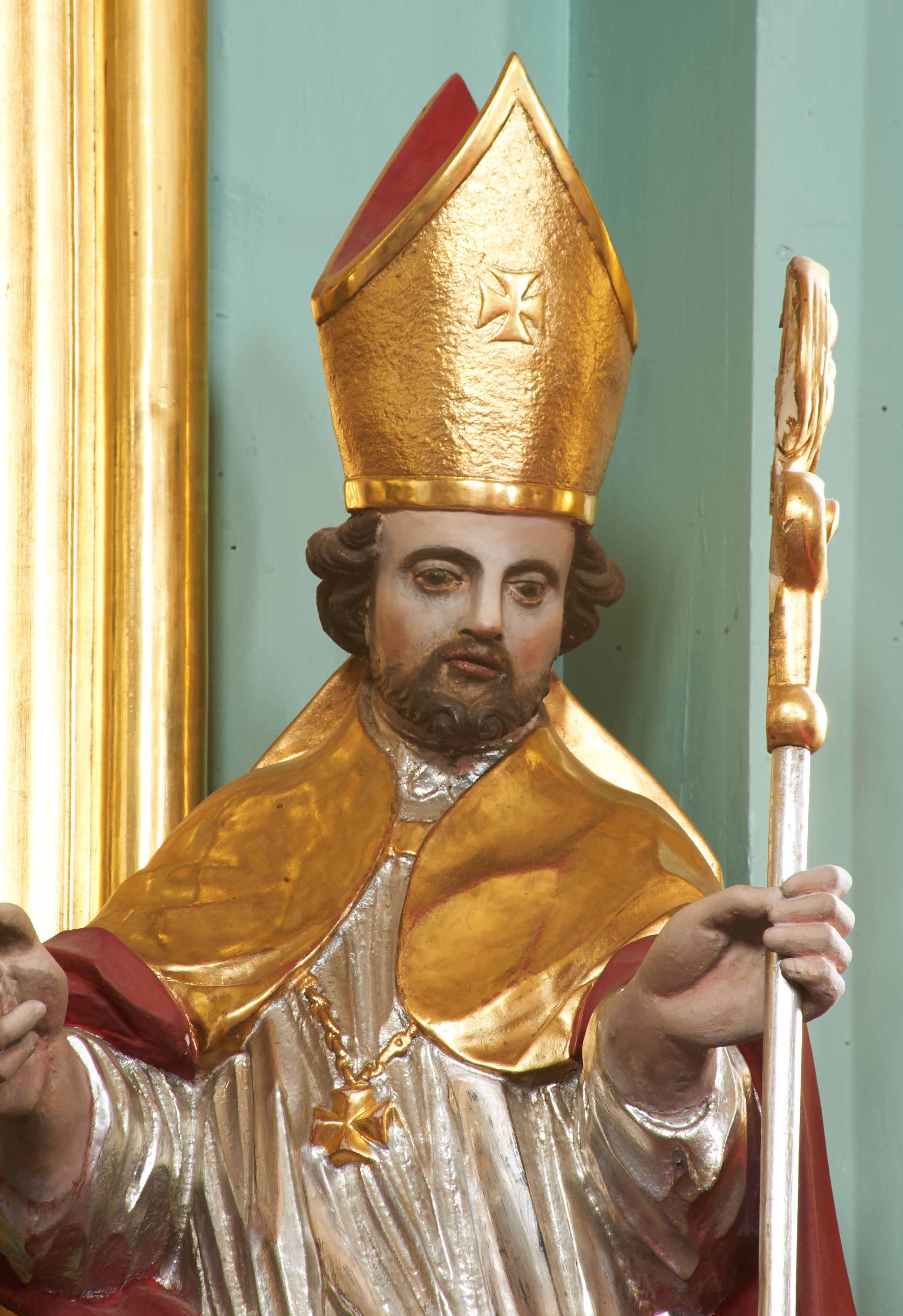 Rzeźba pełna, ustawiona na niskiej podstawie. Święty ukazany frontalnie, w kontrapoście, o esowato wygiętej sylwetce, obie ręce ma ugięte, wyciągnięte do przodu, prawa dłoń w geście błogosławieństwa, w drugiej trzyma pastorał. Twarz ma kwadratową, o migdałowatych oczach, małym nosie i pełnych ustach, okoloną krótką, brązową brodą oraz kręconymi włosami. Ubrany jest w długą, granatową albę, srebrzoną rokietę, na piersi ma zawieszony pektorał, a na ramiona narzuconą złoconą kapę z czerwoną podszewką, zapiętą na piersi klamrą, zawiniętą na prawej nodze. Na głowie ma złoconą infułę. Przy lewej nodze świętego niewielka postać klęczącego na lewe kolano Piotrowina z dłońmi złożonymi w geście modlitwy. Polichromia ciała naturalistyczna.