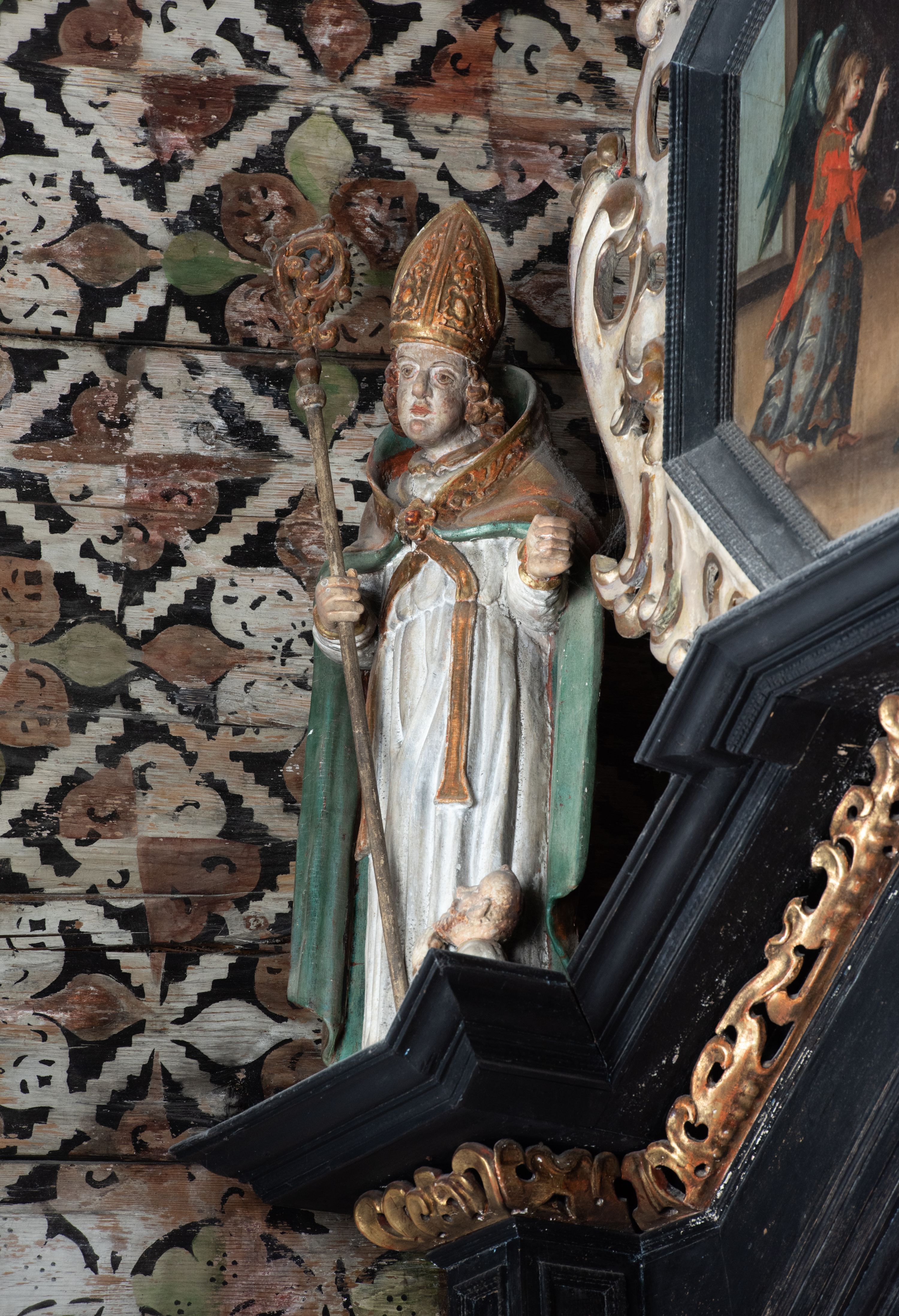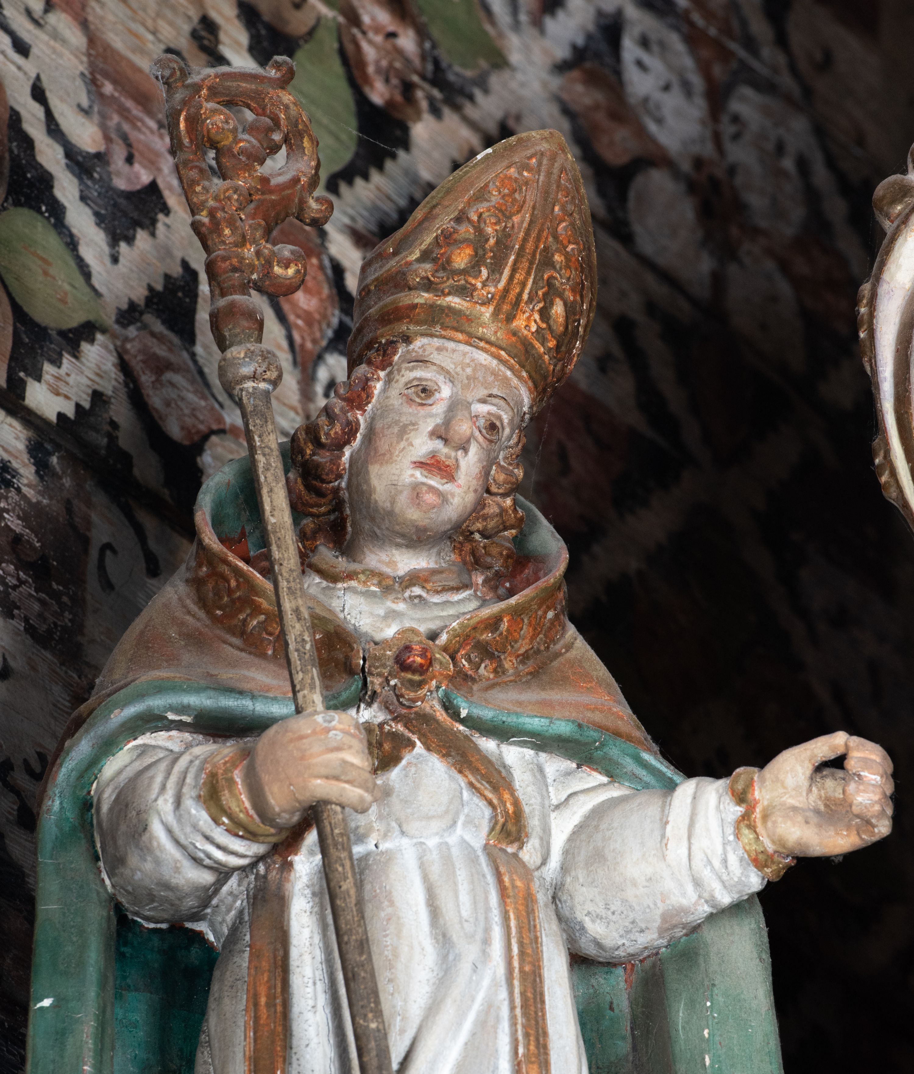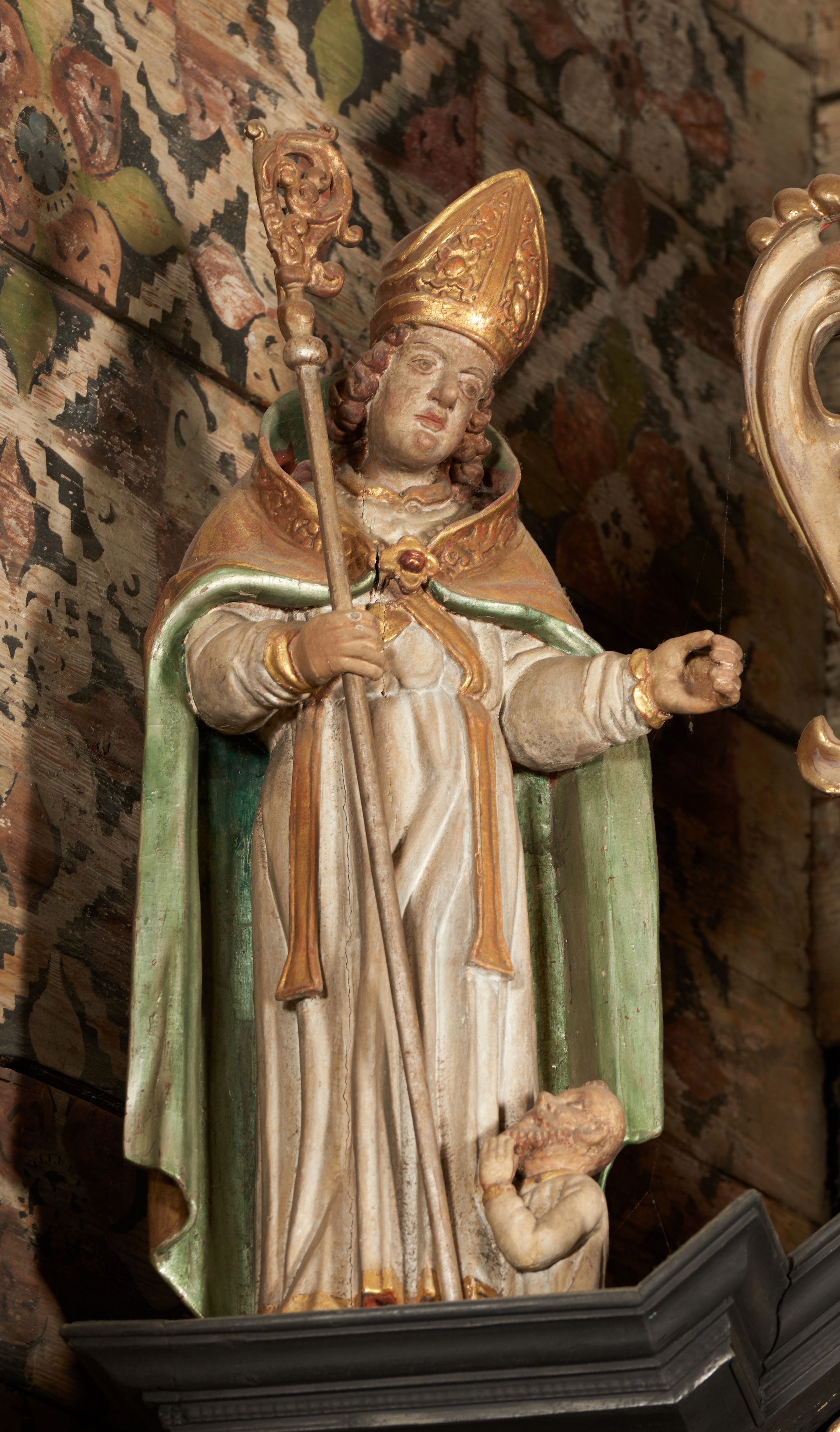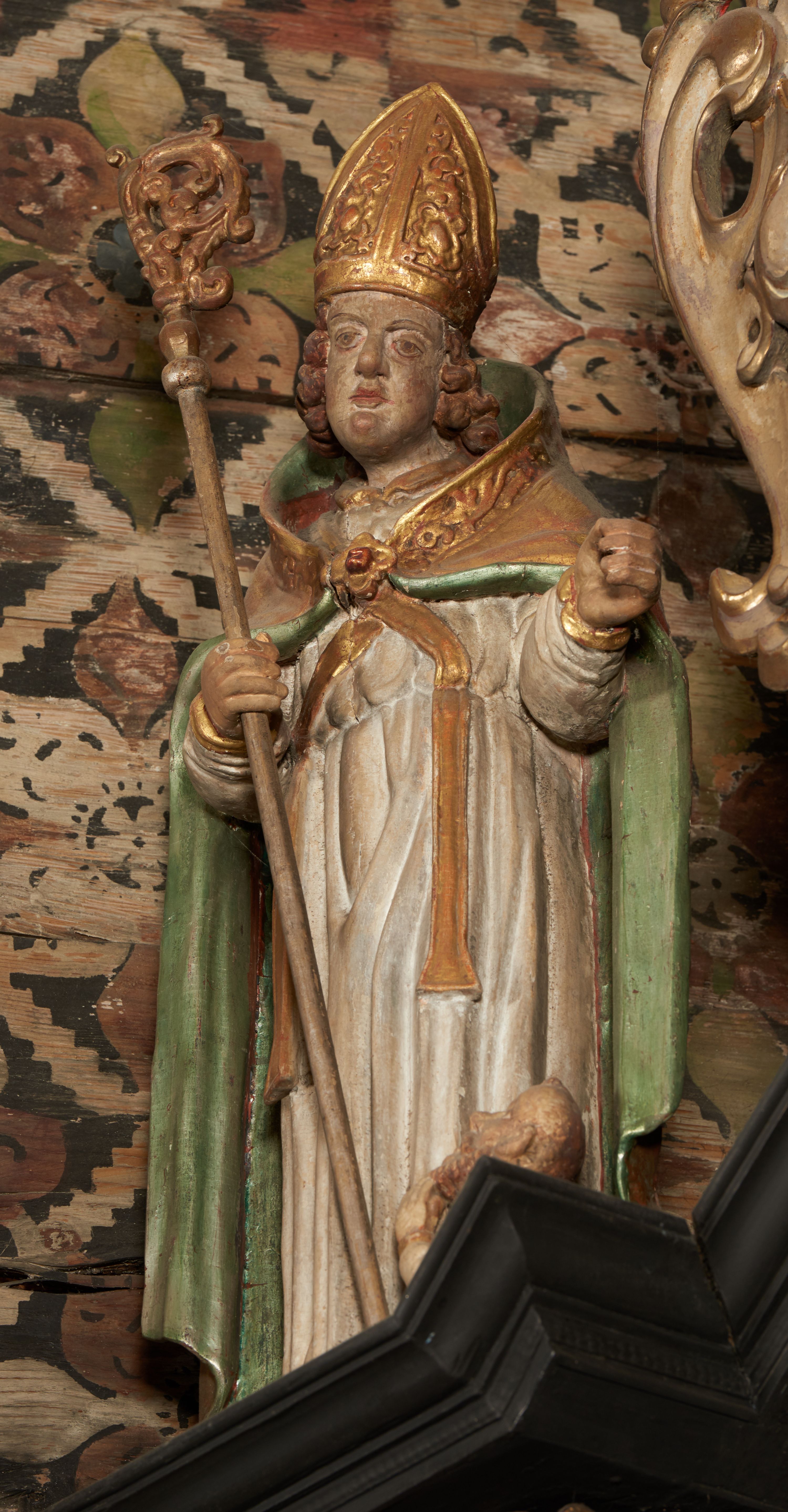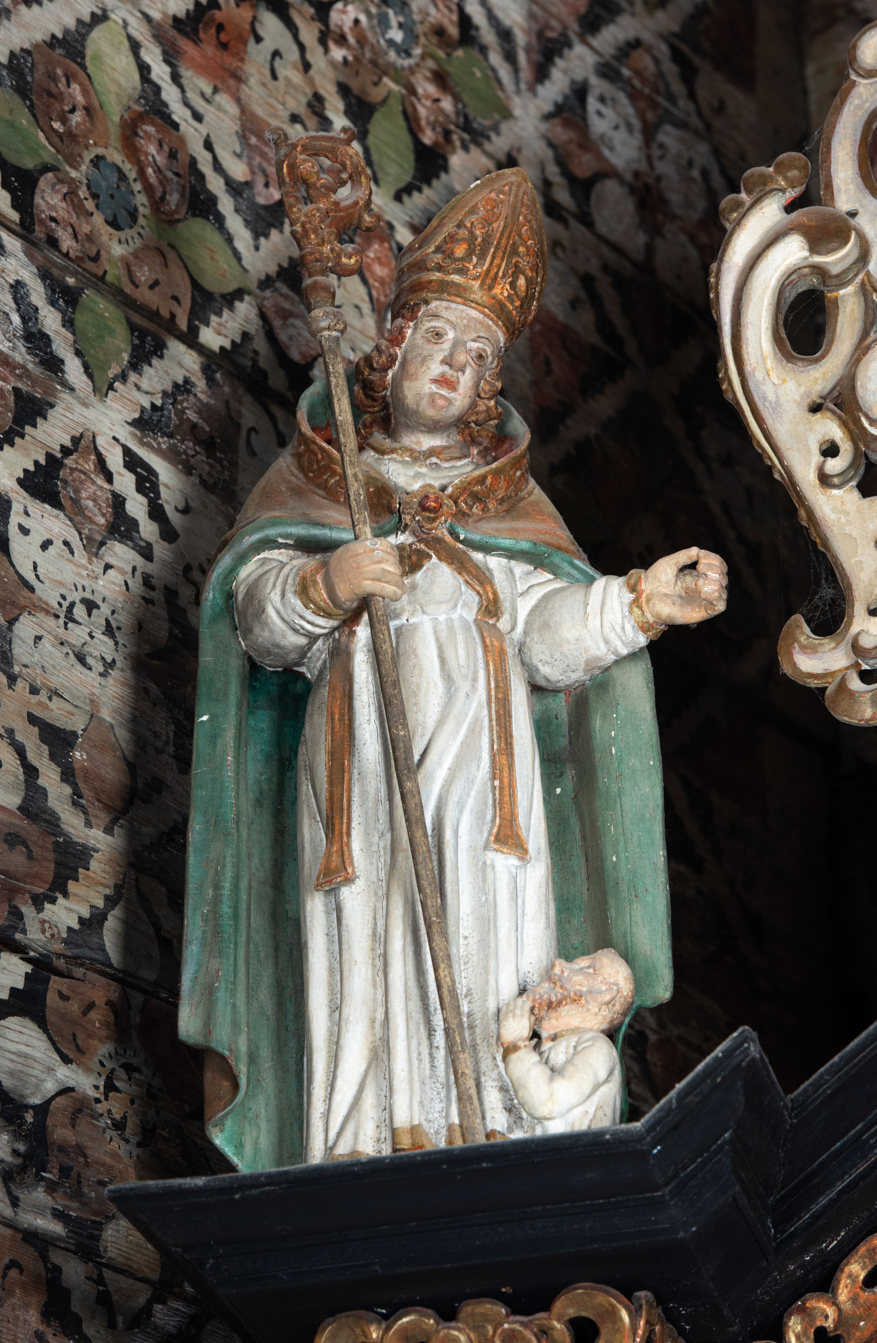 Rzeźba pełnoplastyczna, ścięta z tyłu, drążona. Święty ukazany en face, z głową przechyloną na lewe ramię. W prawej ręce trzyma pastorał, lewa wyciągnięta przed siebie. Twarz pociągła, oczy głęboko osadzone, nos prosty. Włosy kręcone, opadające na ramiona. Ubrany w białą albę, drapowaną w sztywne, rurkowe fałdy, i skrzyżowaną na piersi stułę, przepasane w talii; oraz złoconą, sztywną kapę liturgiczną, podbitą zieloną podszewką, spiętą na piersi fibulą. Na głowie infuła biskupia o rzeźbionej dekoracji. Przy lewej nodze świętego półpostać Piotrowina, ukazanego z profilu ze złożonymi w geście modlitwy dłońmi. Polichromia naturalistyczna, atrybuty złocone.
