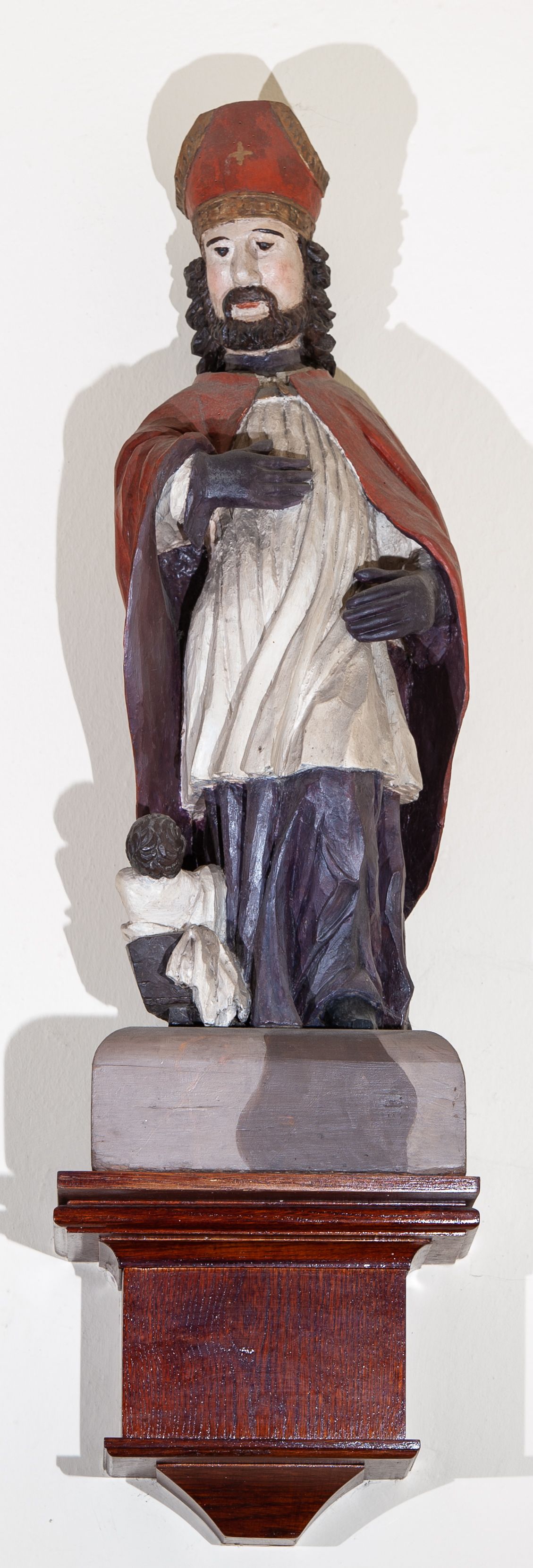 Rzeźba drewniana, pełnoplastyczna, przyścienna, polichromowana przedstawiająca św. Stanisława w stroju pontyfikalnym. Dzieło nieprofesjonalnego twórcy ludowego zapewne z XIX wieku.