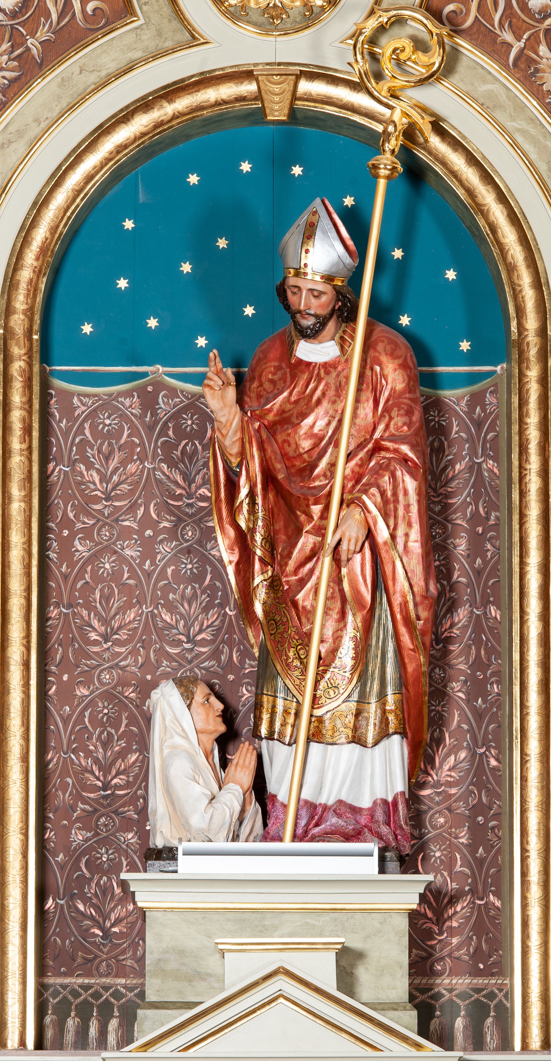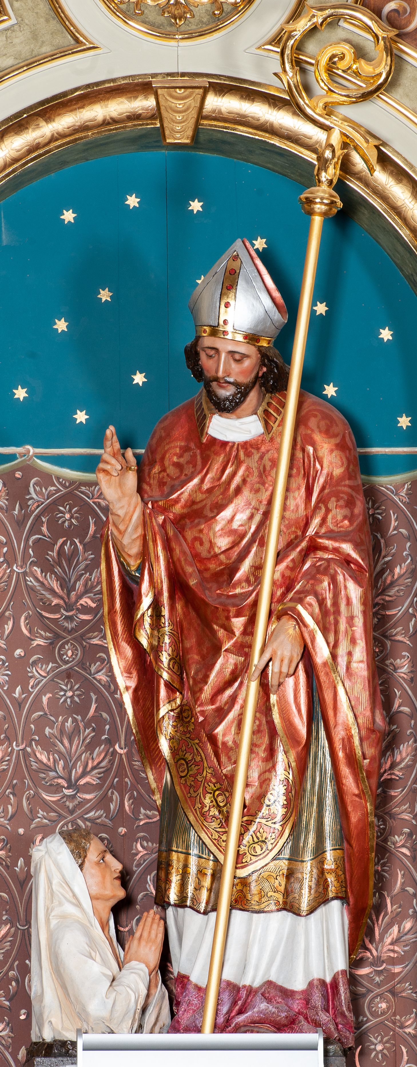 Rzeźba pełnoplastyczna przedstawiająca św. Stanisława Biskupa. Święty zwrócony jest delikatnie w prawo, pochylony delikatnie w dół w kierunku półpostaci Piotrowina. Prawą rękę wznosi ku górze w geście błogosławieństwa, w lewej opuszczonej w dół trzyma pastorał. Twarz trójkątna okolona ciemnym zarostem i długimi włosami spływającymi na plecy. Święty ubrany jest w białą albę z czerwonym pasem u dołu, wzorzysty ornat zdobiony szeroką bordiurą oraz czerwony ornat na planie koła dekorowany wicią roślinną; na głowie ma założoną srebrną infułę. U stóp biskupa, po lewej stronie ukazane jest popiersie Piotrowina przedstawione z prawego profilu, w białej szacie, z rękoma złożonymi w geście modlitewnym. Twarz szeroka z silnie wysuniętym podbródkiem z jasnym włosami schowanymi pod szatą, założoną na głowę. Polichromia w odsłoniętych partiach ciała naturalistyczna, detale złocone i srebrzone.