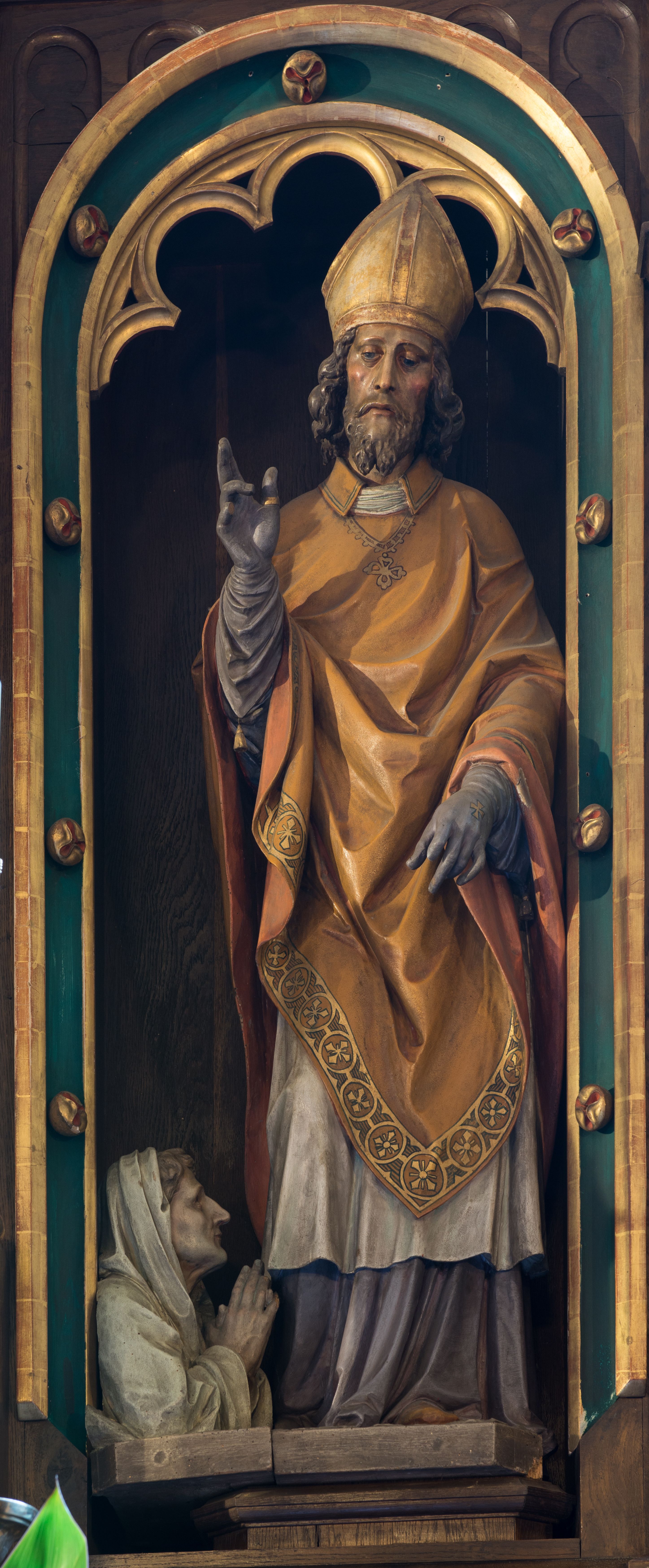 Rzeźba wolnostojąca, pełnoplastyczna przedstawiająca św. Stanisława z Piotrowinem, ukazana frontalnie, w delikatnym kontrapoście. Święty prawą rękę unosi w geście błogosławieństwa, lewa nieco ugięta w łokciu, jest opuszczona w dół. Twarz podłużna o długim, prostym nosie, wąskich ustach, lekko przymkniętych oczach, okolona brodą rozdzieloną na końcu w dwa pukle, policzki delikatnie zarumienione. Włosy sięgające do ramion, kręcone. Święty ubrany jest w fioletową albę, białą komżę, jasnobrązowy ornat o kolistym wykroju z przodu i z tyłu zakończony w szpic z różową podszewką i z malowanym dekoracyjnym pasem na brzegach oraz krzyżem pektoralnym. Ma biały humerał pod szyją, fioletowe rękawiczki z chwostem przy brzegu oraz z malowanym złoconym krzyżem greckim, a także dwa pierścienie na prawej ręce. Na głowie ma założoną złoconą infułę. U nóg świętego, po lewej stronie znajduje się popiersie Piotrowina ukazane z prawego profilu, zwróconego w stronę św. Stanisława ze złożonymi w geście modlitwy rękami. Twarz o starczych rysach, podłużna z wąskim i długim nosem, małymi ustami i głębokimi oczodołami. Figura ubrana w biały całun zarzucony na głowę i otulający całą postać. Polichromia rzeźby św. Stanisława naturalistyczna, detale szat złocone. Rzeźby ustawione na niskich postumentach o ściętych narożach.