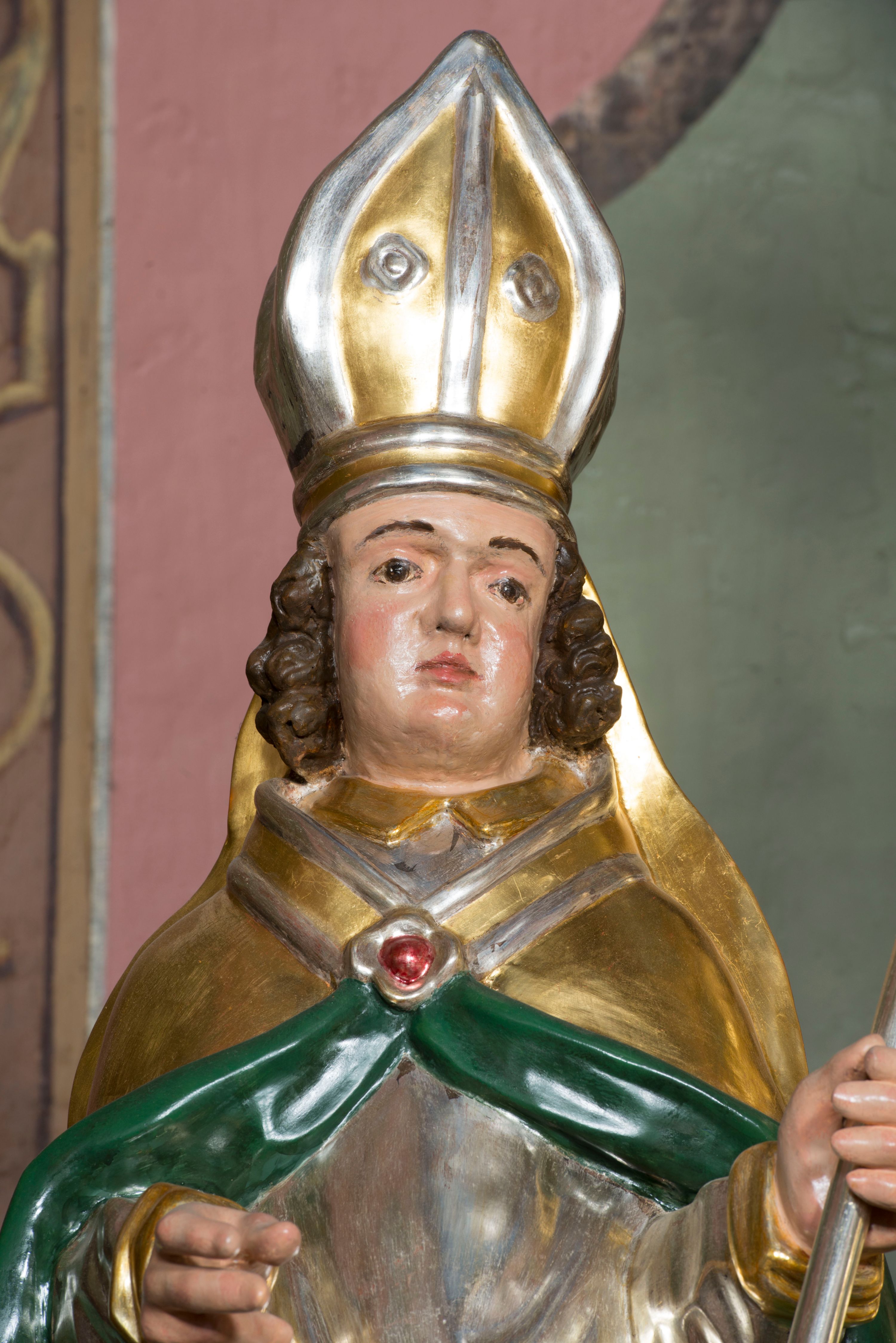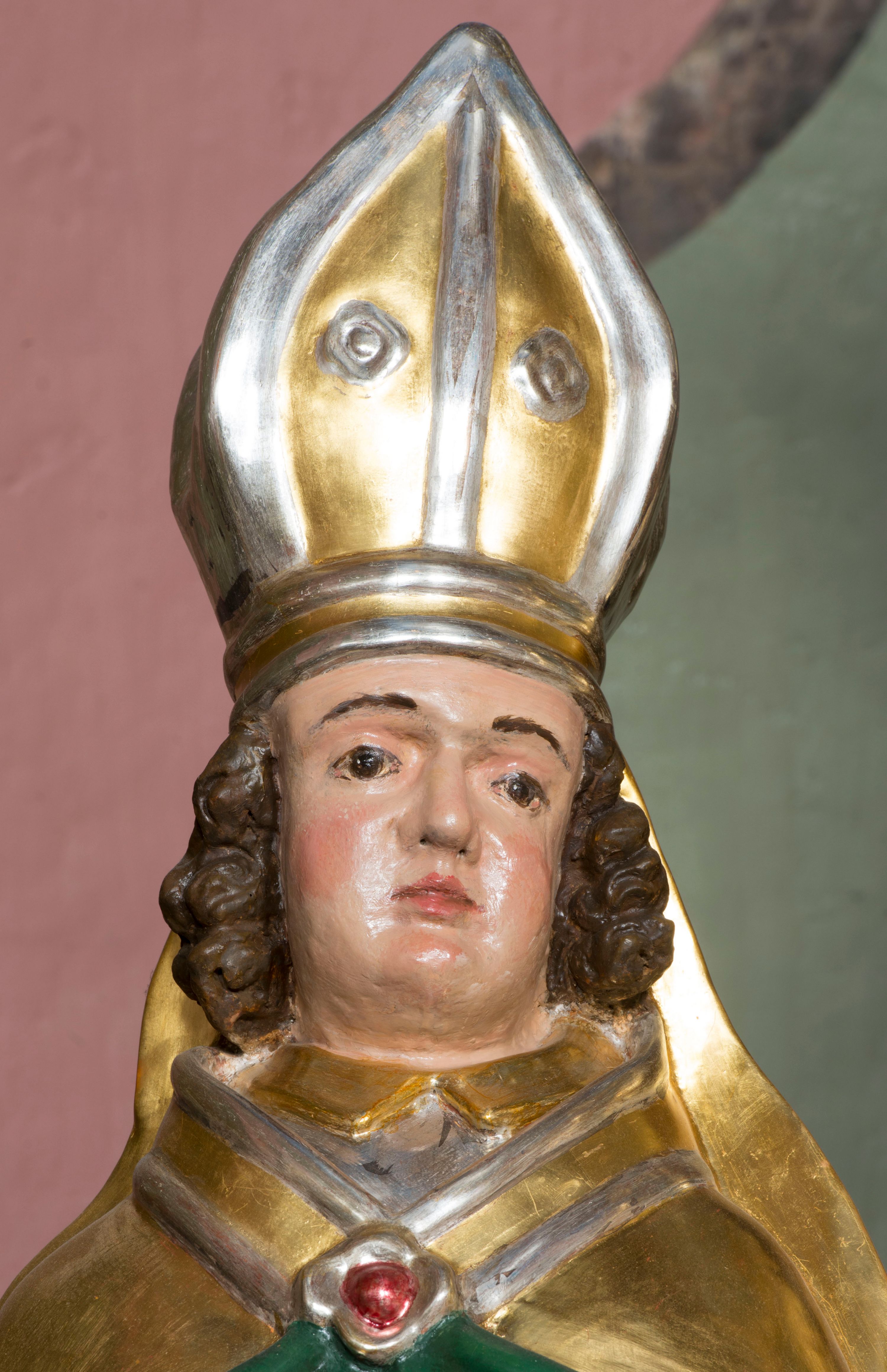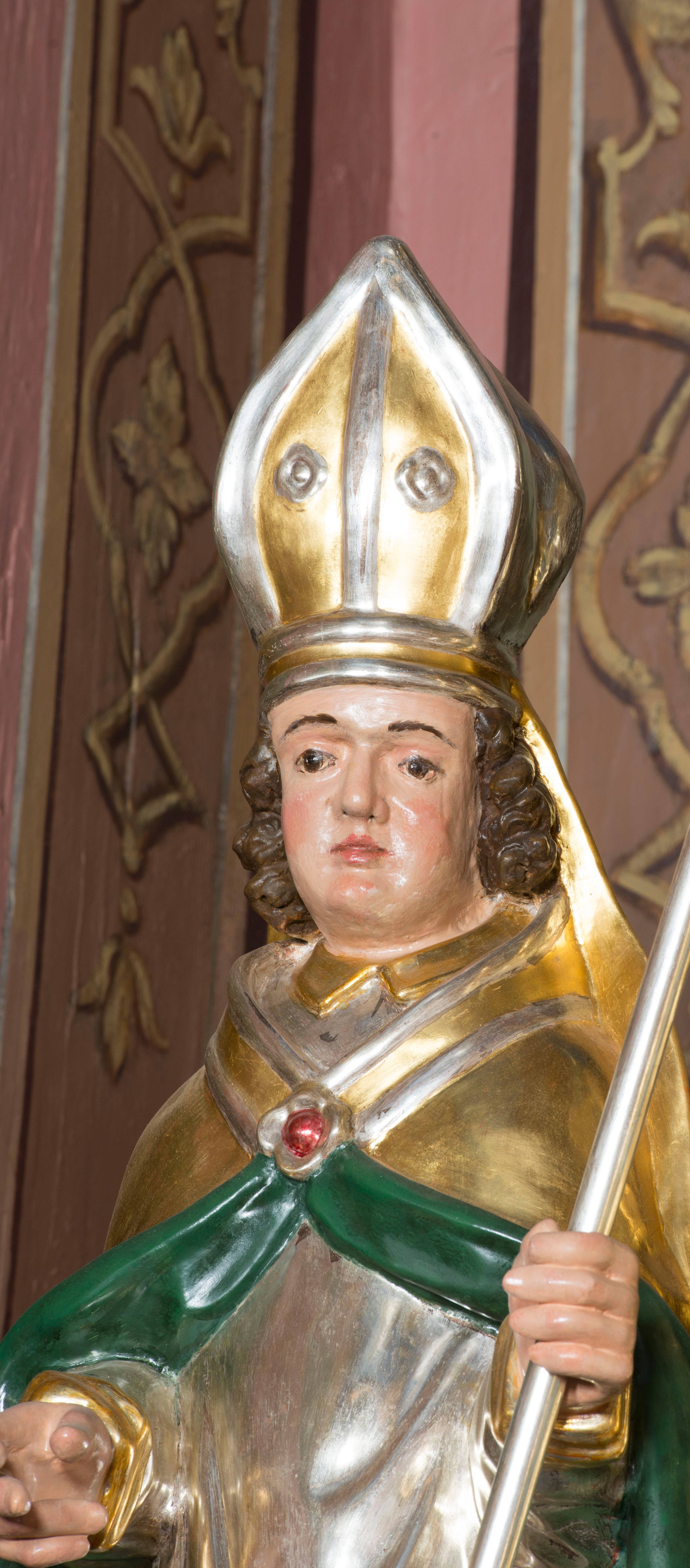 Figura przedstawiająca św. Stanisława polichromowana, niemal pełnoplastyczna, wydrążona z tyłu. Święty ukazany w pozycji stojącej, w hieratycznej pozie. Głowa przechylona lekko w lewą stronę, ręce wysunięte, skierowane w lewą stronę, w lewej dłoni święty trzyma pastorał. Twarz szeroka, schematycznie opracowana, z puklami ciemnobrązowych włosów po bokach. Święty jest ubrany w szaty biskupie: czerwoną sutannę, srebrną komżę oraz złotą kapę z zielonym podszyciem spiętą na piersi broszą, na głowie infuła.