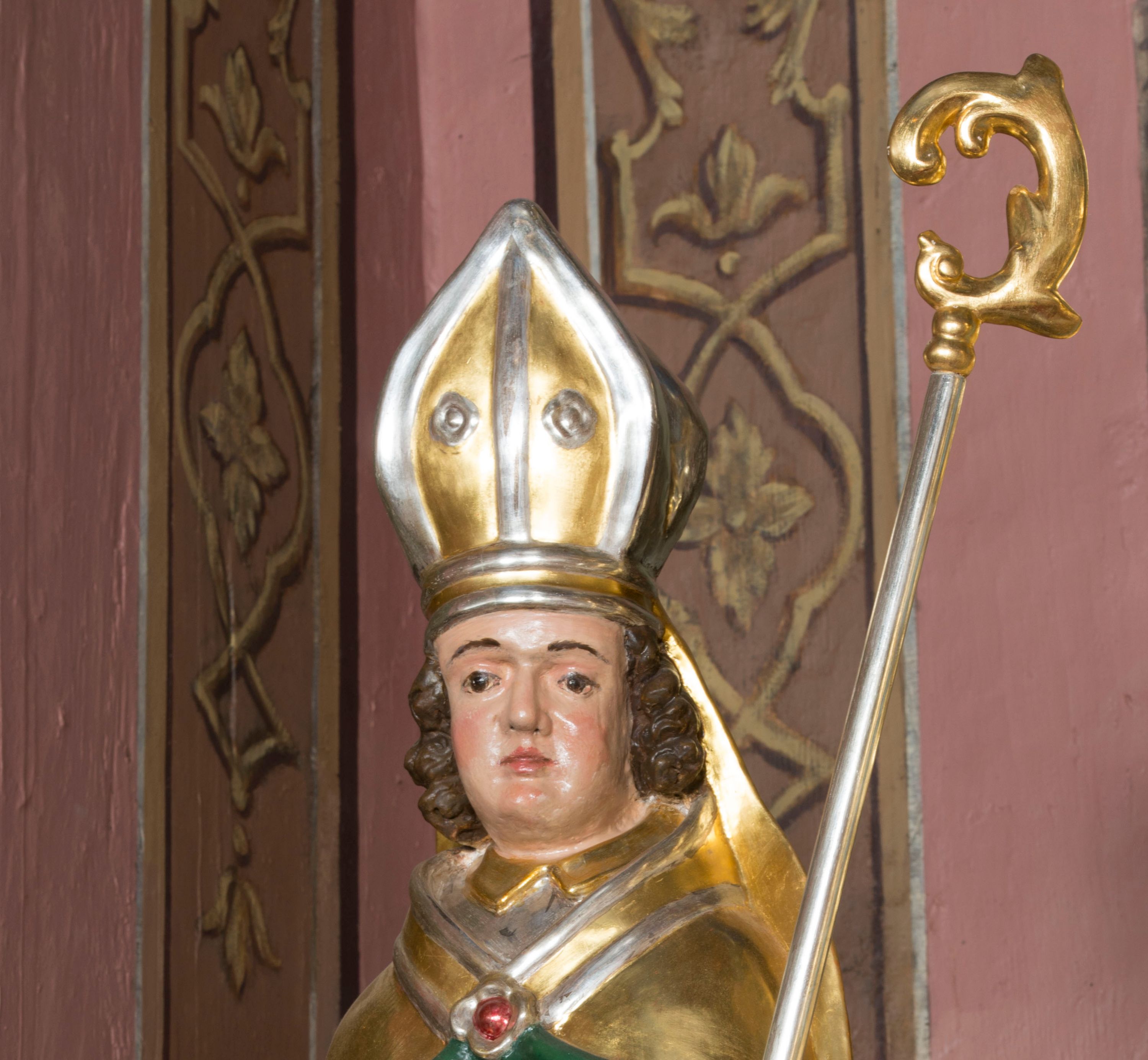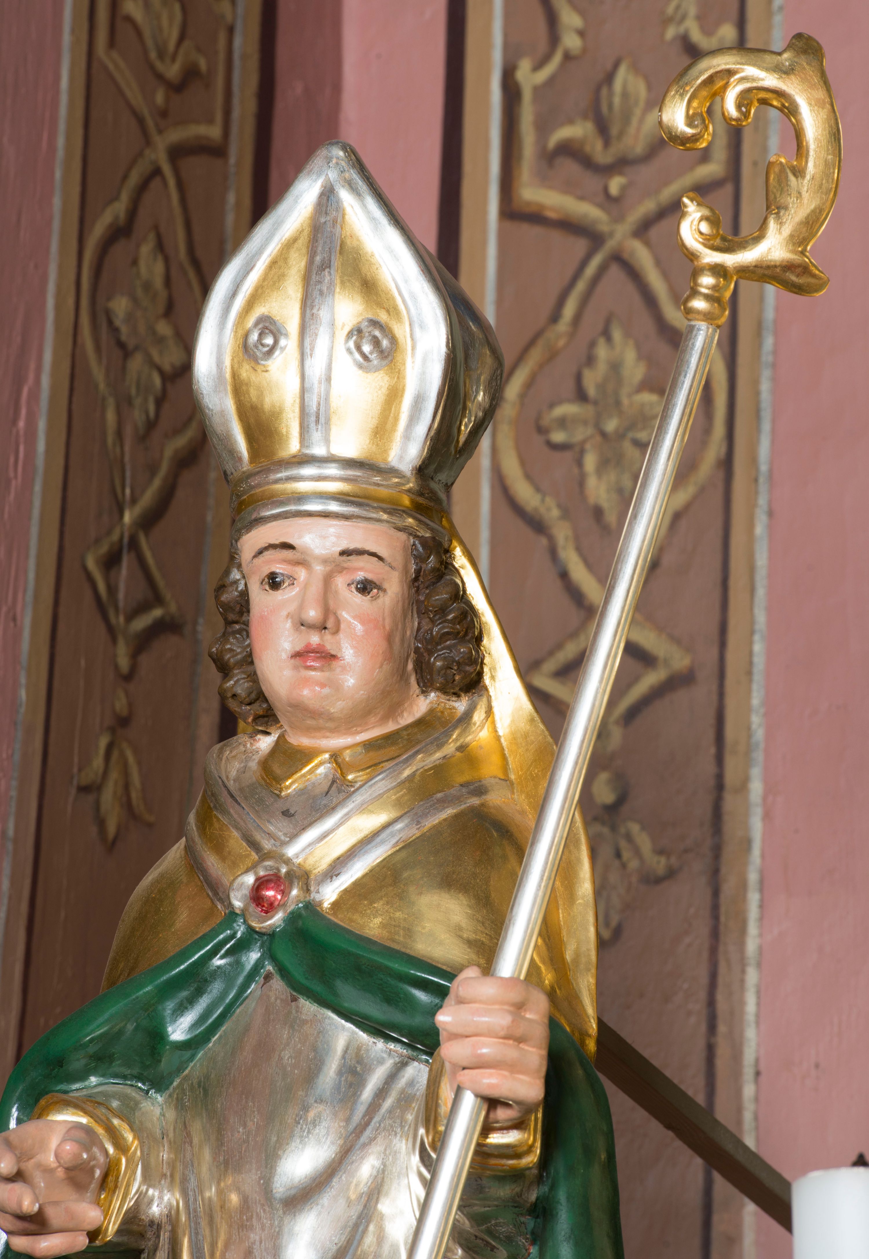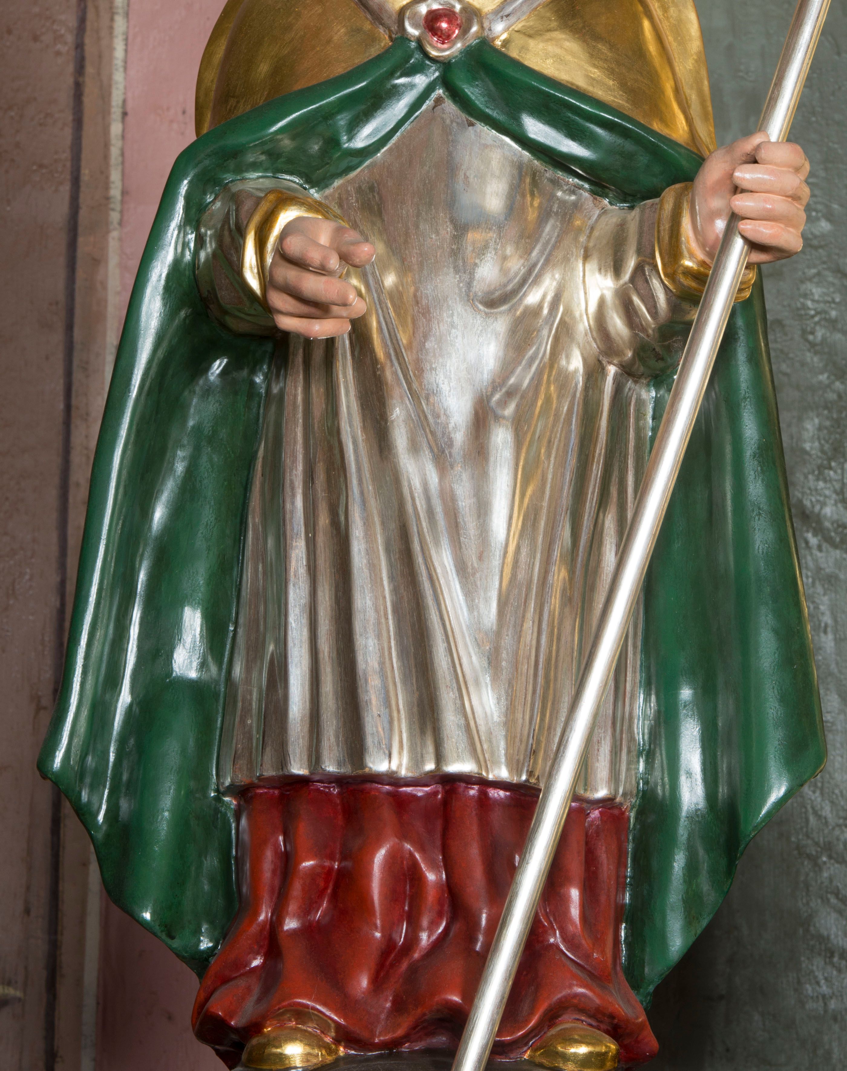 Figura przedstawiająca św. Stanisława polichromowana, niemal pełnoplastyczna, wydrążona z tyłu. Święty ukazany w pozycji stojącej, w hieratycznej pozie. Głowa przechylona lekko w lewą stronę, ręce wysunięte, skierowane w lewą stronę, w lewej dłoni święty trzyma pastorał. Twarz szeroka, schematycznie opracowana, z puklami ciemnobrązowych włosów po bokach. Święty jest ubrany w szaty biskupie: czerwoną sutannę, srebrną komżę oraz złotą kapę z zielonym podszyciem spiętą na piersi broszą, na głowie infuła.