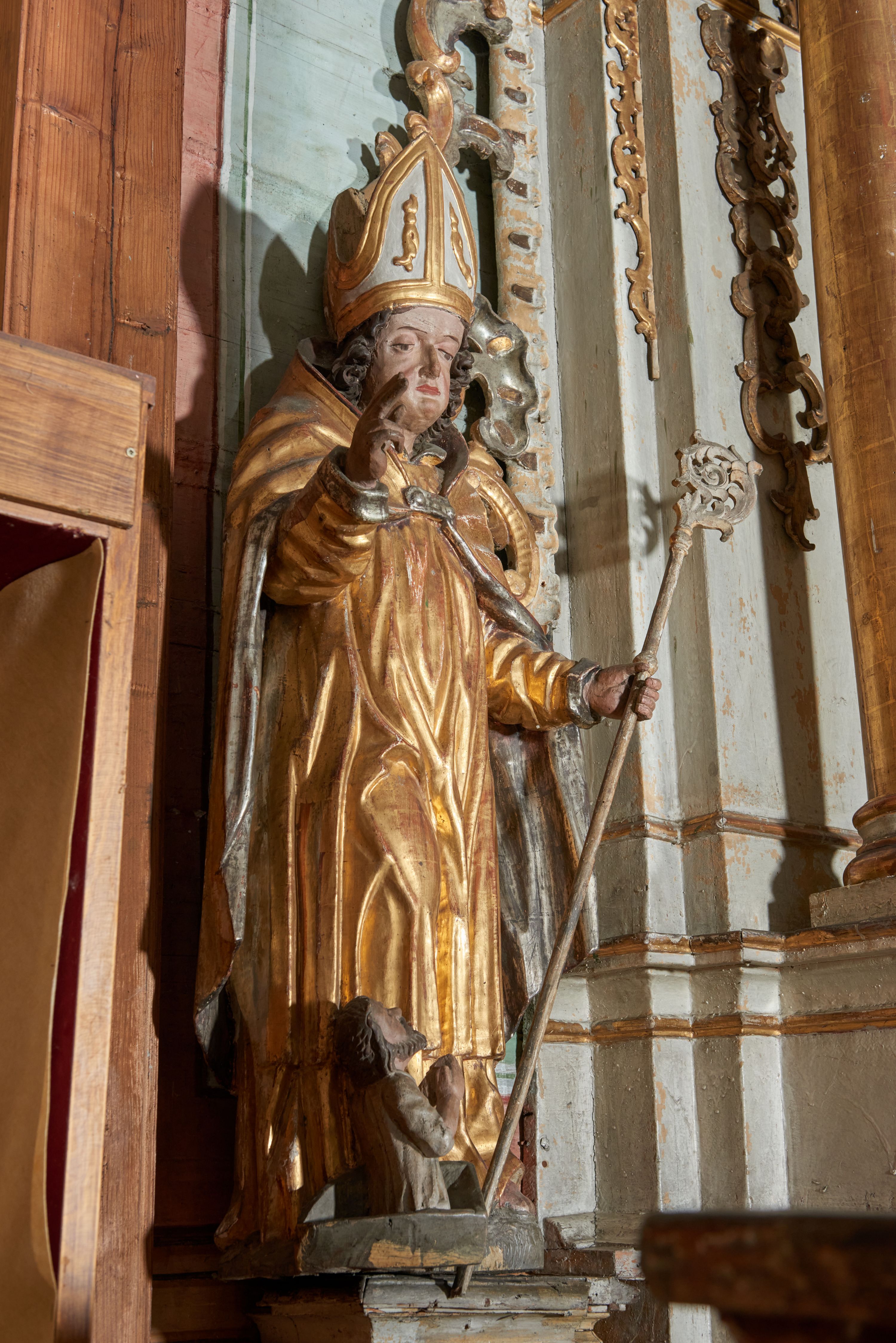 Obie figury biskupów z tego ołtarza wykonał ten sam twórca. Charakteryzuje je sztywny i blokowy sposób kształtowania wolumenu postaci. Tkanina modelowa jest w sposób uproszczony, o rytmicznie układających się prostych fałdach, łamiących się na ugiętej nodze. W obu figurach widoczny jest ten sam typ twarzy i sposób rzeźbienia włosów. Figury zostały wykonane na początku XVII wieku, ale widoczne są w nich wciąż reminiscencje późnogotyckie, szczególnie w sposobie rzeźbienia włosów, sztywnym upozowaniu i modelunku szat.