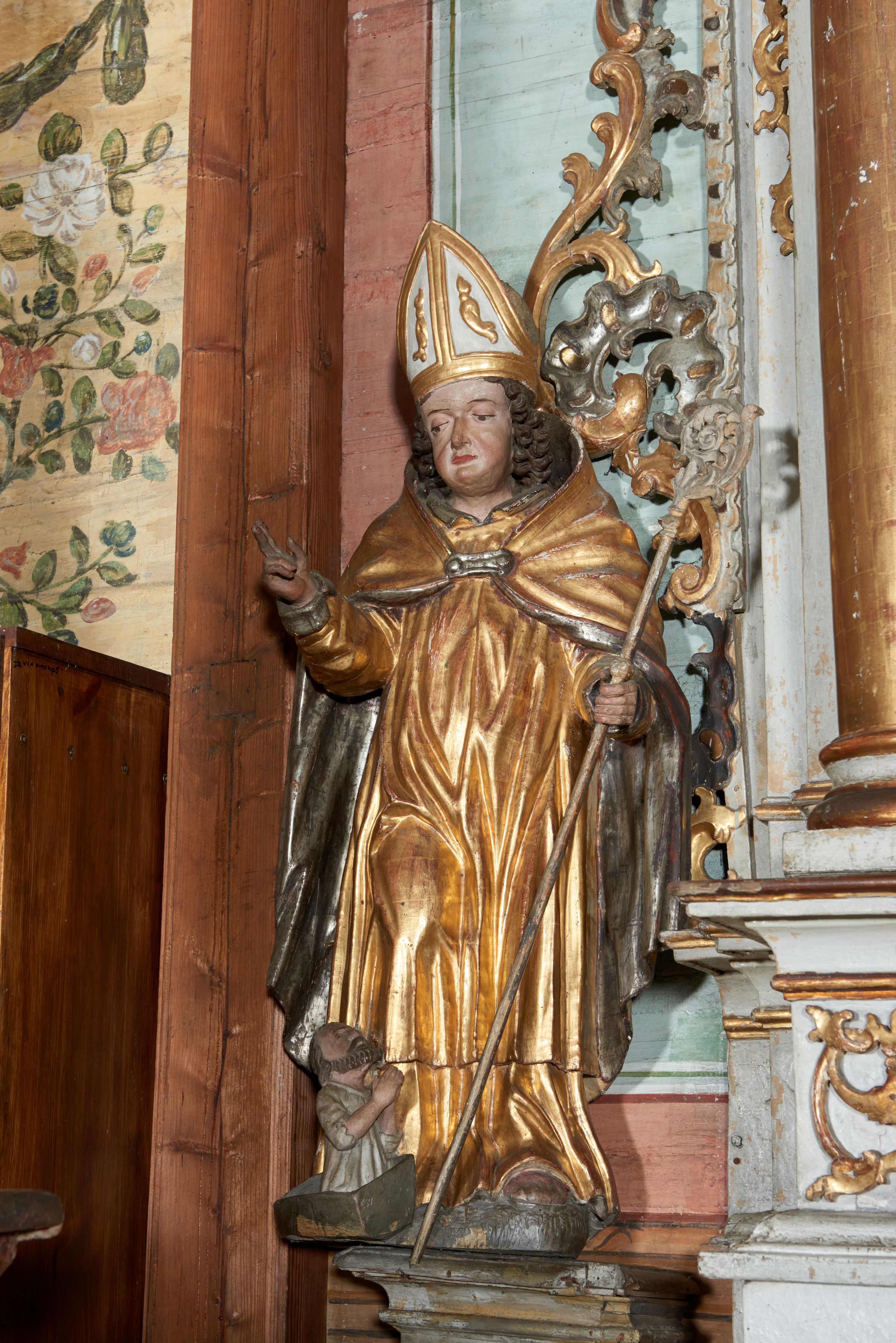Rzeźba ścięta z tyłu i drążona; ustawiona na niskiej nieregularnej podstawie. Figura ukazana frontalnie, z lekko pochyloną głową, ugiętą prawą nogą, obie ręce ma ugięte, blisko ciała, prawą lekko unosi z dłonią w geście błogosławieństwa, w lewej trzyma pastorał. Twarz ma szeroką, kwadratową, z podkreślonym podbródkiem, o dużych, opadających i półprzymkniętych oczach, sporym, ale wąskim nosie i długich ustach. Włosy sięgające ramion, głęboko rzeźbione w rytmiczne, pojedyncze pukle. Święty ubrany w długą albę, rokietę oraz kapę zarzuconą na ramiona i plecy, zapiętą na piersi klamrą. Na głowie ma infułę, lamowaną taśmami, dekorowaną ornamentem. Przy lewej nodze świętego niewielką postać Piotrowina, klęczącego w skrzyni, ukazanego z profilu, z głową skierowaną w górę i rękami złożonymi w geście modlitwy. Polichromia ciała naturalistyczna, szaty złocone i srebrzone.