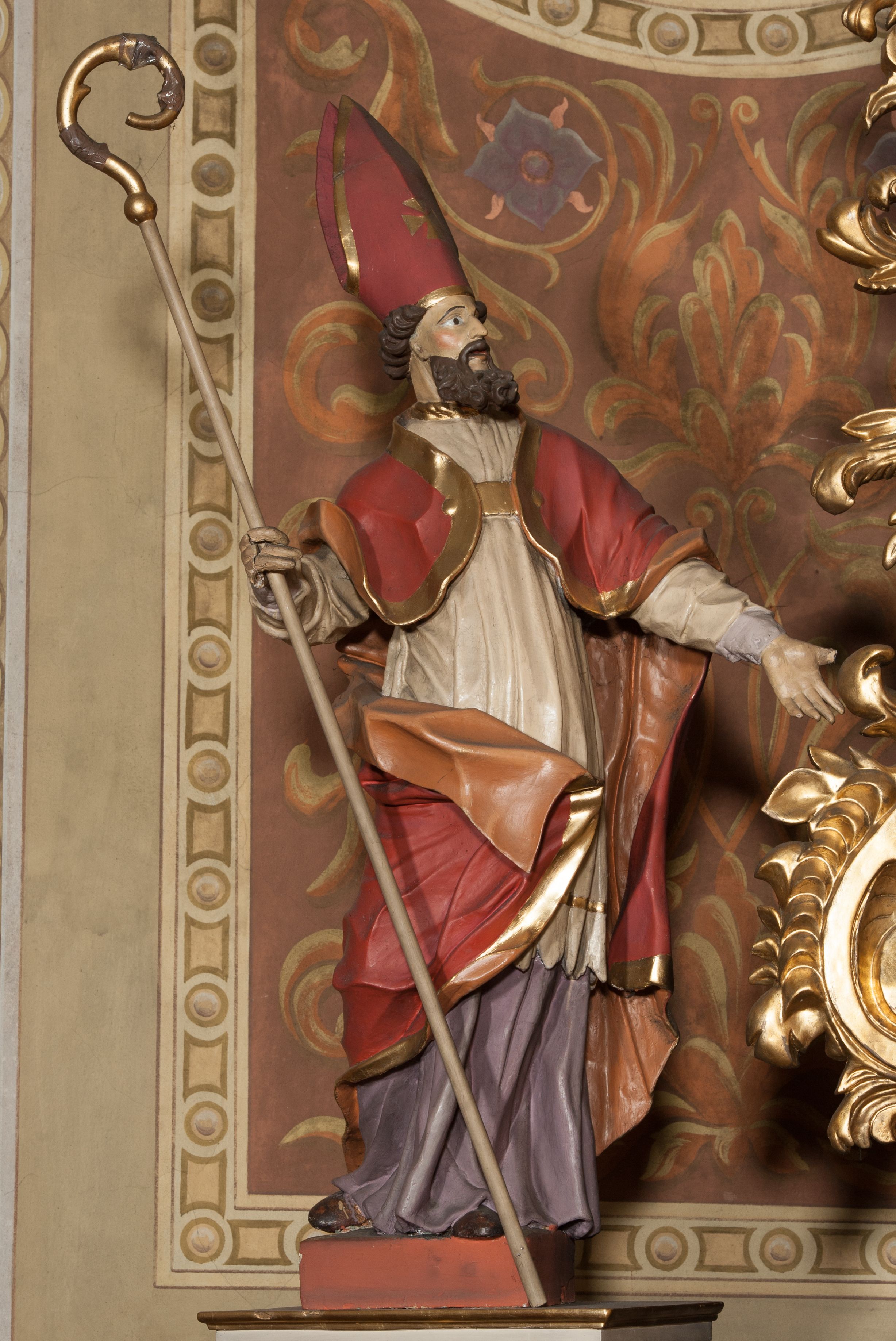 Rzeźba drążona, ustawiona na podstawie na planie prostokąta. Figura zwrócona jest w trzech czwartych w lewo, w delikatnym kontrapoście, o łukowato wygiętej sylwetce. W prawej, ugiętej ręce trzyma pastorał, lewą wyciąga przed siebie. Twarz ma pociągłą, szczupłą, z silnie zaznaczonymi łukami brwiowymi i kośćmi policzkowymi, z szeroko otwartymi oczami, prostym nosem i otwartymi ustami, okoloną bujną, kręconą brodą oraz krótkimi, kręconymi włosami. Święty jest ubrany w fioletową albę, białą rokietę ze złotą lamówką u szyi oraz czerwoną kapę ze złotą lamówką i pomarańczową podszewką, zapiętą na piersi, opadającą na plecy, z zawiniętym i ekspresyjnie rozwianym fragmentem tkaniny na prawej nodze. Na głowie wysoka infuła z pozłoconym krzyżem i brzegami. Polichromia naturalistyczna w partiach ciała.