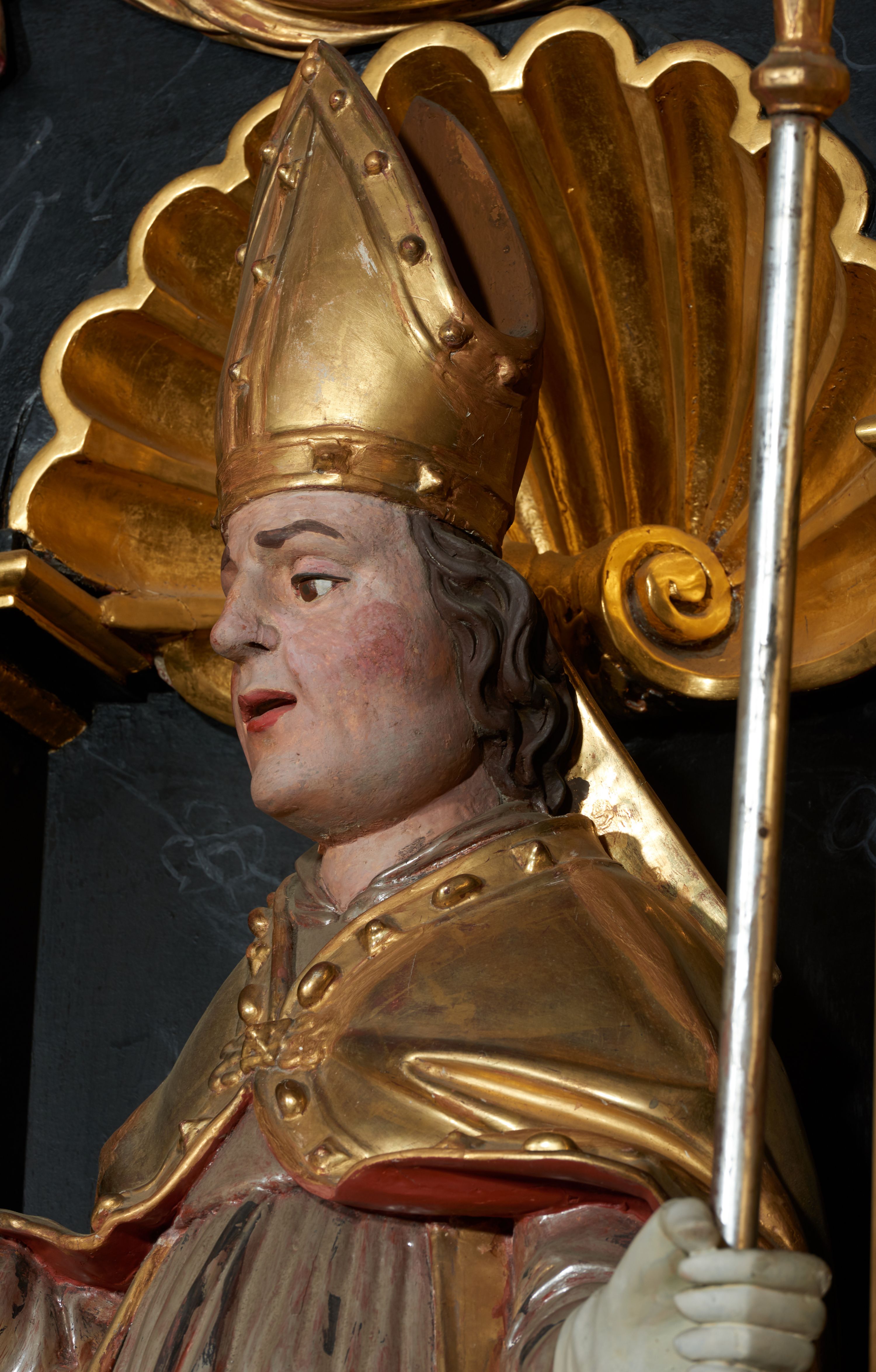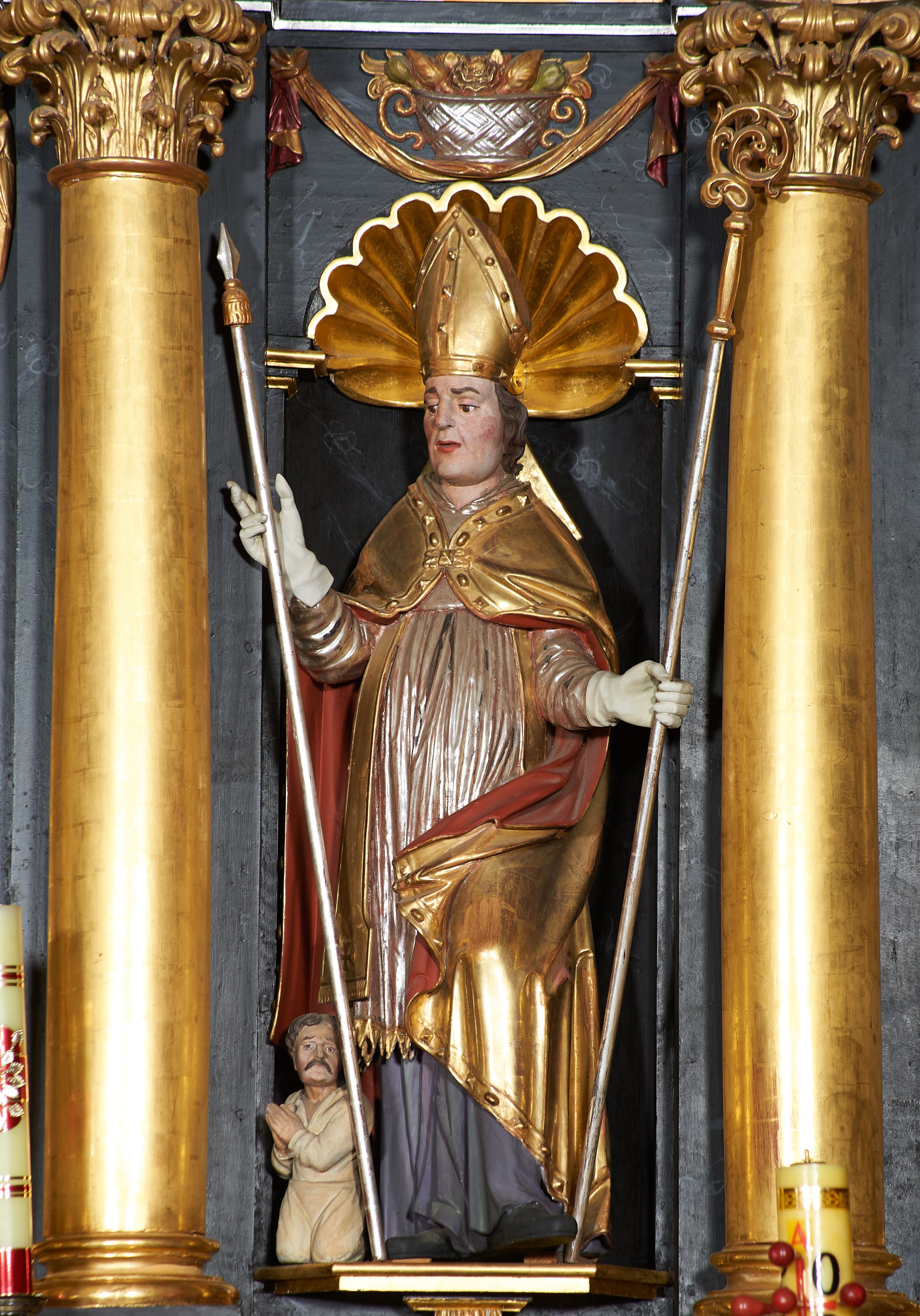 Rzeźba ścięta z tyłu, przedstawiająca św. Stanisława. Święty zwrócony jest trzy czwarte w prawo, w delikatnym kontrapoście, z lewą nogą ugiętą w kolanie. W lewej ręce trzyma pastorał, a w prawej włócznię. Twarz szeroka o dużych półprzymkniętych oczach, dużym nosie i rozchylonych ustach. Włosy brązowe, średniej długości, zasłaniające uszy. Ubrany jest w szarą albę, srebrną komżę, złotą stułę oraz złotą kapę z czerwonym podbiciem, zapiętą na piersi, na brzegu zdobioną kaboszonami i rautami. Na głowie ma założoną infułę, na dłoniach białe rękawice, a na stopach czarne buty. Po prawej stronie świętego ustawiona jest niewielka rzeźba Piotrowina, ukazanego w pozycji klęczącej ze złożonymi w geście modlitwy dłońmi. Twarz szeroka z długim nosem, okolona wąsami i krótkimi włosami. Piotrowin ubrany jest w białą szatę z długimi rękawami. Polichromia rzeźb w odsłoniętych partiach ciała naturalistyczna, detale złocone i srebrzone.