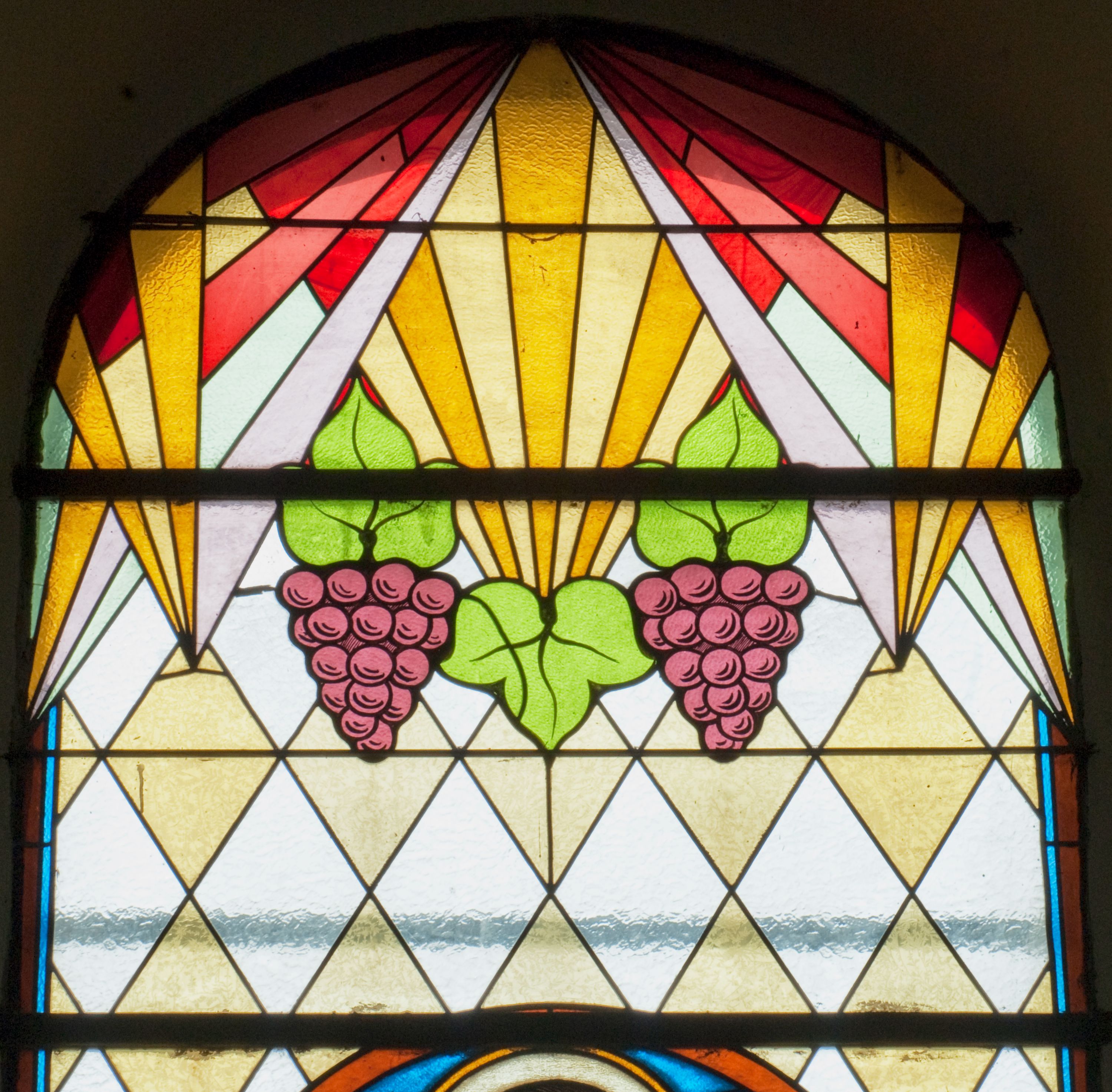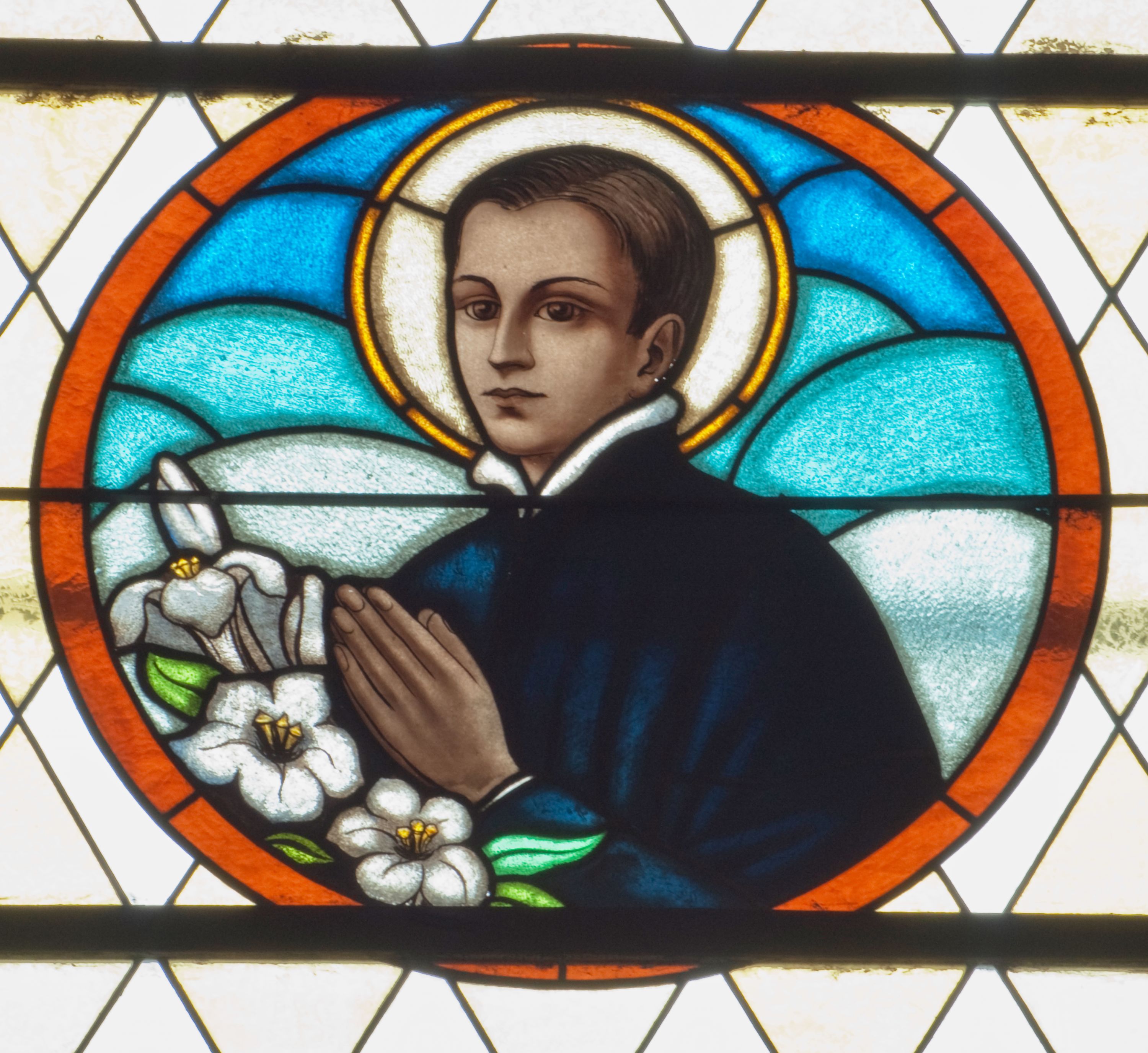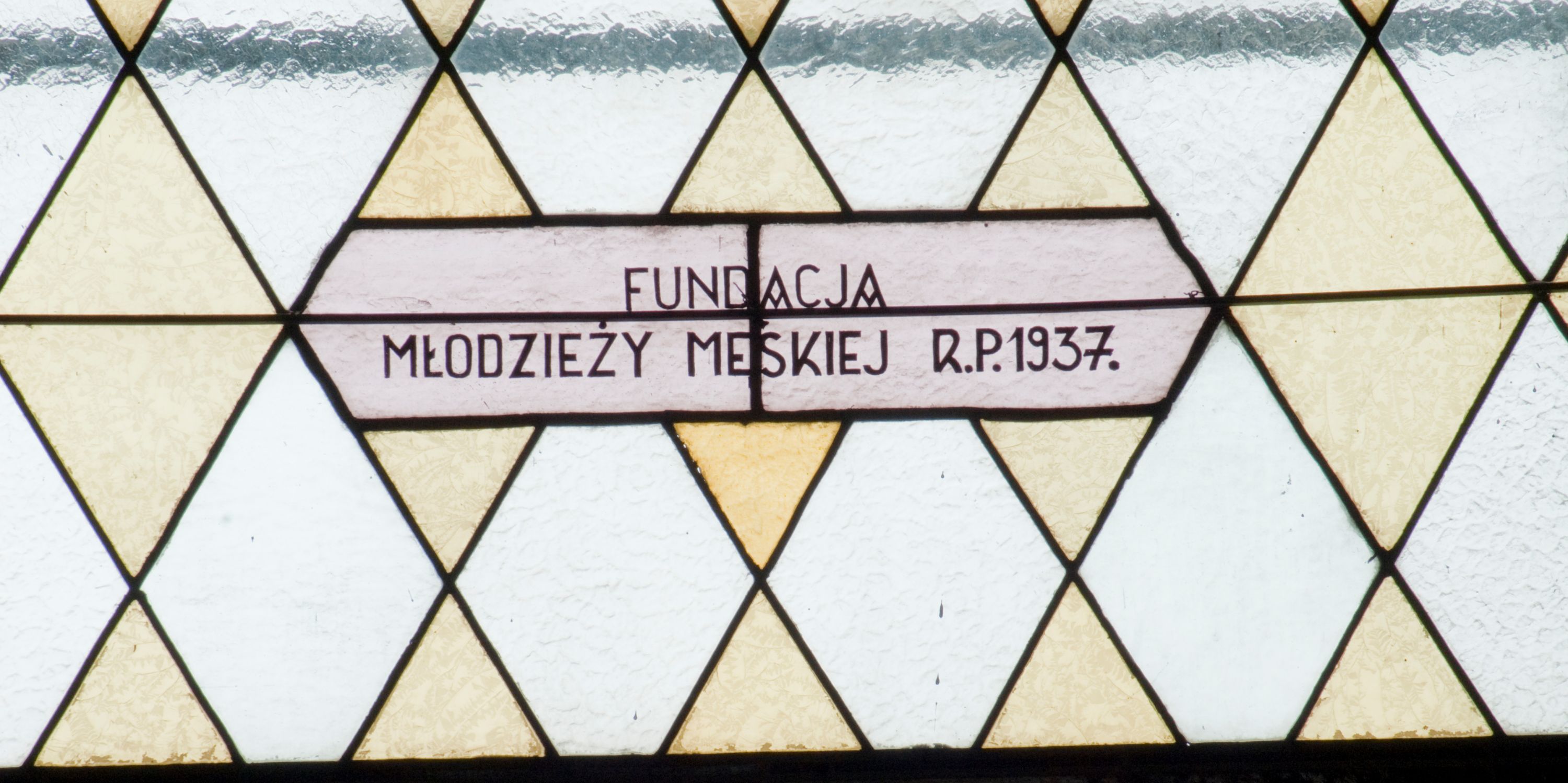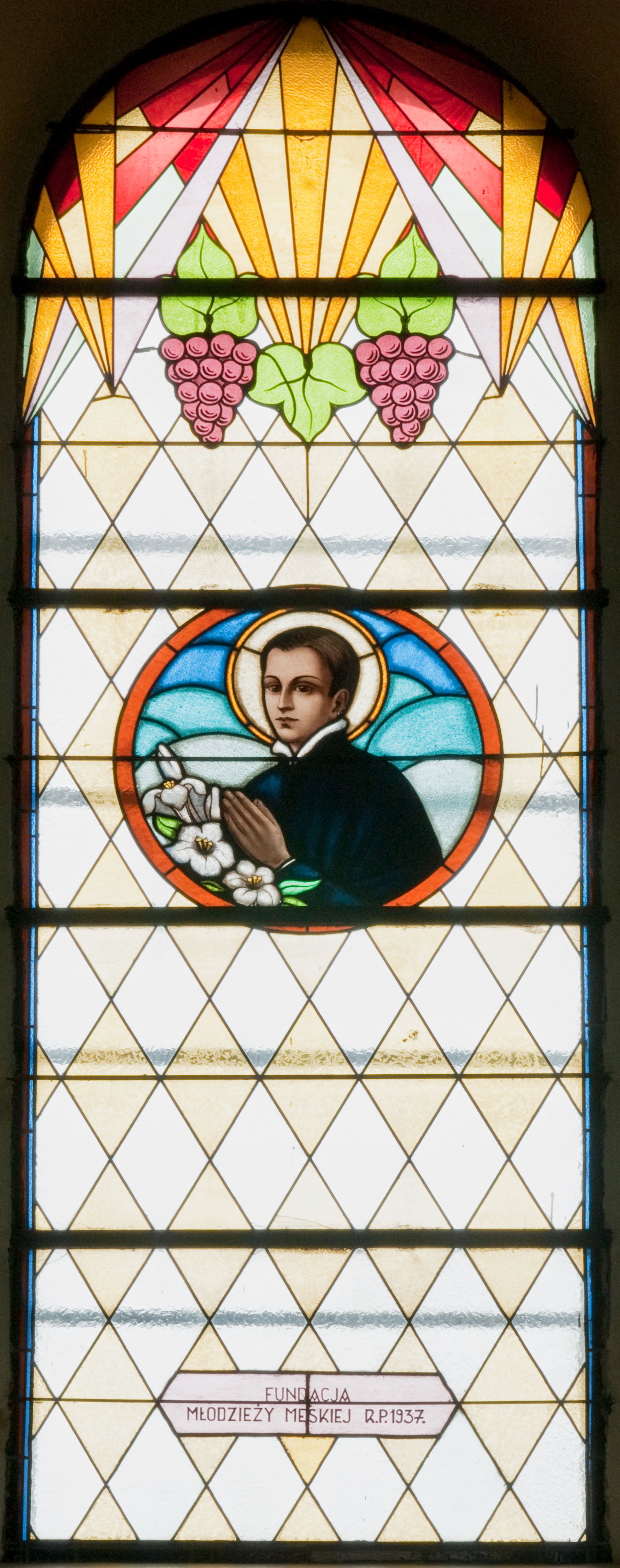Witraż w kształcie wydłużonego, stojącego prostokąta zamkniętego półkoliście. W centrum kompozycji medalion mieszczący popiersie św. Stanisława Kostki. Święty zwrócony w trzech czwartych w prawo. Twarz owalna, o regularnych rysach. Ręce na wysokości piersi złożone w geście modlitwy. Poniżej bukiet białych lilii. Święty Stanisław ubrany jest w czarną sutannę z białym kołnierzem. Wokół głowy jasnożółty nimb. W górnej części witrażu przedstawione winne grona na tle geometrycznej kompozycji w kolorach żółtym i czerwonym. W dolnej strefie witrażu inskrypcja „FUNDACJA / MŁODZIEŻY MĘSKIEJ R(OKU) P(AŃSKIEGO) 1937”. Tło kompozycji wypełnione motywem rombów w kolorach jasnożółtym i białym.