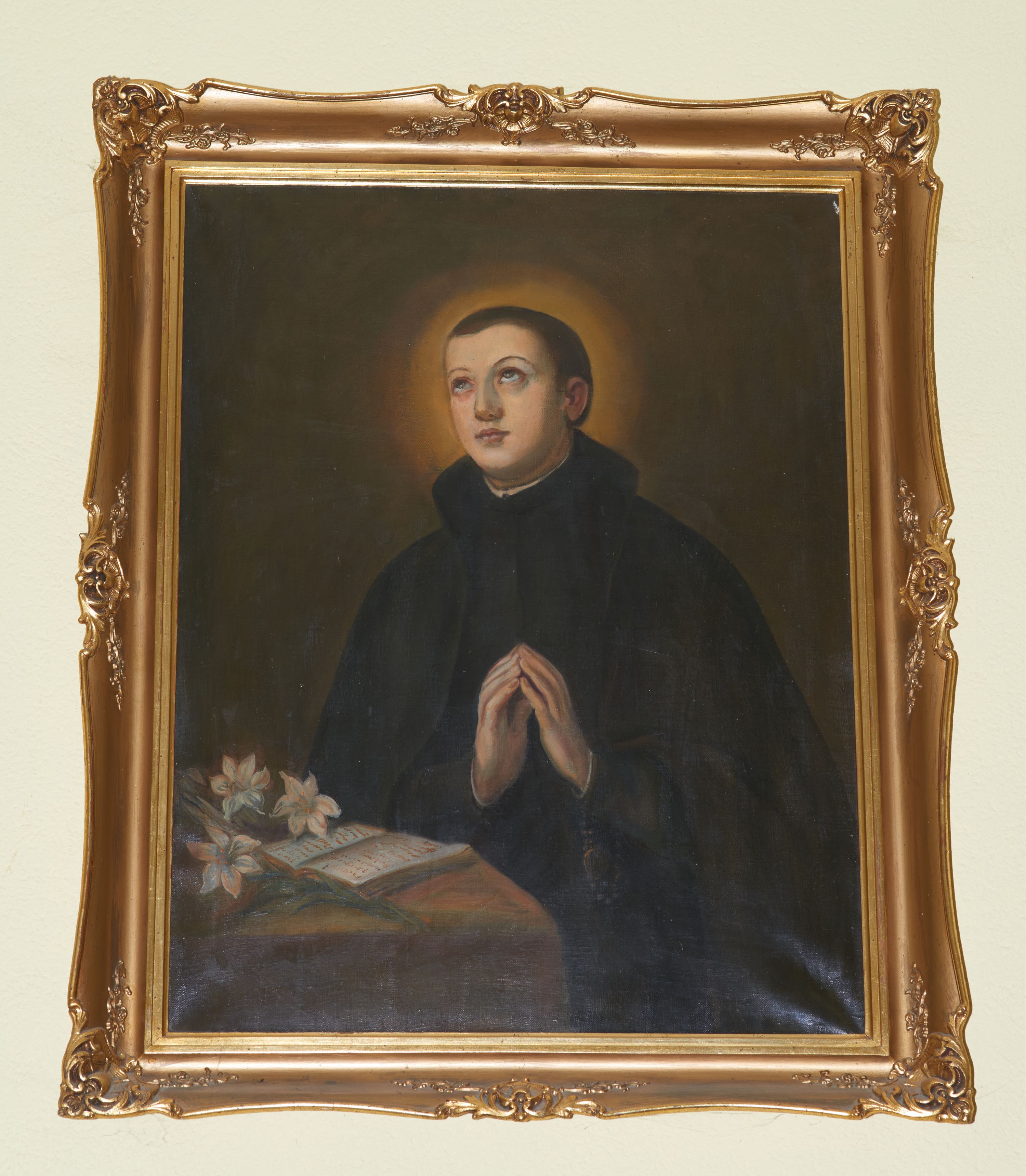 Święty Stanisław Kostka jest patronem Polski i młodzieży, żył w latach 1550-1568. Był synem kasztelana zakroczymskiego, urodził się w Rostkowie na Mazowszu, studiował w Wiedniu, gdzie prowadził pełne świętości życie. Wbrew woli rodziców wstąpił do zakonu jezuitów. Na obrazie został ukazany w klasycznej konwencji ikonograficznej, jako młodzieniec w stroju jezuity oraz z charakterystycznymi dla niego atrybutami – gałązkami białych lilii, symbolizującymi czystość oraz otwartą księgą. Obraz namalował nieznany malarz w XX wieku, według wizerunku świętego znajdującego się w kościele Sant'Andrea al Quirinale w Rzymie.