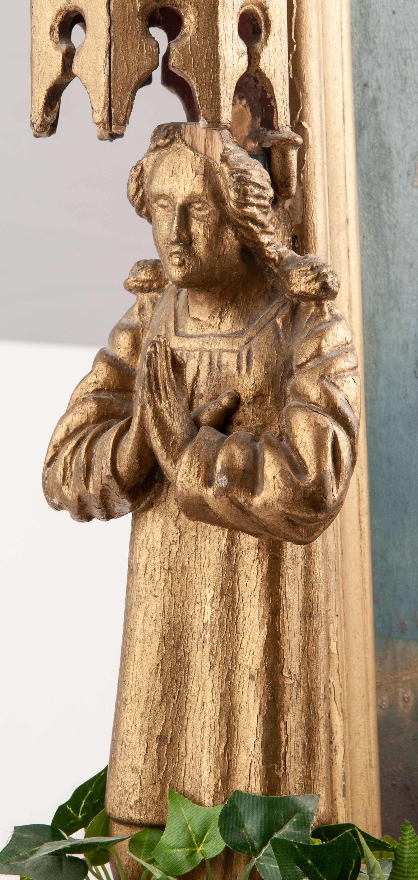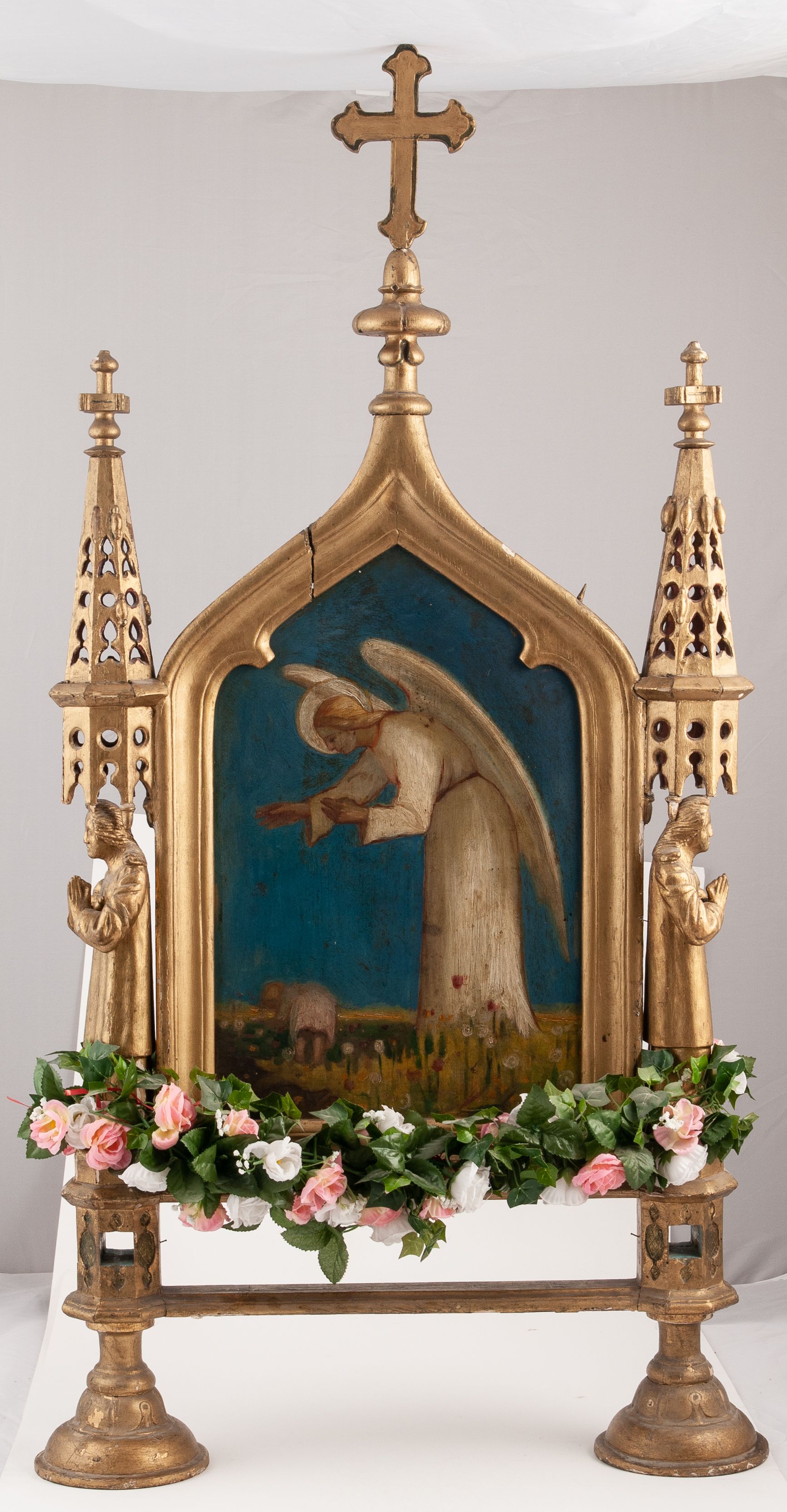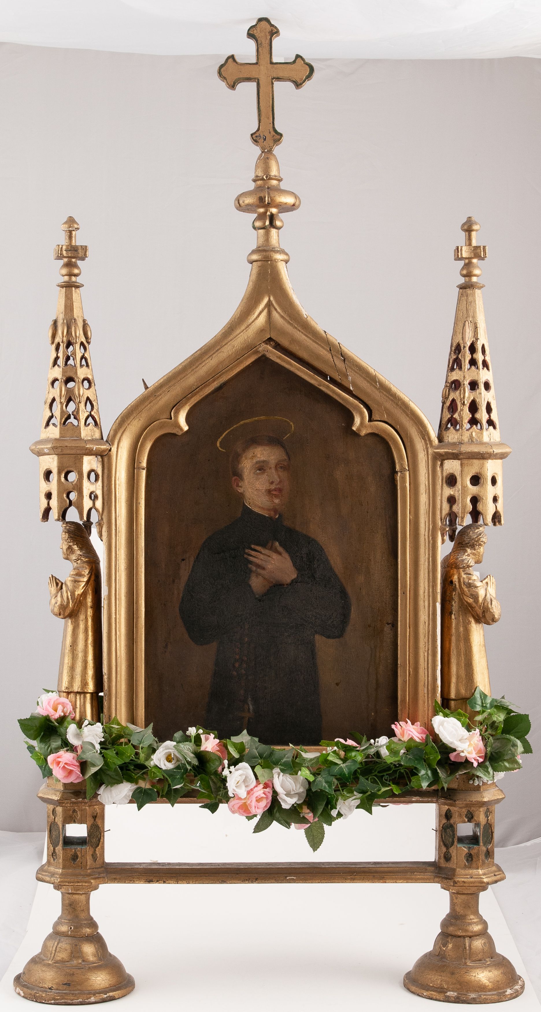 Feretron dwustronny z obrazami św. Stanisława Kostki oraz Anioła Stróża. Konstrukcja feretronu osadzona na dwóch nóżkach na planie koła, wspierających dwa wieloboczne w rzucie cokoły, połączone listwami stabilizującymi konstrukcję feretronu; cokoły zaopatrzone w otwory na drążki do noszenia. Na cokołach ustawione dwie rzeźby niezidentyfikowanych świętych, ujętych z profilu, nad nimi nadwieszone baldachimy zwieńczone stylizowanymi kwiatonami. W centrum tej konstrukcji obrazy ujęte w profilowaną ramę, zamkniętą łukiem ostrym o spłaszczonych ramionach, zwieńczoną krzyżykiem łacińskim o trójlistnie zakończonych ramionach. Struktura feretronu złocona. Na obrazie Anioł Stróż ukazany jest po prawej stronie kompozycji, w postawie stojącej, widoczny z lewego profilu, pochylony nad dzieckiem bawiącym się na kwietnej łące. Ubrany jest w białą, długą sukienkę. Tło obrazu jednolite, ciemnoniebieskie. Po drugiej stronie feretronu znajduje się wizerunek św. Stanisława Kostki. Święty ukazany do kolan, stojący frontalnie, delikatnie zwrócony w lewo, z rękami złożonymi na piersi, z różańcem w dłoniach. Twarz szeroka, ze wzrokiem skierowanym ku górze, włosy krótkie i jasnobrązowe. Święty ubrany jest w sutannę jezuicką. Wokół głowy ma złoty, okrągły nimb. Tło obrazu jednolite, brązowe.