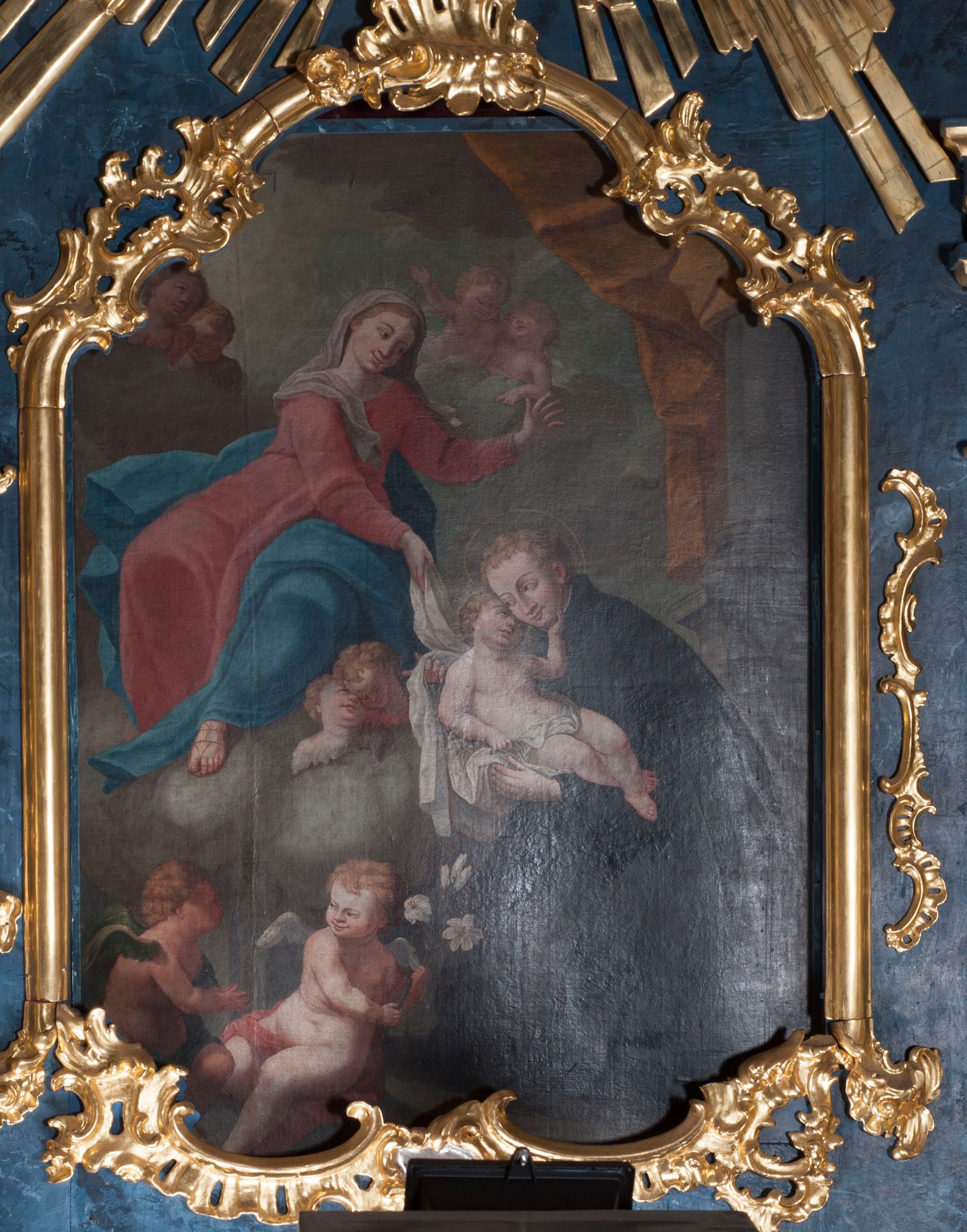 Obraz w formie stojącego prostokąta przedstawia św. Stanisława Kostkę, który w ramionach tuli Dzieciątko i klęczy przed unoszącą się na obłokach Matką Boską. Święty ukazany jest z profilu, zwrócony w prawo, z pochyloną głową, obiema rękoma podtrzymuje Dzieciątko. Twarz ma pociągłą, o młodzieńczych rysach, migdałowatych oczach, długim nosie i pełnych ustach, okoloną jasnymi, krótkimi włosami. Ubrany jest w czarny habit jezuicki z białą koloratką. Dzieciątko leży w ramionach świętego, zwrócone w trzech czwartych w lewo, twarz przytula do policzka Stanisława, a lewą dłonią ujmuje go za brodę. Twarz ma pełną, z oczami skierowanymi do góry, okoloną jasnymi, krótkimi włosami. W partii bioder przepasane jest białą tkaniną. Maria zwrócona jest w trzech czwartych w prawo, z korpusem i głową skierowanymi w lewo oraz z pochyloną głową. Obie ręce wyciąga przed siebie, w prawej trzyma białą tkaninę, którą opasane jest Dzieciątko. Twarz ma owalną, o łagodnych rysach, migdałowatych oczach, prostym nosie i pełnych ustach, okoloną jasnymi włosami schowanymi pod welonem. Ubrana jest w jasnoczerwoną suknię, przepasaną w talii, niebieski płaszcz zarzucony na jej lewą nogę oraz opadający po bokach postaci, na głowie ma biały welon, na stopach sandały. W lewym dolnym rogi obrazu siedzą dwa putta, spośród których jedno trzyma gałązkę lilii. Na obłokach otaczających Marię znajdują się dwie pary uskrzydlonych główek anielskich i jedna para puttów. W prawej części obrazu, w tle znajduje się fragment kolumny na cokole z podwieszoną pomarańczową kotarą.