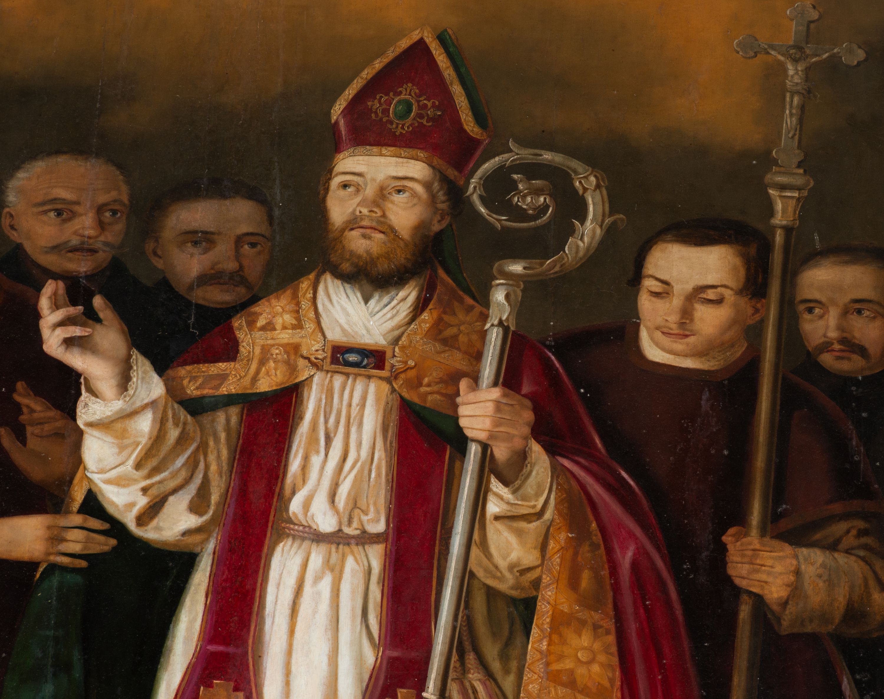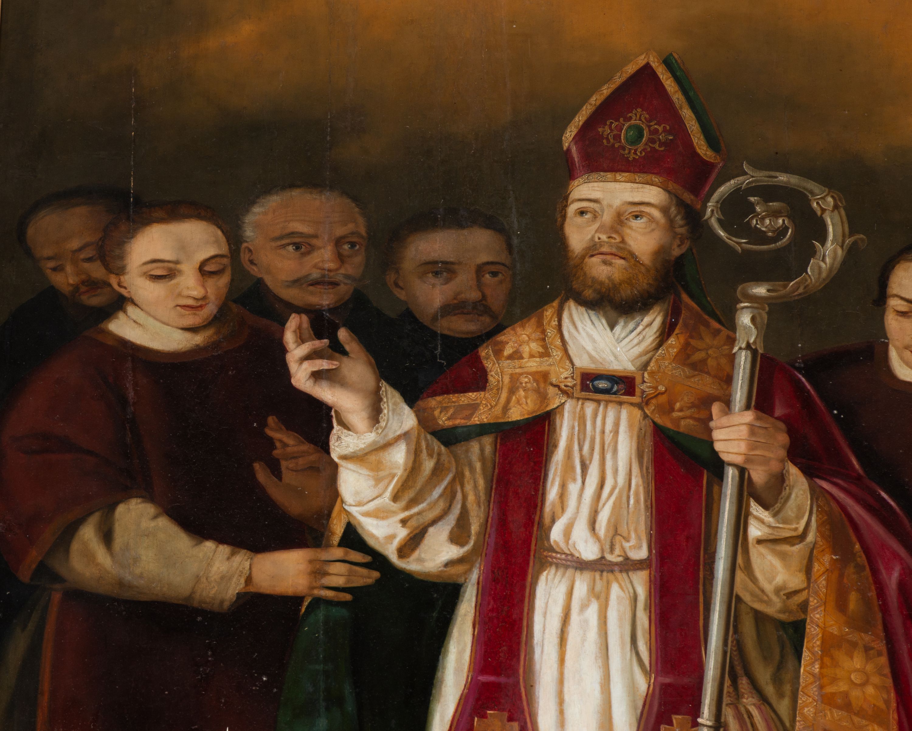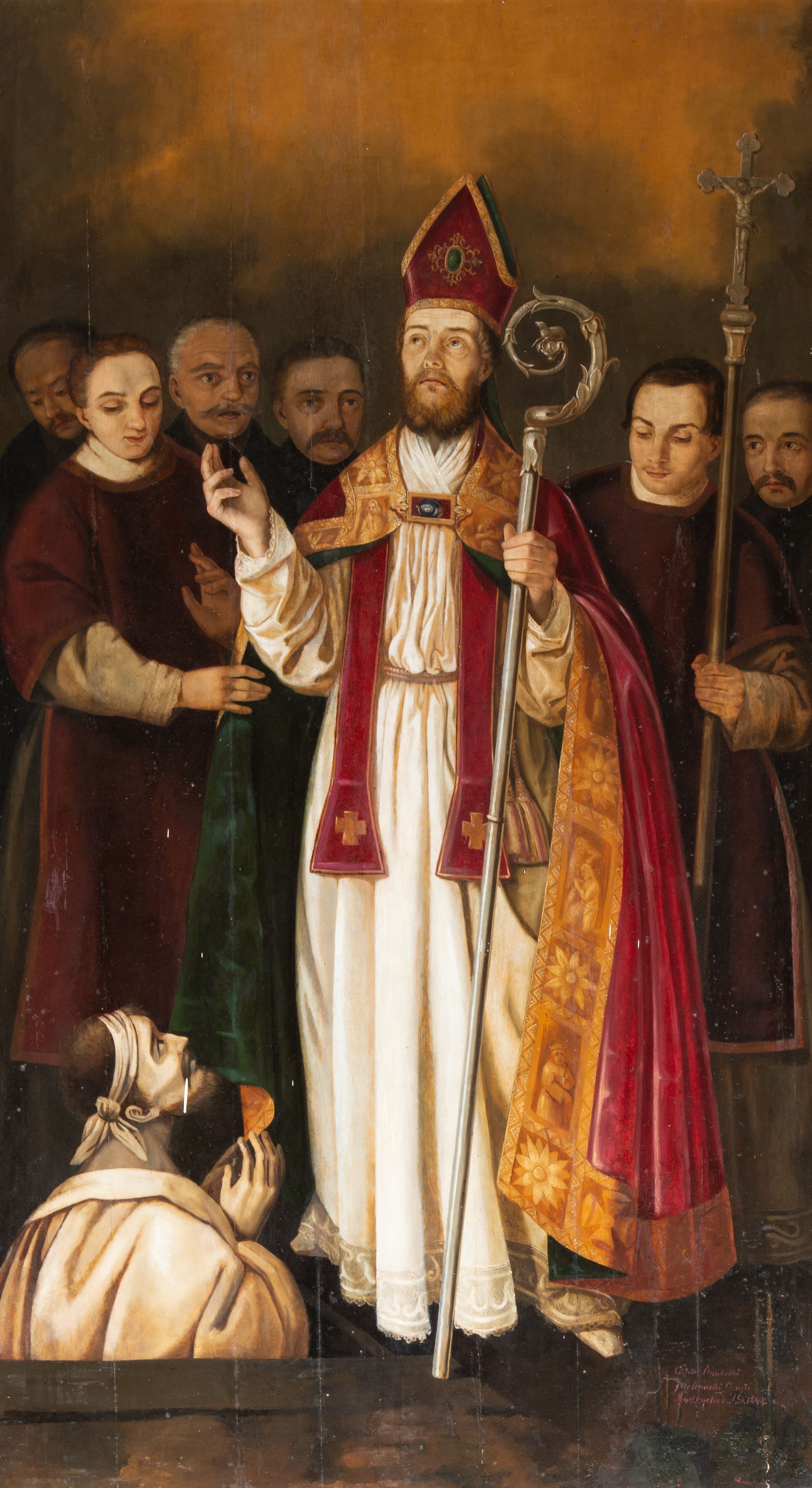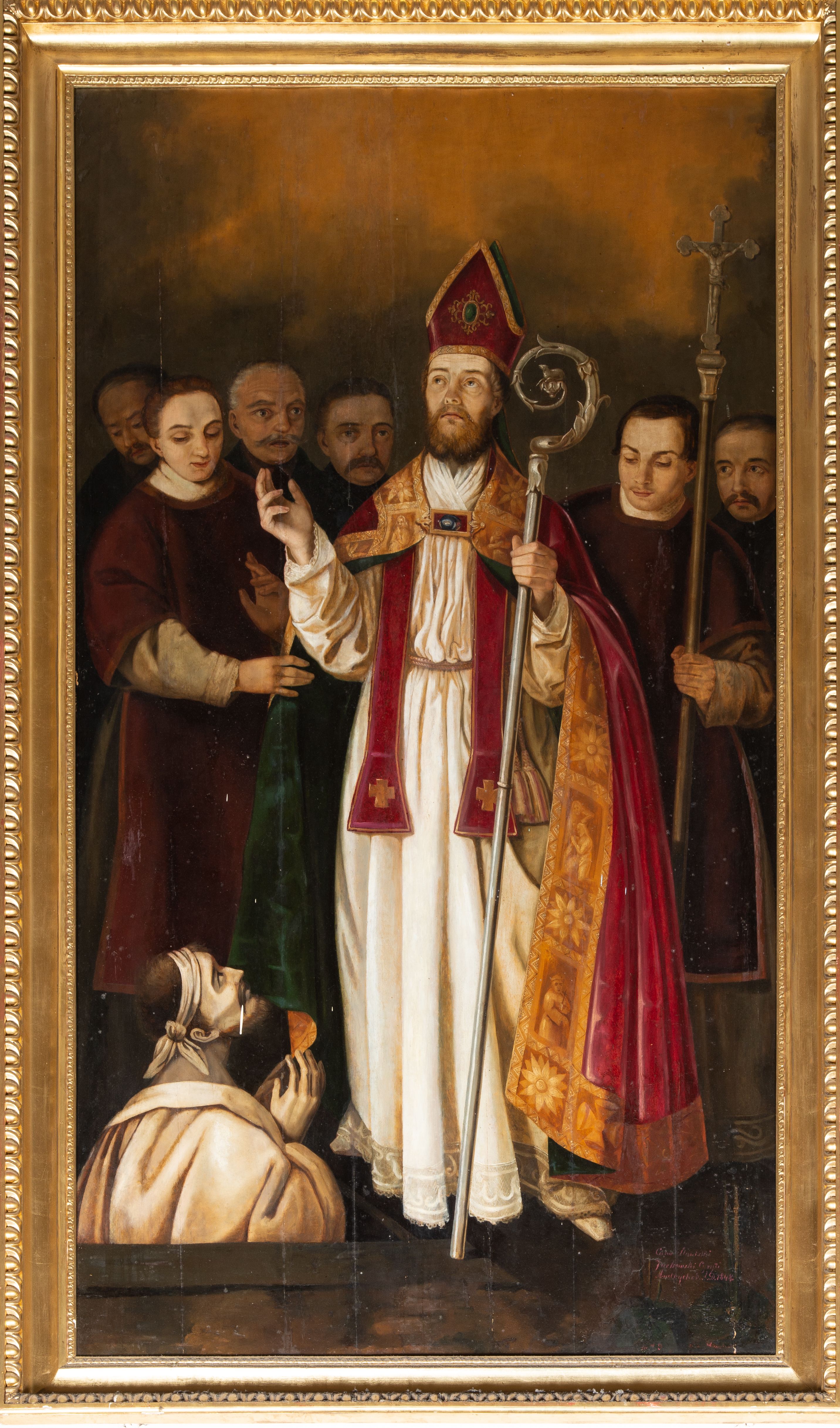 Obraz uzyskał kształt stojącego prostokąta. W centrum kompozycji przedstawiono w całej postaci frontalnie w nieznacznym kontrapoście św. Stanisława stojącego nad grobem Piotrowina. Stanisław z uniesioną głową i spojrzeniem w niebo prawą rękę unosi w geście błogosławieństwa, a w lewej trzyma srebrny pastorał o krzywaśni utworzonej z wici roślinnej. Ma pociągłą twarz o wydatnym nosi i ustach, otoczoną brązowym zarostem. Ubrany jest w humerał, albę obszytą u spodu koronką, przewiązaną w pasie cingulum, szkarłatną stułę oraz taką samą kapę podbitą ciemną zielenią, spiętą pod szyją fibulą i obwiedzioną złocistą, szeroką bortą. Na głowie ma szkarłatną infułę lamowaną złotą tasiemką, a na przedzie zdobioną klejonem. Przed biskupem w lewym rogu kompozycji z czworobocznego otworu w posadzce wyłania się postać wskrzeszonego Piotrowina. Jest to starszy mężczyzna o bladotrupiej karnacji ze złożonymi modlitewnie rękami. Jego wychudłą twarz okala brązowa, krótka broda i włosy. Głowę ma przewiązaną białą chustką. Postać owinięta jest białym całunem. Stanisławowi po bokach towarzyszą dwaj diakoni w ciemnobordowych dalmatykach. Są to młodzi mężczyźni. Diakon z prawej strony śwciętego podtrzymuj połę kapy, a z lewej trzyma procesyjny krzyż. Za nimi z tyłu na jasnobrązowym tle widać zdziwione i przerażone twarze czterech starszych, wąsiastych i krótko obciętych mężczyzn będących świadkami cudu.