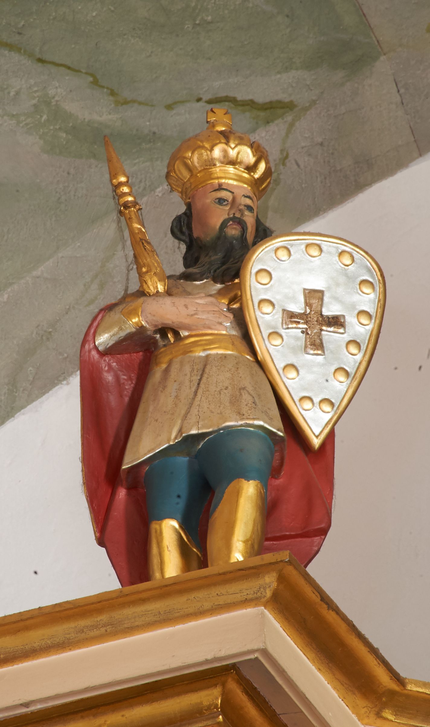 Rzeźba pełna, ukazana frontalnie, z głową skierowaną w lewo, w kontrapoście, prawą dłoń kładzie na piersi, trzyma w niej berło, w lewej zaś tarczę z krzyżem. Twarz ma kwadratową, o migdałowatych oczach, małym nosie i ustach, okoloną długą, ciemną brodą oraz falowanymi włosami. Ubrany jest w niebieskie spodnie i wysokie, złocone buty, krótką, srebrzoną tunikę, przewiązaną w pasie złoconą szarfą, na ramiona ma narzucony złocony płaszcz z czerwoną podszewką. Na głowie ma złoconą, zamkniętą koronę zwieńczoną krzyżem. Polichromia naturalistyczna w partiach ciała.
