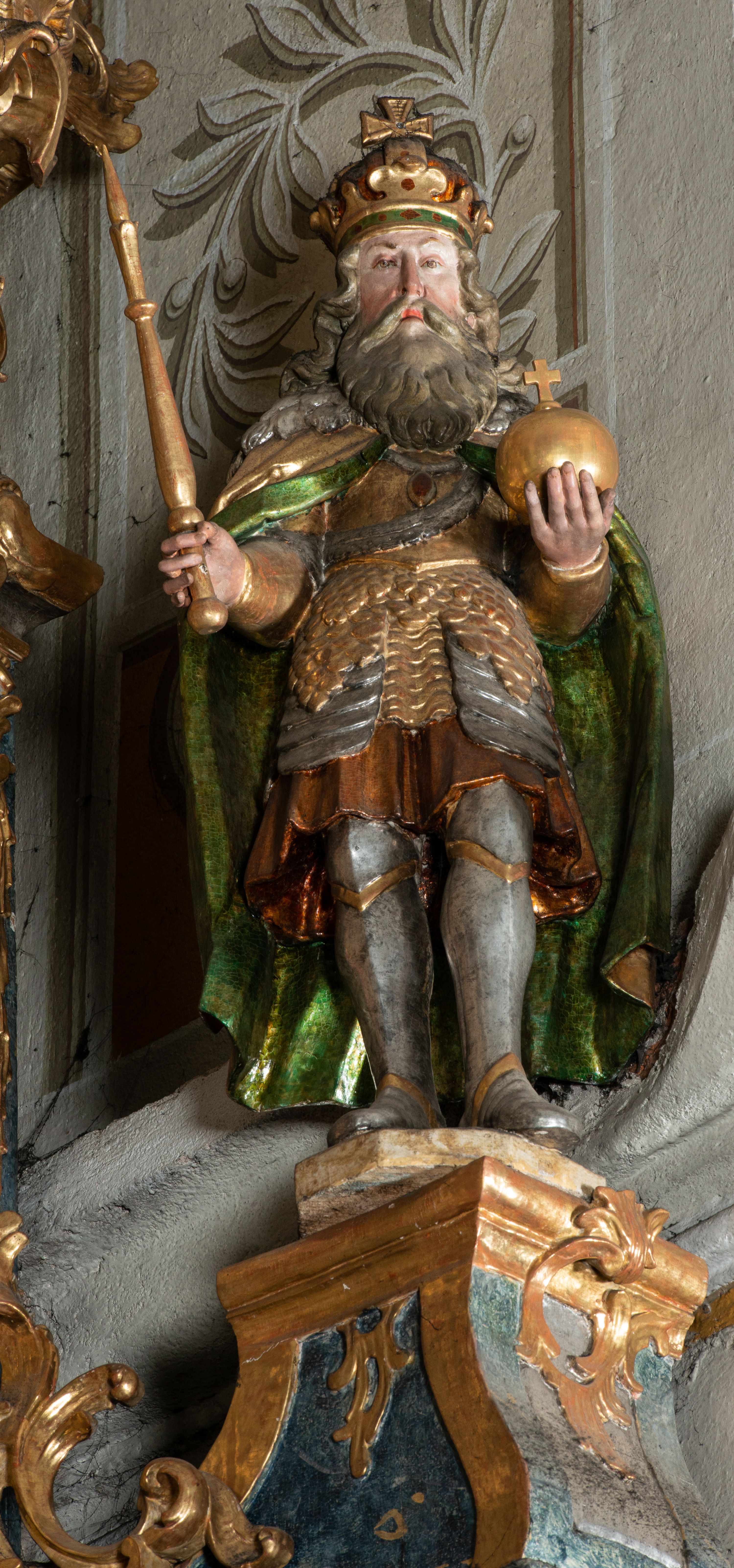 Rzeźba pełnoplastyczna, przyścienna, z tyłu drążona, ustawiona na niskiej podstawie. Święty ukazany en trois quarts, stoi w kontrapoście, w lewej ręce trzyma jabłko królewskie, w prawej berło. Twarz pociągła, o delikatnych rysach, okolona długą brodą. Włosy długie, kręcone, opadają na ramiona, na głowie korona zamknięta z krzyżem. Ubrany w pełną zbroję oraz płaszcz spięty na piersi i opadający na plecy. Polichromia naturalistyczna w odsłoniętych partiach ciała, zbroja srebrzona, płaszcz laserunkowy, atrybuty złocone.