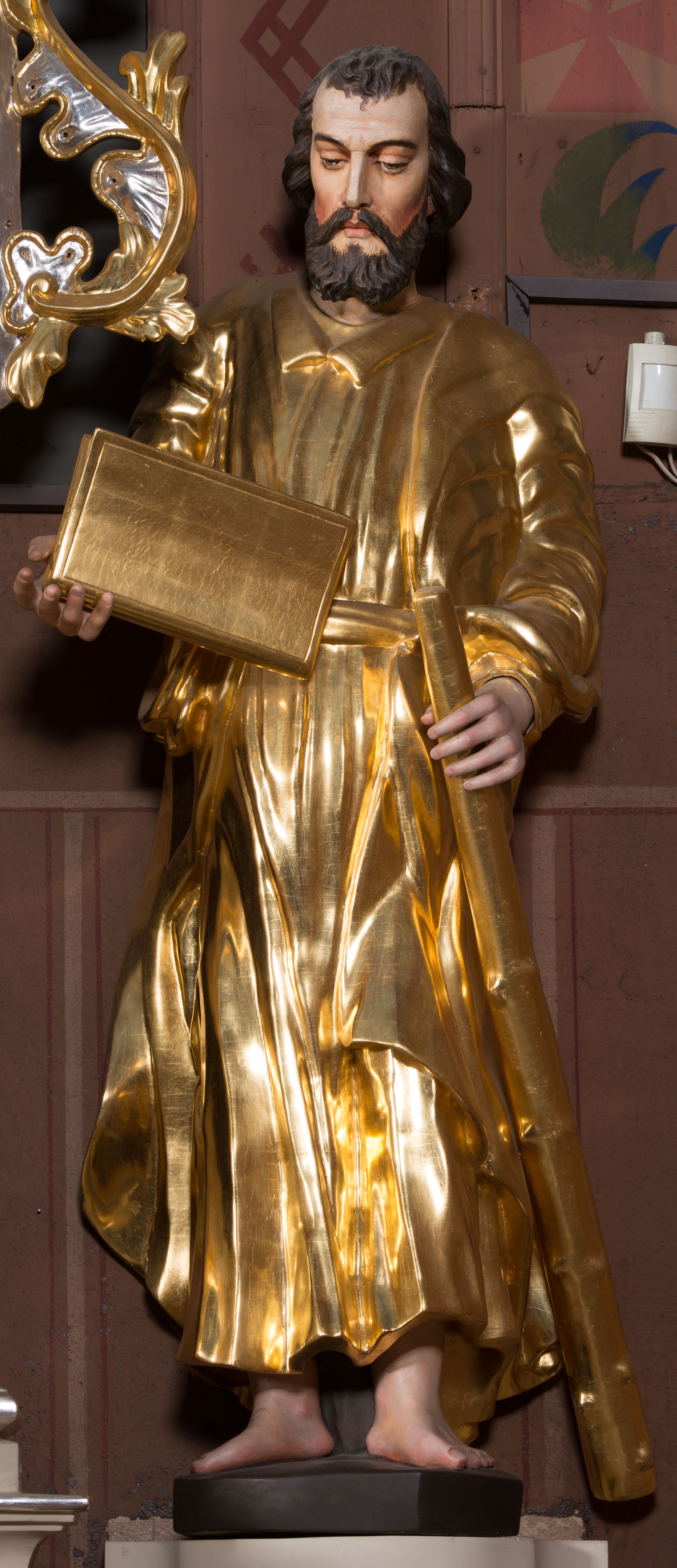 Figura pełnoplastyczna ustawiona na nieregularnej podstawie. Święty ukazany frontalnie, z pochyloną głową, lewą nogą ugiętą, opartą na podstawie. Lewą ręką podtrzymuje otwartą księgę, prawą wyciąga w bok i opiera na pile. Twarz ma pociągłą, o dojrzałych rysach, zmarszczonym czole, półprzymkniętych oczach, prostym nosie i pełnych ustach, okoloną długą, rozdwajającą się brodą i krótkimi, falowanymi włosami. Ubrany jest w złoconą tunikę, przylegającą do ciała, obficie drapowaną, przepasaną w talii oraz płaszcz zarzucony na ramiona i na lewy bok postaci. Polichromia ciała naturalistyczna, włosy brązowe.