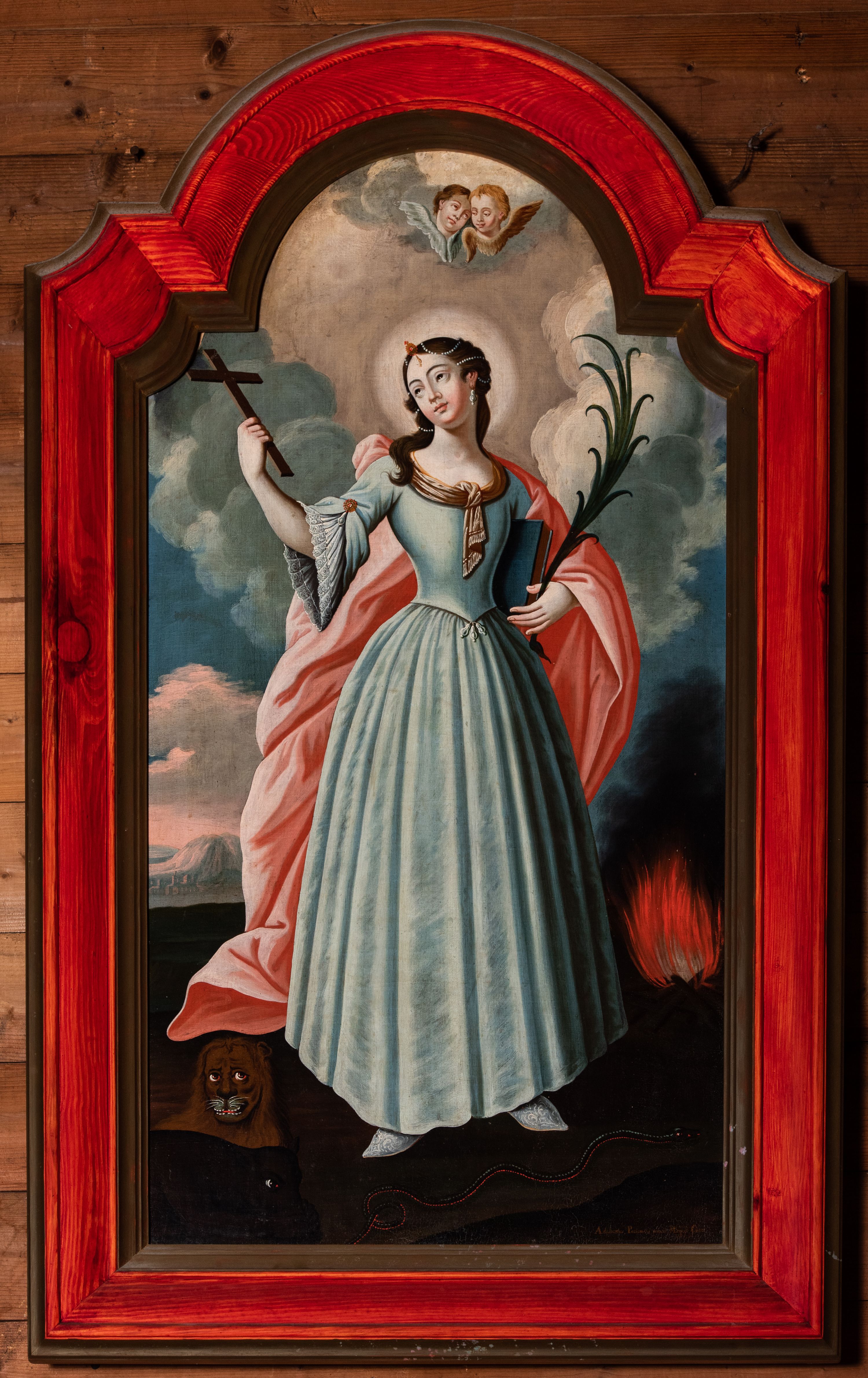 Pierwotnie obraz znajdował się zapewne, w którymś z ołtarzy w Graboszycach, jednakże nie wspomniano o nim w żadnej wizytacji biskupiej. Obraz przedstawia św. Teklę, uczennicę św. Pawła. Święta nawróciwszy się zerwała zaręczyny z poganinem, za co skazano ją na śmierć poprzez spalenie na stosie. Przeżyła w cudowny sposób, gdy deszcz zgasił płomienie ognia, dlatego na obrazie w Graboszycach ukazano płonący stos. Po lewej stronie obrazu znajdują się lew i byk, które nawiązują do wyprawy ze św. Pawłem do Antiochii, gdzie została skazana na pożarcie przez zwierzęta. Tam również w cudowny sposób zostało ocalone jej życie. Dożyła sędziwego wieku w Seleucji. Na obrazie trzyma w ręku krzyż, symbol wiary, a także gałązkę palmy męczeństwa. Angażanty na sukni św. Tekli, czyli białe mankiety, wykonane z muślinu, gazy lub koronki były charakterystyczne zwłaszcza dla kobiecej mody francuskiej pod koniec XVII i w ciągu XVIII wieku. Obraz namalował Adalbertus Poziemski z Krakowa, utożsamiany z Wojciech Poziemskim (również Podziemskim, Podziomskim), który w 1762 roku został odnotowany w krakowskich aktach cechowych. Niewiele jest znanych dzieł tego malarza. Jedyny obraz sygnowany pod imieniem Adalbertus znajdował się w zbiorach Gwalberta Pawlikowskiego we Lwowie. Pozostałe dzieła autorstwa Wojciecha Poziemskiego to obraz w kościele w Grojcu koło Białej (z 1771 roku pochodzi obraz Matki Boskiej Niepokalanie Poczętej), stacje drogi krzyżowej w Krzeszowie koło Żywca oraz zasłony wielkopostne do wspomnianego Grojca.