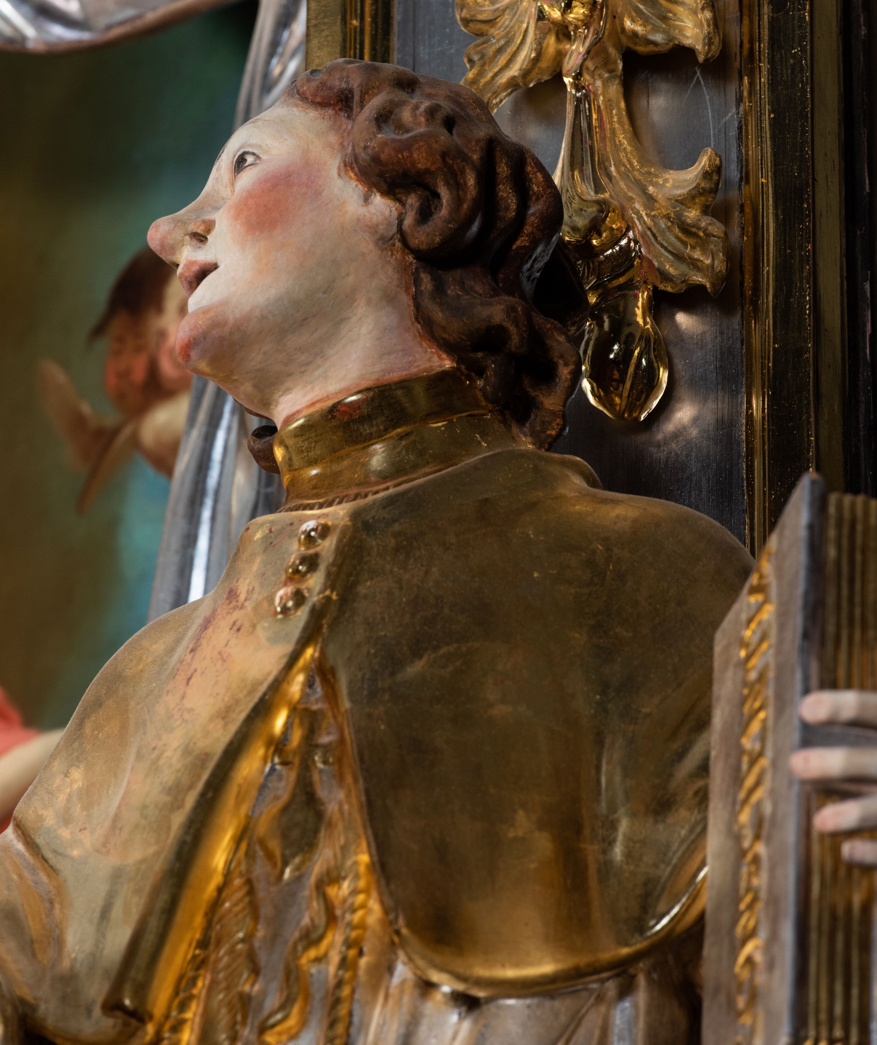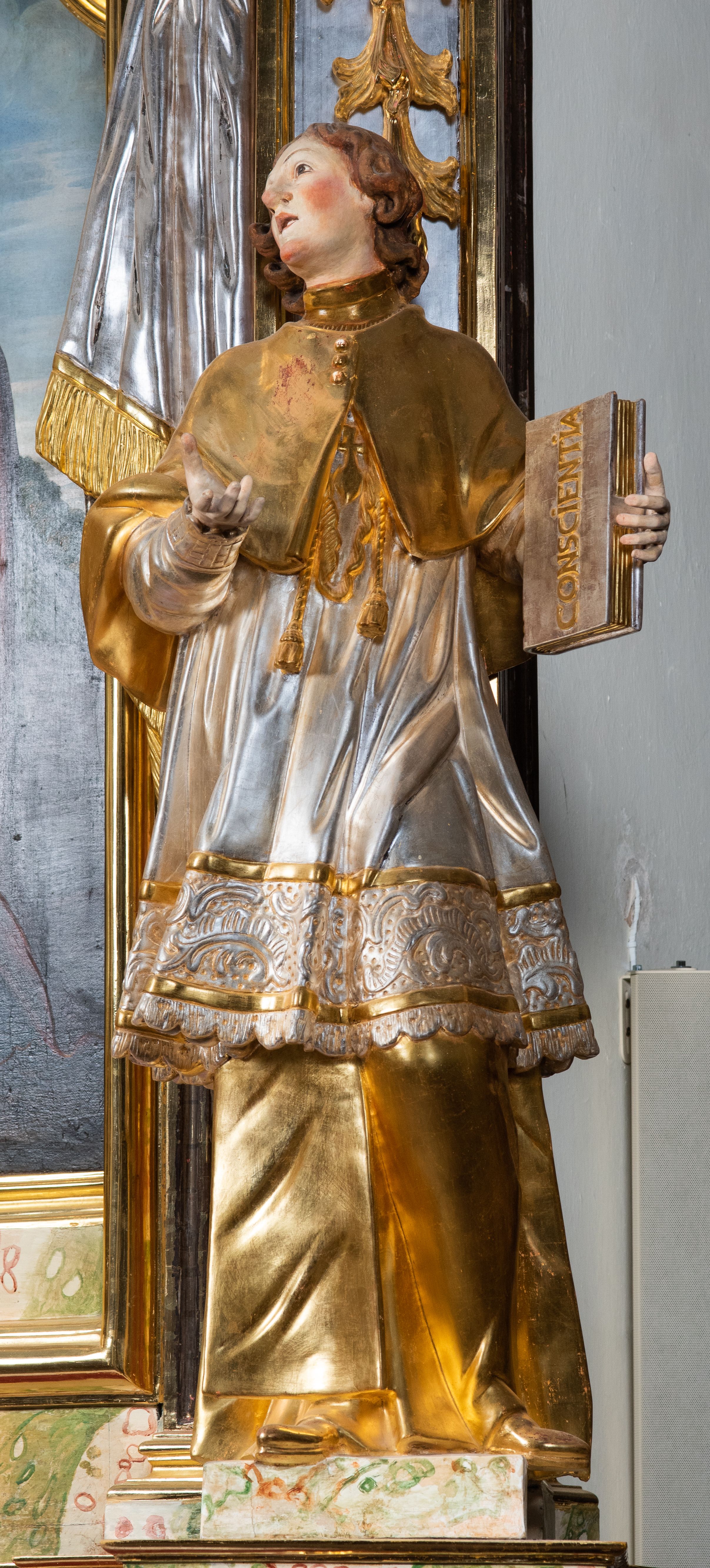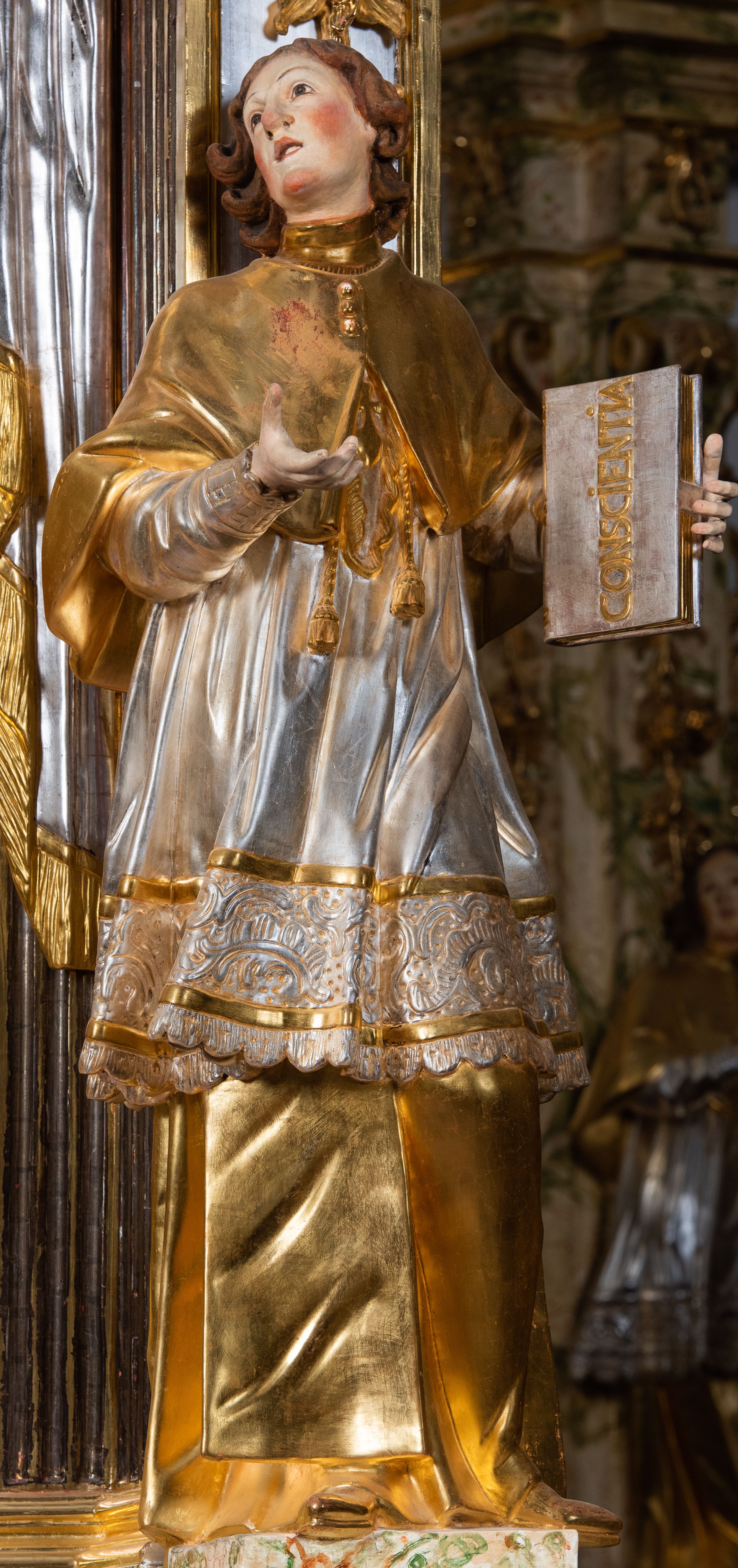 Rzeźba drążona. Święty ma w dłoni księgę z napisem „conscientia”