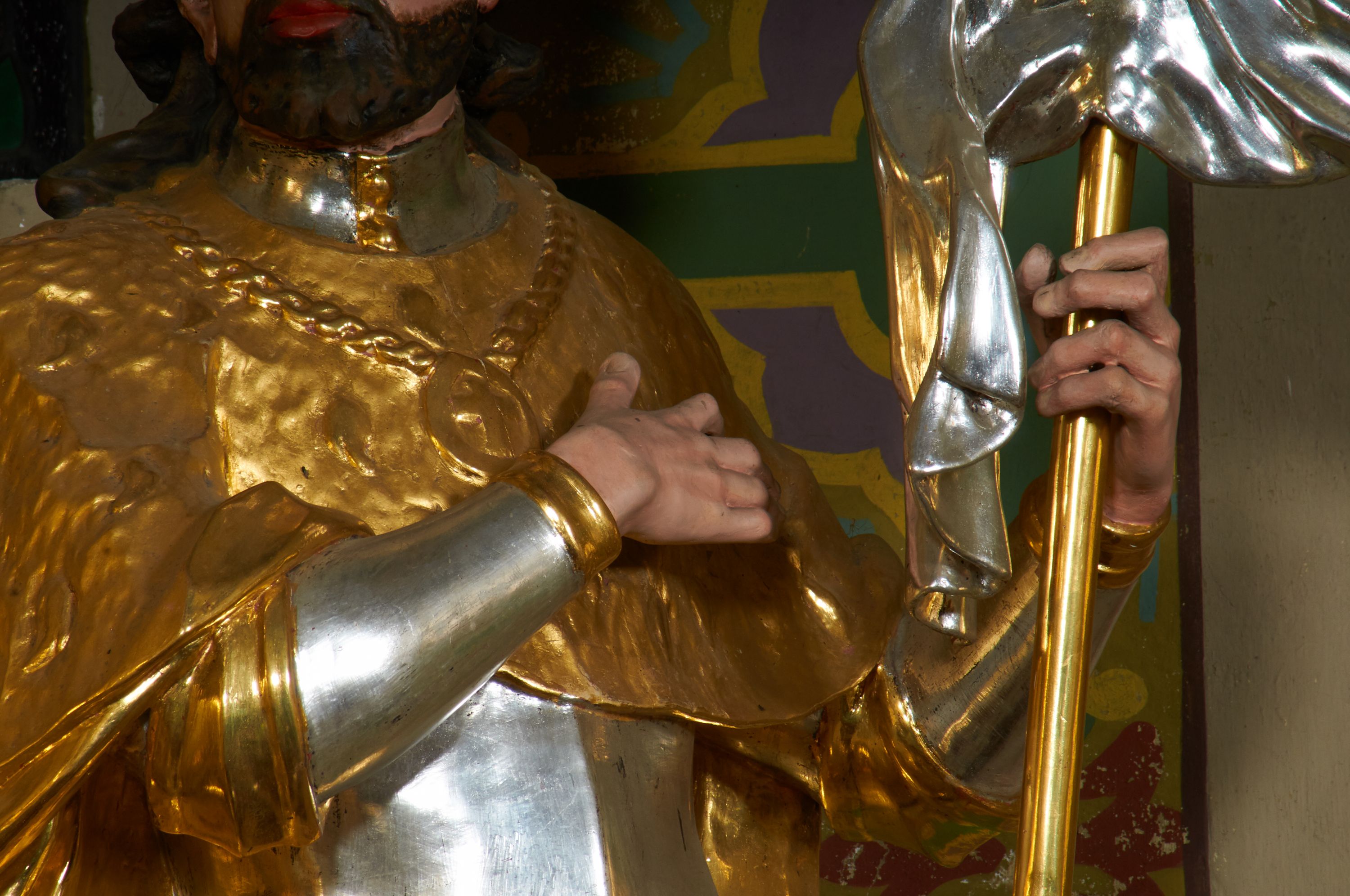 Drobne przetarcia w partii złoceń i srebrzeń. Figura konserwowana w 1999 roku.