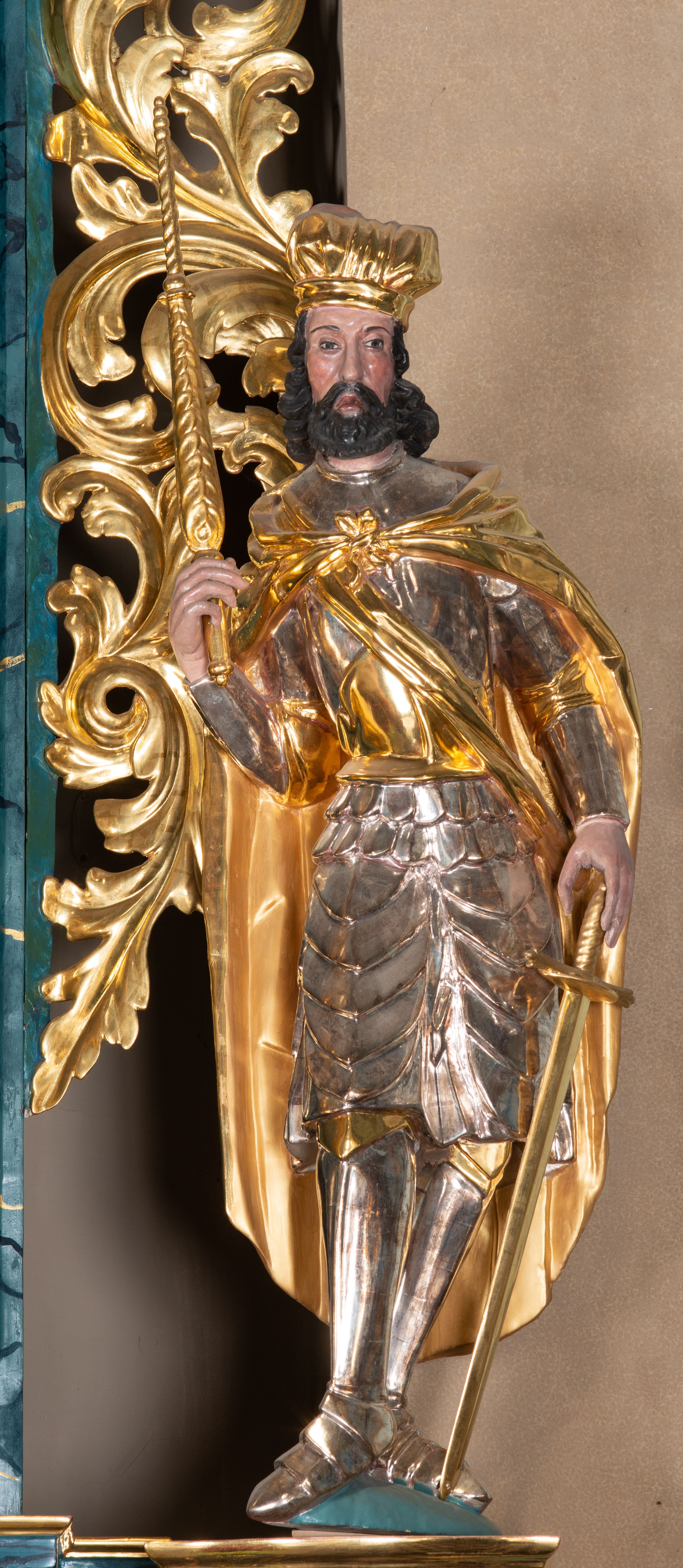 Całopostaciowa, ścięta z tyłu figura św. Wacława stojącego na sferycznej podstawie i zwróconego na wprost. Sylwetka świętego jest w S-kształtnym układzie. Pociągłą twarz charakteryzują wyraziste rysy o małych oczach, długim nosie, zaróżowionych policzkach i krótkim, ciemnym zaroście. Ciemnobrązowe włosy skręcone w pukle rytmicznie opadające sięgając ramion. Święty ubrany jest w srebrzoną zbroję, przez prawe ramię przewiązana diagonalnie złota wstęga, spięty na piersiach, złocony płaszcz opada na plecy i ramiona. Na głowie złocona mitra książęca. W prawej, zgiętej w łokciu i uniesionej do góry ręce trzyma złocone berło, w lewej, opuszczonej wzdłuż ciała złocony miecz.