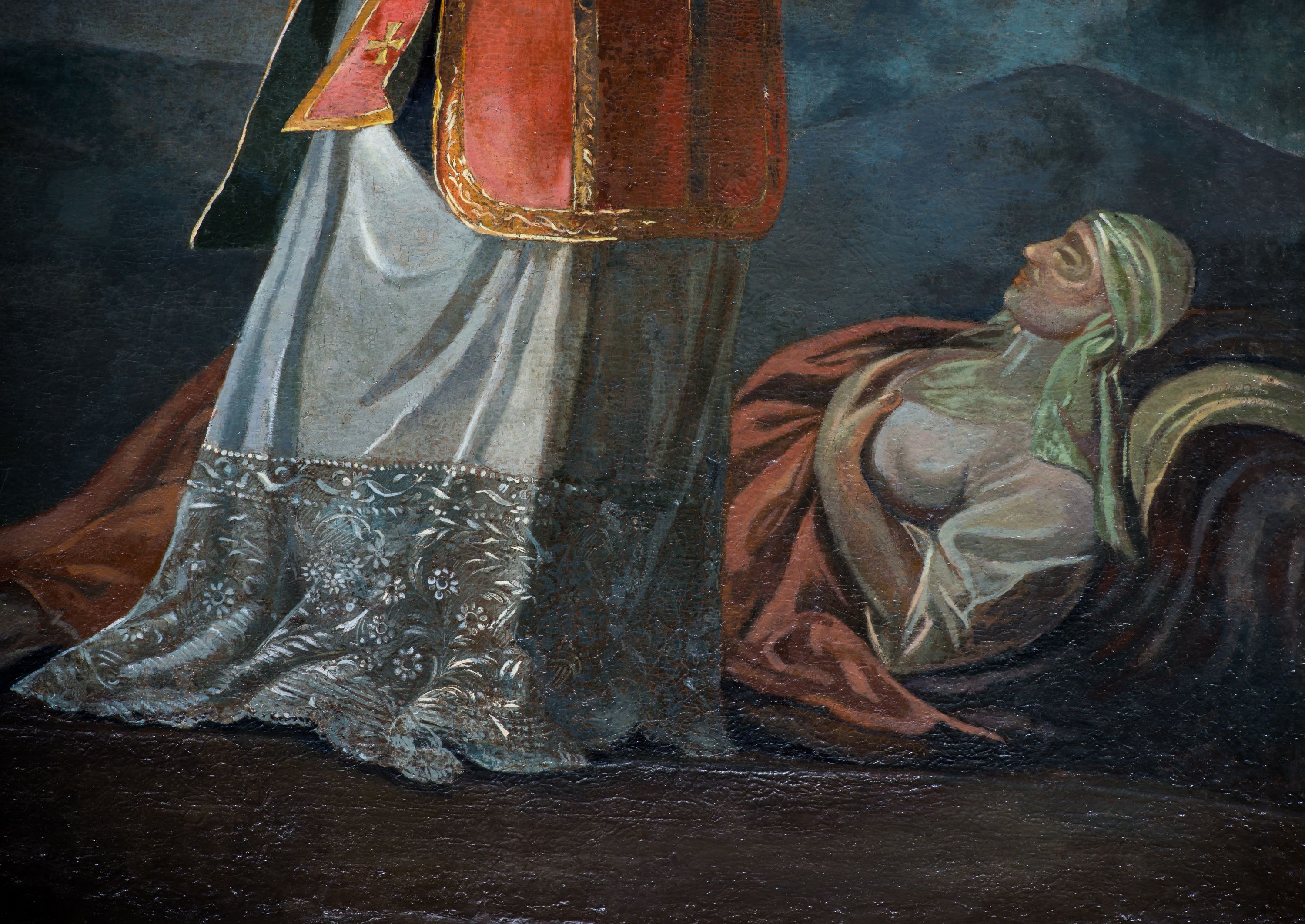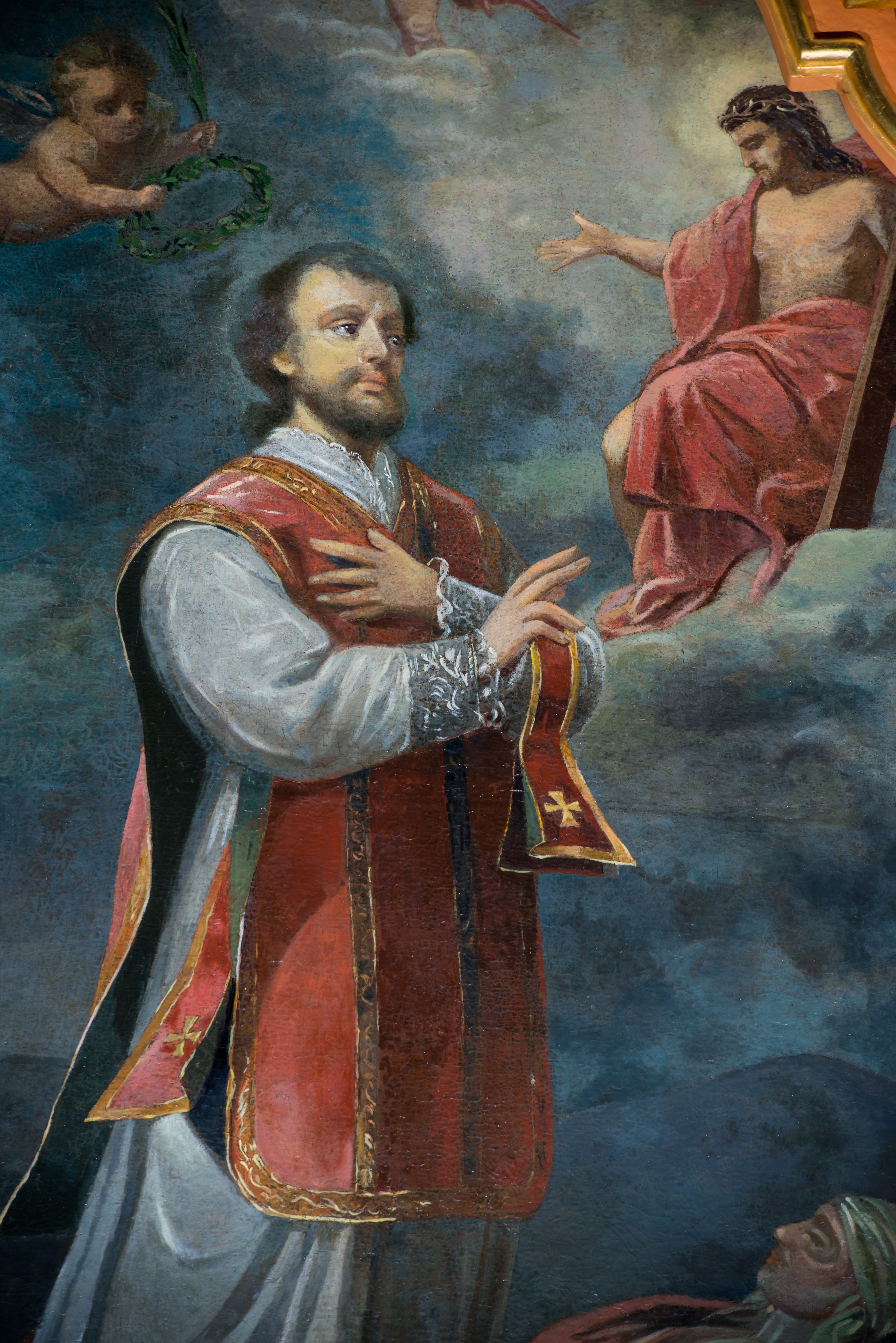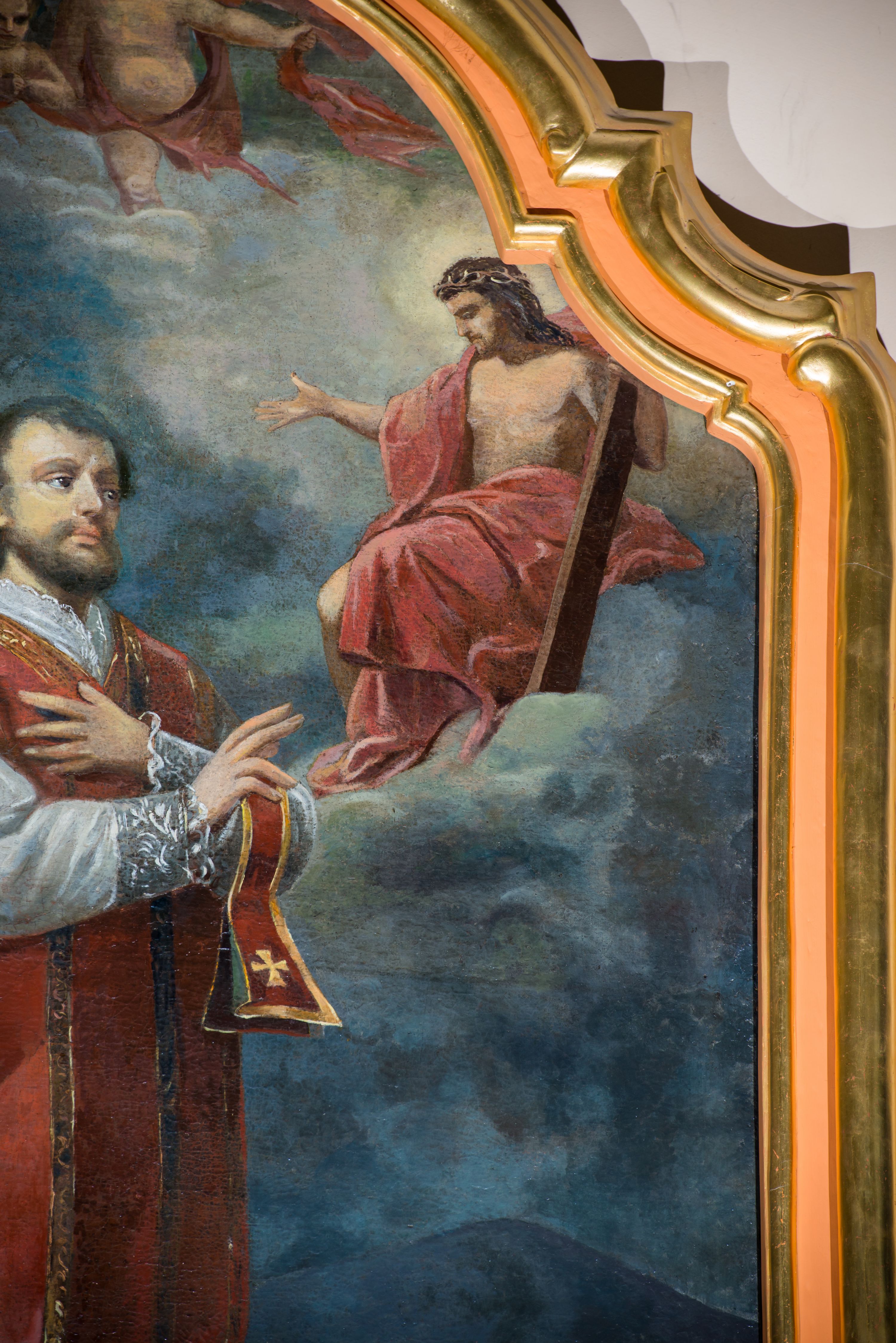 Obraz w kształcie stojącego prostokąta zamkniętego łukiem nadwieszonym z uskokiem. W centrum kompozycji stoi przedstawiony w całej postaci św. Walenty, który spogląda na ukazującego mu się Jezusa, lewą rękę składa na piersi, a prawą wyciąga w geście błogosławieństwa. Ma małą, owalną twarz, z głęboko osadzonymi oczami i małymi ustami otoczonymi wąsami i krótką brodą; włosy krótkie. Jest ubrany w białą albę z pasem koronki na dole i u rękawów i czerwony, lamowany złotem ornat, spod którego wystaje fragment stuły, przez lewą rękę ma przewiązany manipularz. Przed nim, na obłokach tronuje Chrystus ubrany jedynie w czerwony płaszcz. Prawą rękę wyciąga przed siebie, w lewej trzyma widoczny jedynie we fragmencie krzyż, spogląda na świętego. Z lewej strony kompozycji w stronę Walentego zlatuje putto trzymające wieniec z liści laurowych oraz palmę męczeństwa. W łuku zamykającym od góry kompozycję widoczne są dwa kolejne aniołki. U stóp Walentego, na ziemi leży kobieta w białej sukni z owiniętą głową. Jest przykryta czerwonym płaszczem, rękę składa na piersi, ma zamknięte oczy. W tle górzysty krajobraz, powyżej granatowe niebo, rozjaśnione jedynie za postacią Chrystusa. Obraz w złoconej, profilowanej ramie.