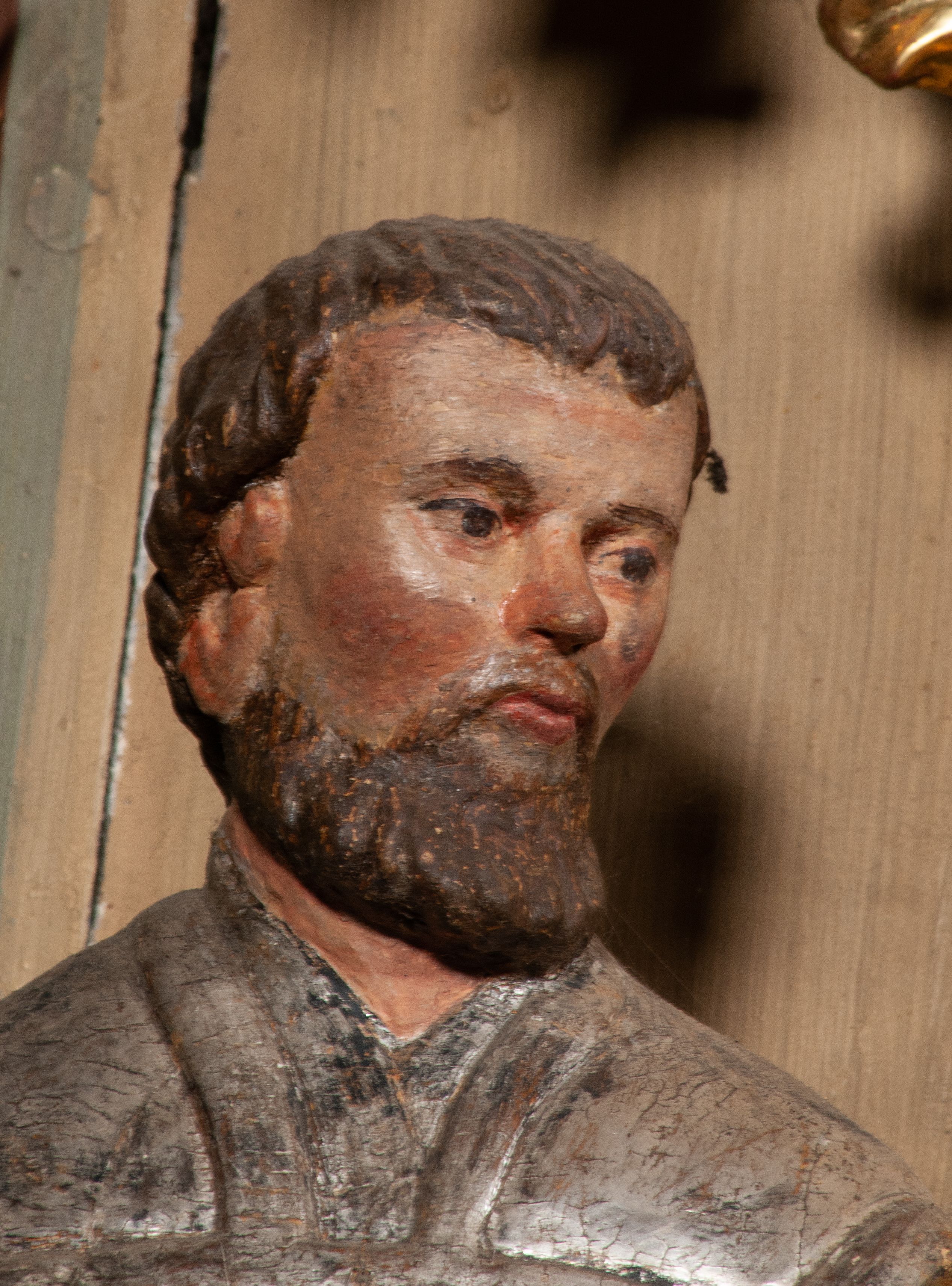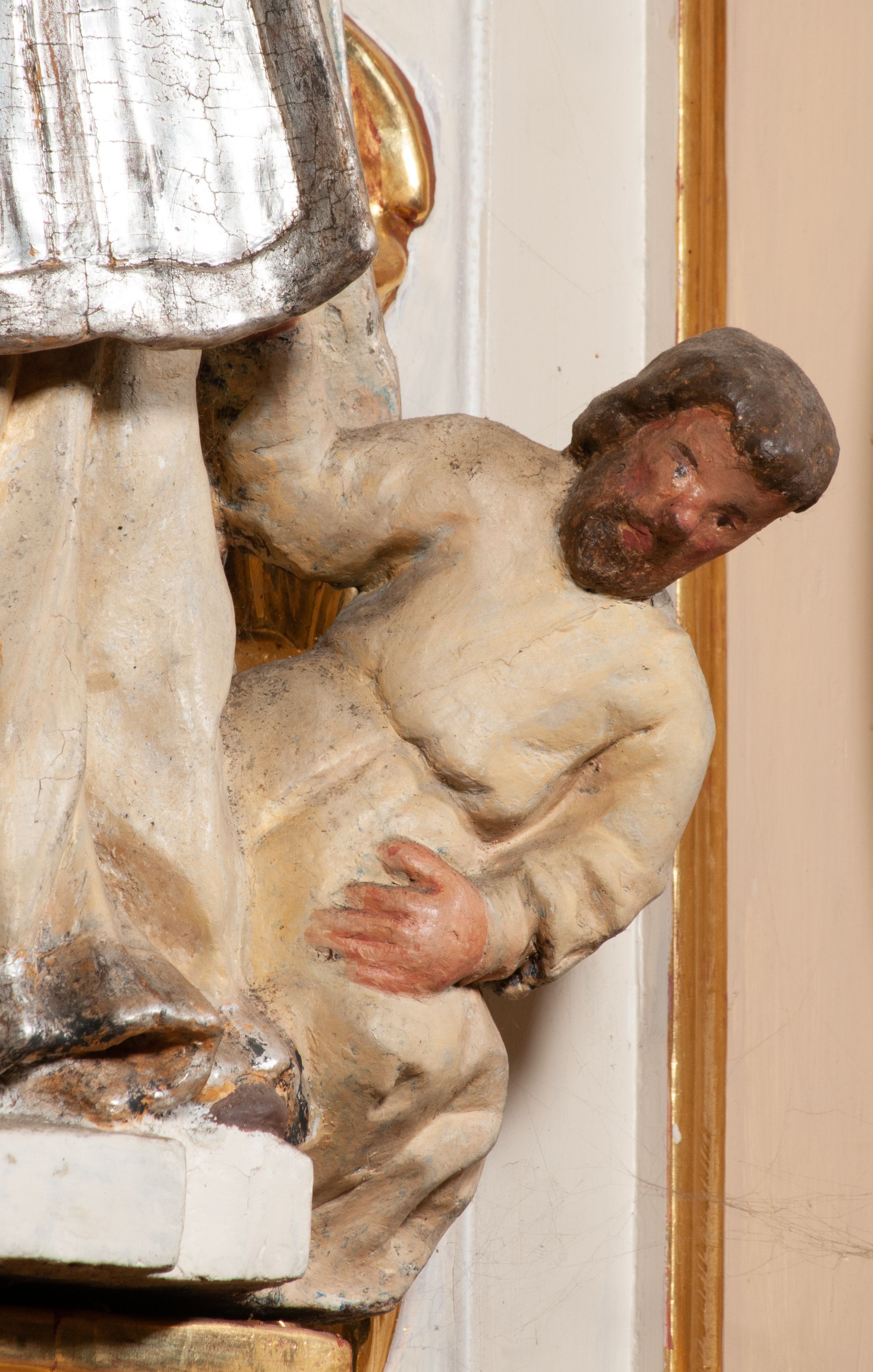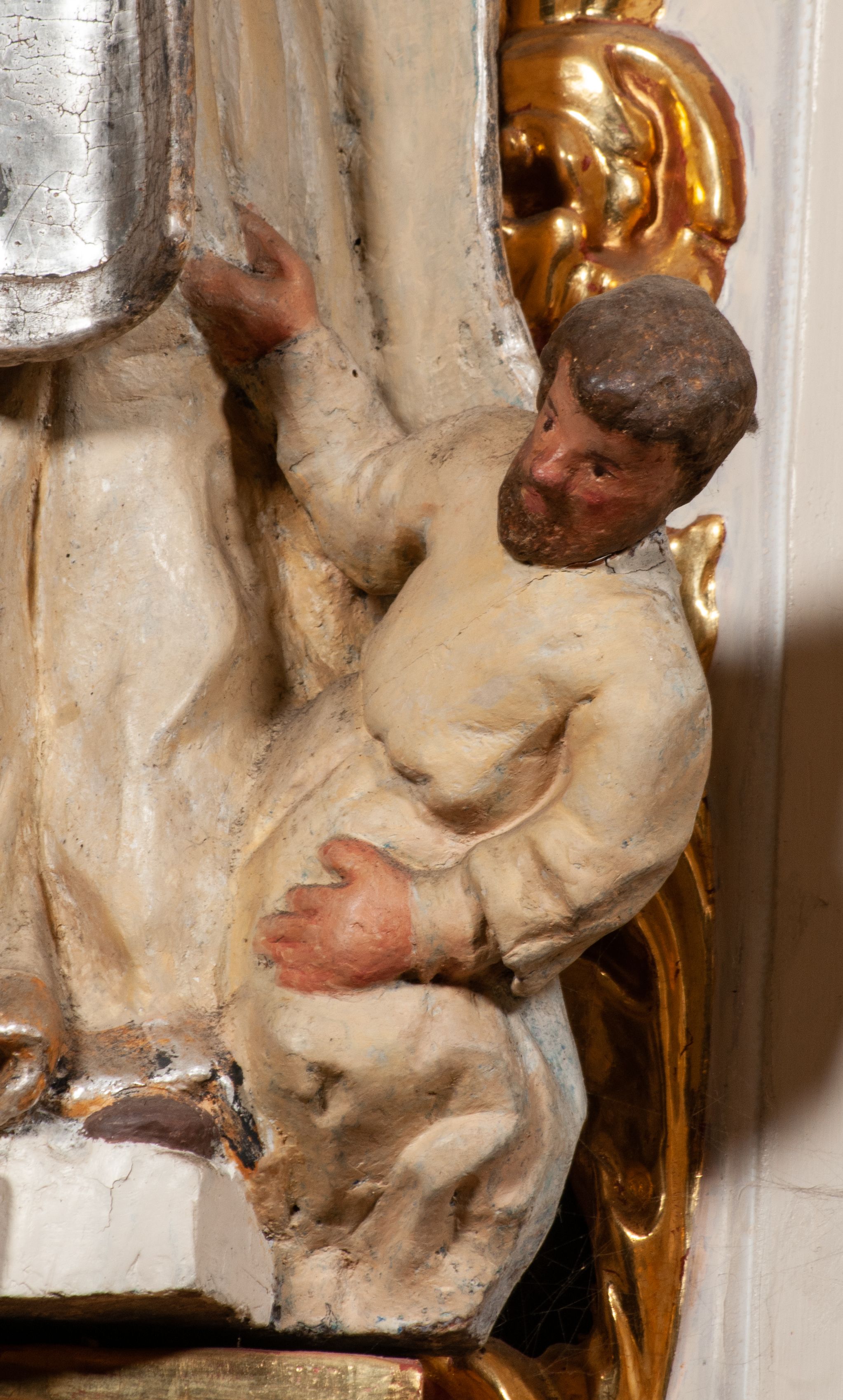 Zabrudzenia i delikatne przetarcia w partii polichromii i srebrzeń.