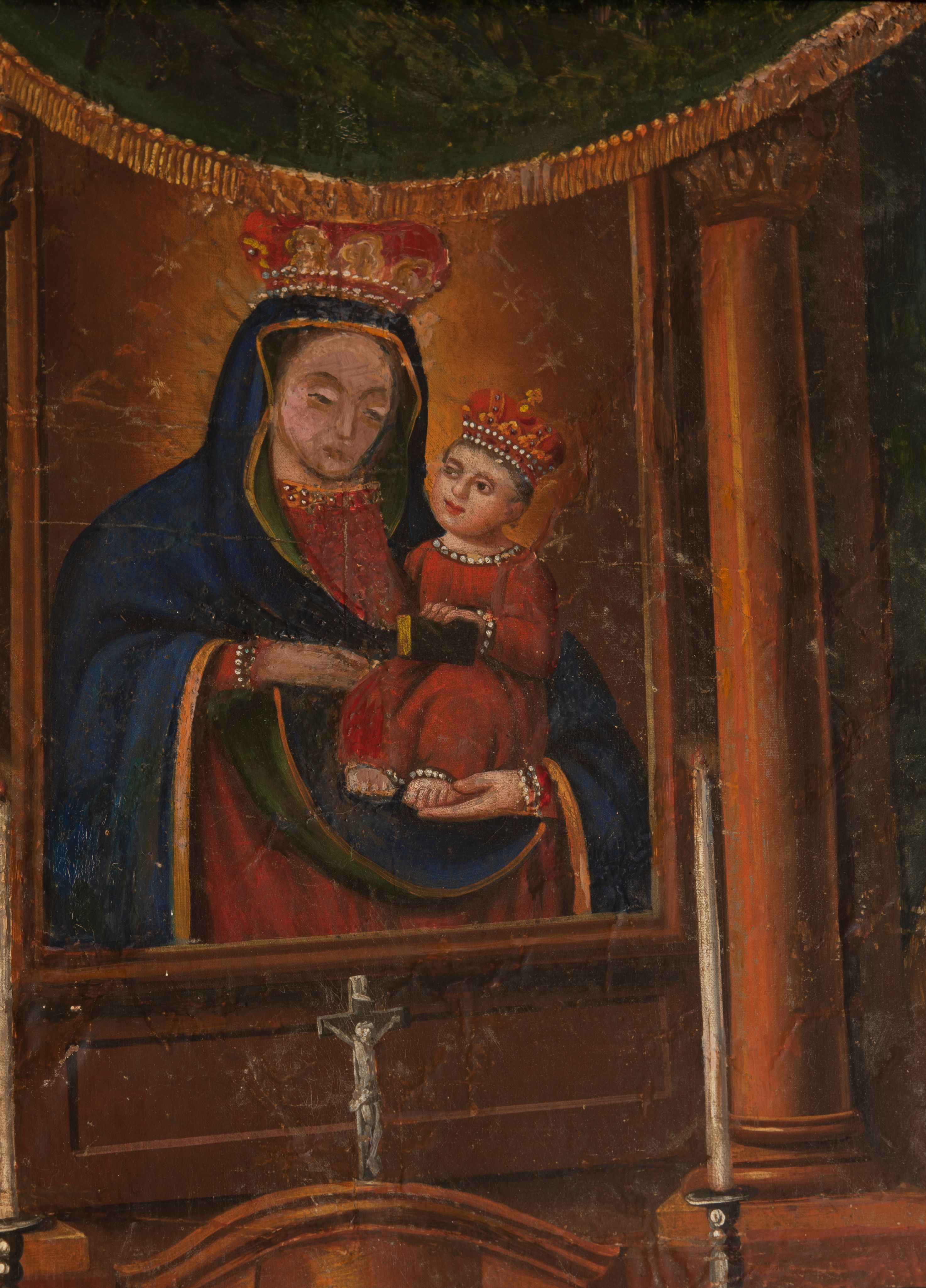 Obraz w formie stojącego prostokąta z przedstawieniem św. Walentego udzielającego ślubu. W centrum święty zwrócony w trzech czwartych w lewo, z pochyloną głową, lewą rękę kładzie na głowie klęczącej przed nim kobiety, prawą unosi w geście błogosławieństwa. Twarz ma pociągłą, o małych oczach skierowanych w górę, prostym nosie i pełnych ustach, okoloną krótkimi, brązowymi włosami i brodą. Ubrany jest w białą albę dekorowaną przy brzegach jasnoróżową koronką oraz w czerwony ornat z pomarańczową kolumną dekorowaną imitacją drogich kamieni, na lewym przedramieniu ma manipularz. Po lewej stronie świętego klęczy kobieta, ukazana z profilu, z rękami złożonymi w geście modlitwy. Twarz ma pełną o długich, jasnobrązowych włosach opadających na plecy. Ubrana jest w różową suknię o niebieskim wzorze roślinnym, wokół szyi ma sznur pereł. Po prawej stronie świętego klęczy ministrant, ukazany w trzech czwartych od tyłu. Ubrany jest w białą komżę. W prawej części obrazu, za klęczącą kobietą ukazany frontalnie mężczyzna, z prawą ręką złożoną na piersi, w lewej trzyma berło. Ubrany jest w zieloną tunikę, zbroję torsową oraz czerwony płaszcz spięty na lewym barku, na głowie ma turban z pióropuszem. Za nim przedstawiona grupa ludzi, w tym trzech niewiast z głowami nakrytymi białymi welonami. Święty ukazany na tle ołtarza z nastawą, ustawionego na dwóch stopniach. Ołtarz nakryty białym obrusem, na nim kielich z palką i otwarta księga, w tle tabernakulum flankowane lichtarzami ze świecami oraz kanony. Nastawa ujęta parą kolumn, w polu obraz Matki Boskiej z Dzieciątkiem, otoczony zieloną tkaniną obszytą frędzlą. W górnej części obrazu, na tle obłoków, nadlatujący aniołek przewiązany niebieską szarfą, trzymający wieniec laurowy i liść palmy. W tle przedstawienia architektura z niszą z konchą.
