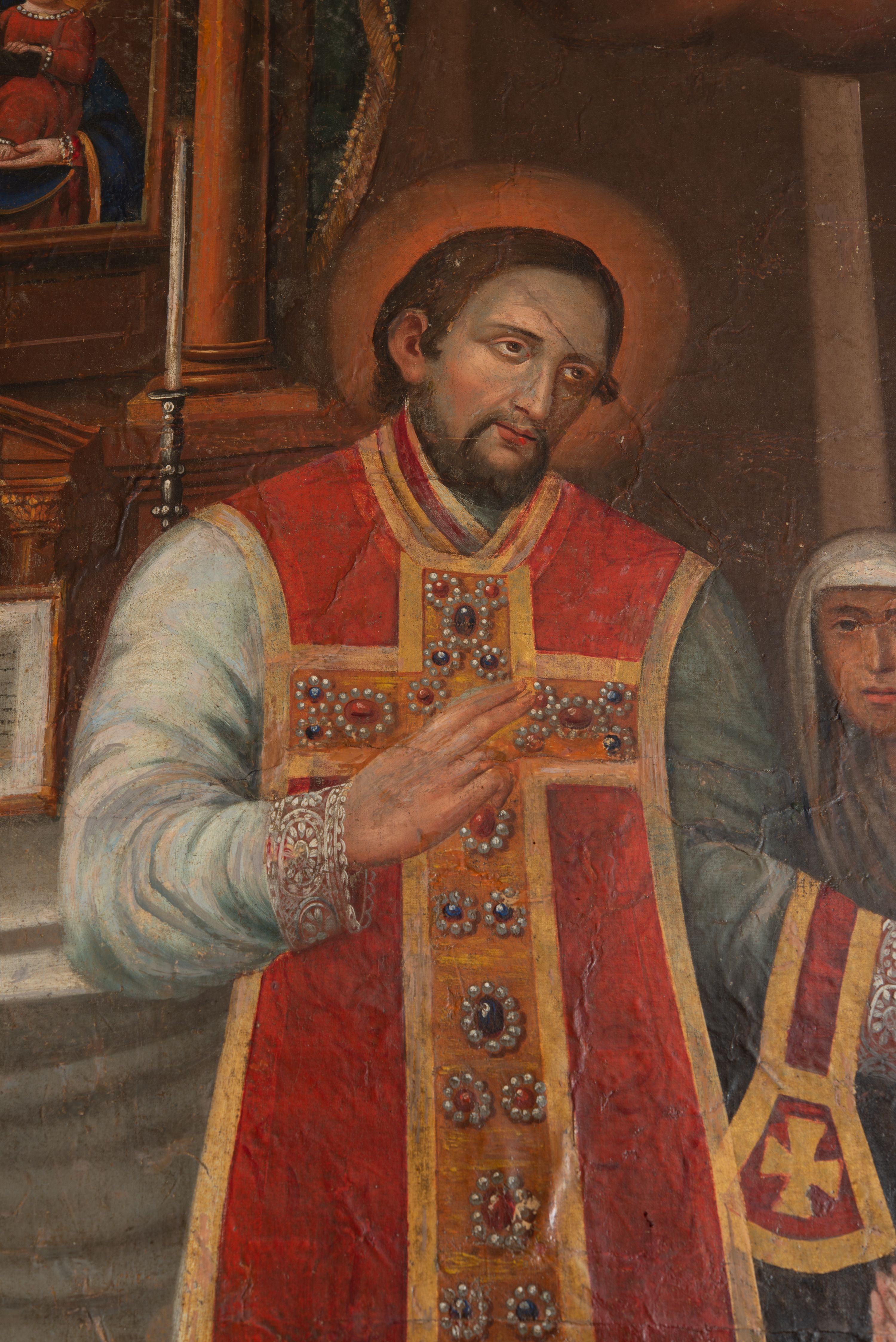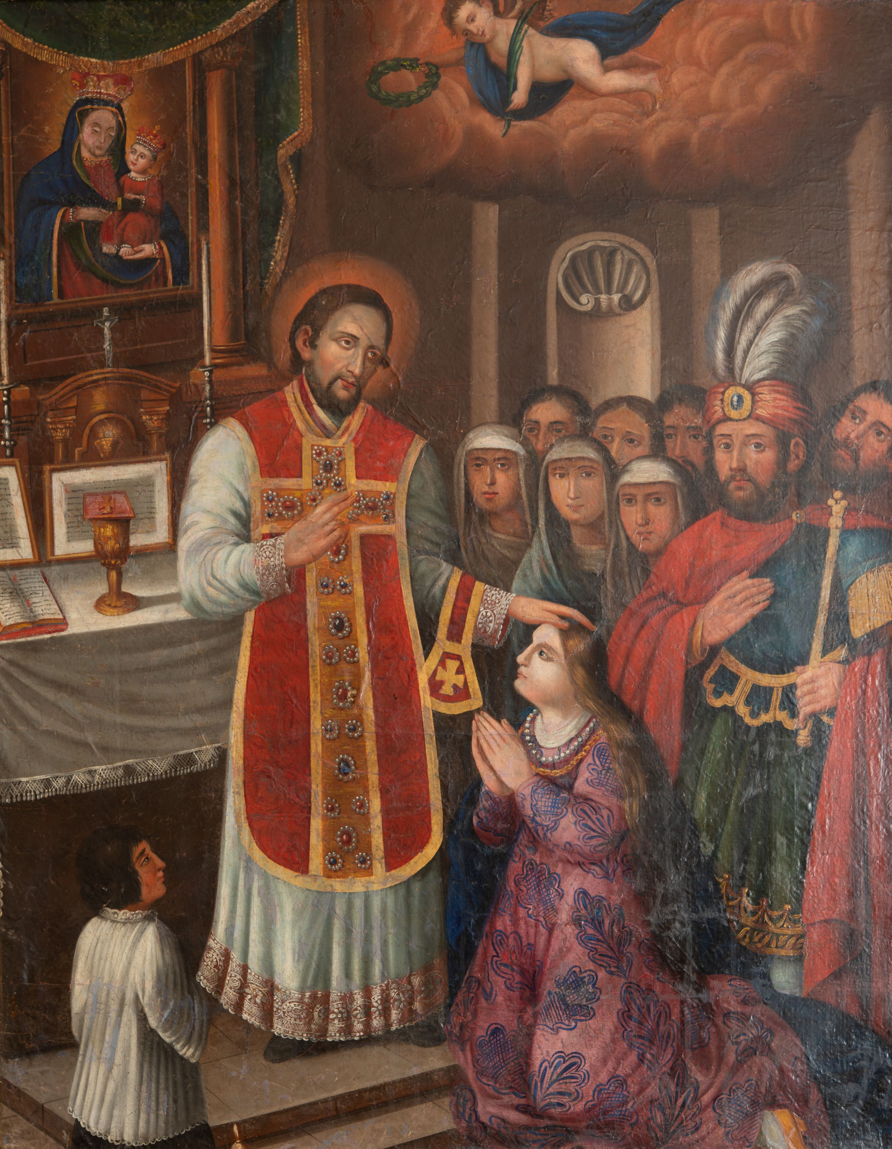 Święty Walenty był biskupem Terni i męczennikiem. Został ścięty w okresie prześladowań chrześcijan na czasów panowania Klaudiusza II Gota. W ikonografii przedstawiany jest najczęściej w stroju kapłana, albie z ornatem. Według jednej z legend święty poniósł śmierć męczeńską, gdyż wbrew zarządzeniu cesarza, zakazującemu zawierania małżeństw żołnierzom, udzielał im ślubów. Tę właśnie scenę ilustruje omawiany obraz.